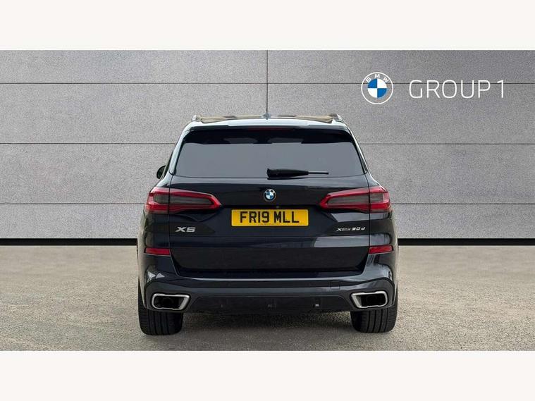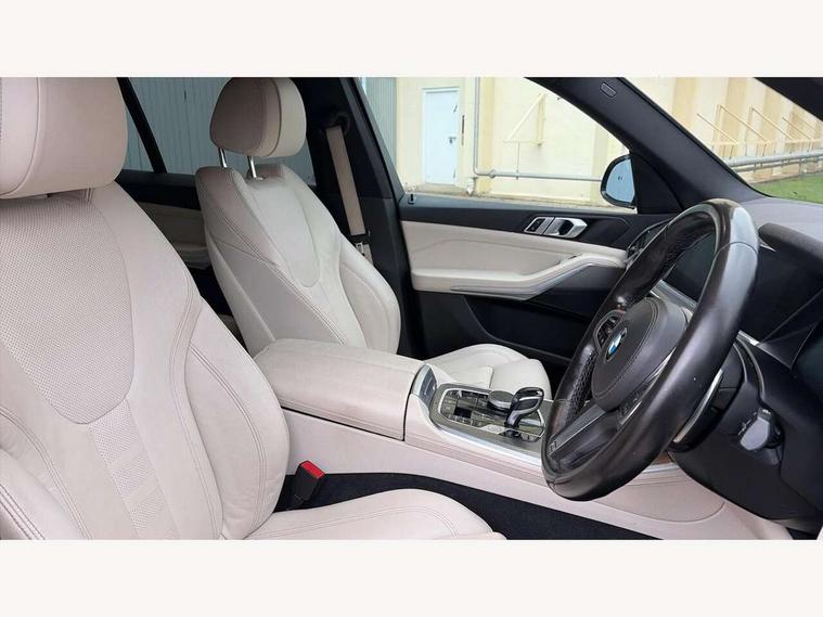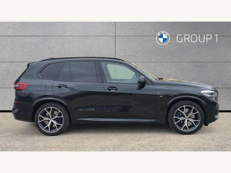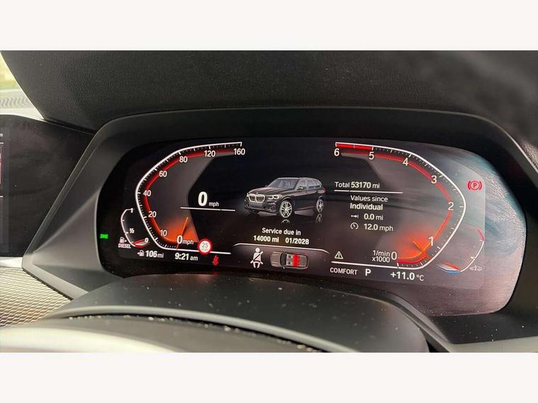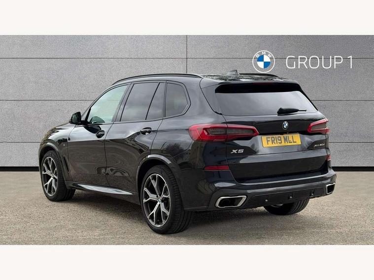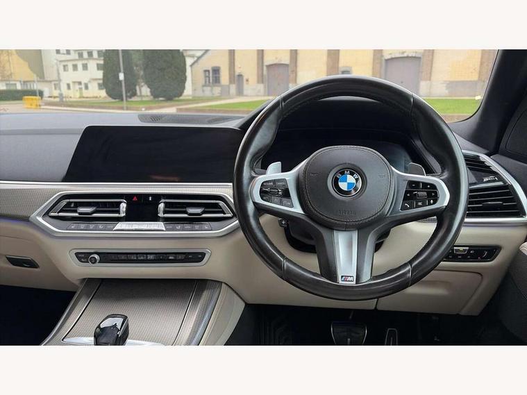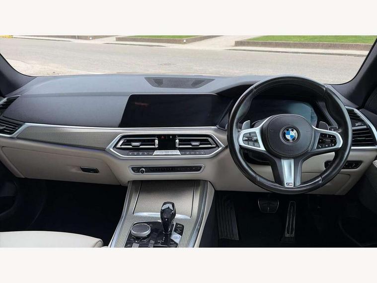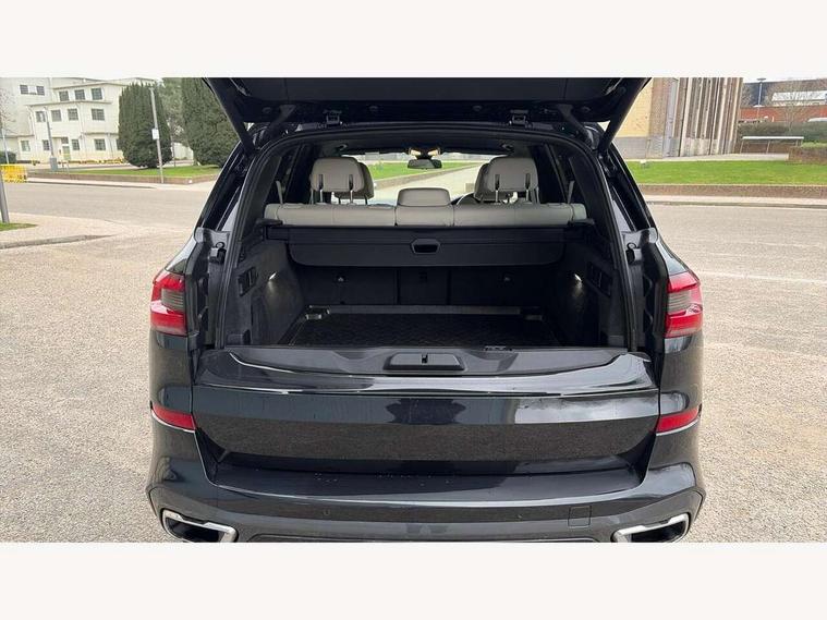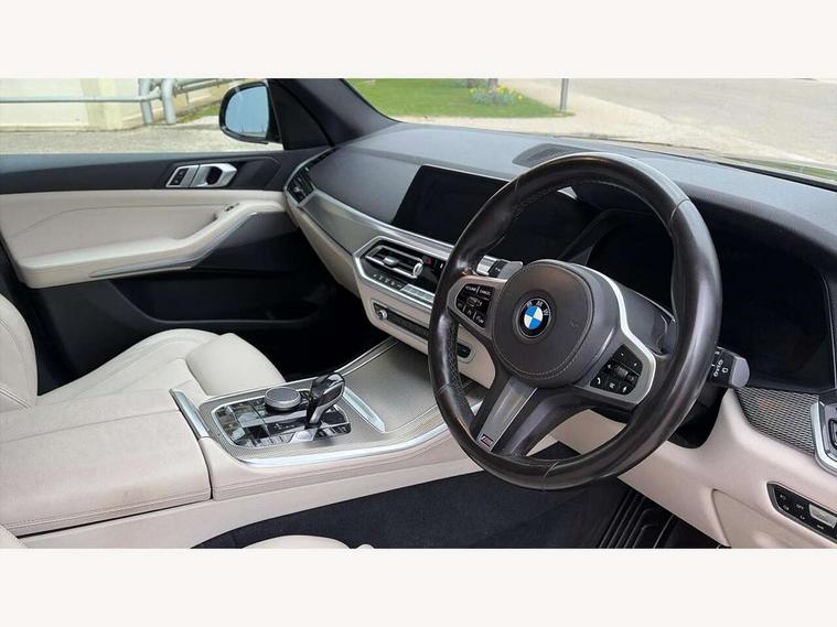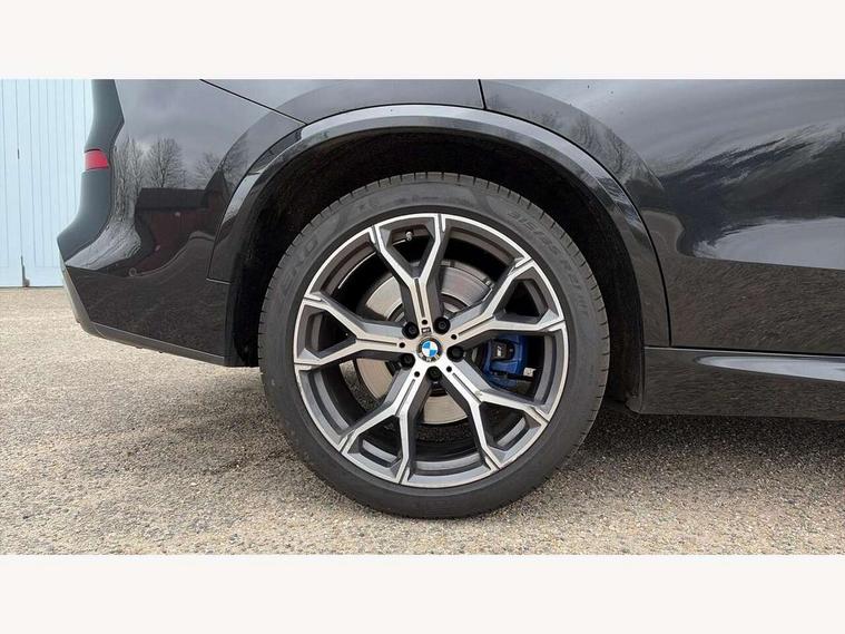 20GB hard disc drive (HDD) memory, Active guard plus, Attentiveness assist, Automatic tailgate with top hinged section open and manual bottom hinged section, BMW digital live cockpit professional - 12.3" digital instrument panel and 12.3" CID, with touch/voice command, BMW legal emergency call, BMW Online services, BMW Teleservices, Brake force display, Brake pad wear indicator warning light, Cruise control with brake assist, Enhanced bluetooth hands free facility with Telephony wireless charging, Front/rear park distance control, iDrive touch controller with shortcut buttons, Lights on warning, Oil sensor for level and grade, On board computer inc. average speed, fuel consumption, liquid crystal Info display, journey computer, outside temperature display, personal profile, Service interval indicator, Speed limiting function, Wi-Fi hotspot, Adaptive 2-axle air suspension, Diesel particulate filter, Double wishbone front axle, Drive performance control with ECO PRO comfort + sport mode, Safety battery terminal clamp, Sport automatic transmission, DAB Digital radio, Favourite buttons, Gesture control for infotainment system, USB connection, USB type A 1.5A in cupholder, USB Type C 3A in centre armrest, Active Air Stream kidney grille with high-gloss chrome, Adaptive air flap control bar in high-gloss black, Automatically dimming rear view mirror, Body colour bumpers, Body colour door handles, Body colour mirror housing, Dynamic brake lights with LED technology, Exhaust tailpipes - single, left and right with Chrome finisher, Follow me home headlights, Front and rear electric windows with open and close fingertip control, anti trap facility and comfort closing, Heat insulated glass, Heated windscreen washer jets, High gloss black outer and central air intakes on front bumper with pearlescent chrome finish, High gloss black Side elements, Intermittent rear wash/wipe, LED daytime running lights, LED fog lights, LED rear lights, M aerodynamic body styling, M designation on left and right front side panels, Pearlescent chrome front grille bars, Rain sensor with automatic headlight activation and windscreen wiper control, Satin aluminium side window graphic, Third brake light in rear spoiler, Welcome light carpet, X5 on left tailgate, xDrive designation on right tailgate, 12V - Power sockets with 2x centre console and 1x luggage compartment, 40:20:40 split folding rear seats, Ambient interior lighting with 6 pre-designed selectable lights including dynamic function, Anthracite headlining, Centre and rear interior light, Child seat ISOFIX attachment with rear outer seats includes top tether, Compartment in front of cupholder, Electric adjustable front seats + driver memory, Electrical steering column with adjustable height and length with activation and control on the steering column, Foldable rear centre armrest with 2 cupholders and storage compartment, Front and rear cupholders x 2, Front and rear door pockets, Front and rear door sill finishers with illuminated BMW designation, Front and rear door sill inlays with illuminated BMW M designation, Front and rear side armrest integrated into door trim, Front footwell lights, Front reading lights, Gearshift paddles on steering wheel, Light inside glove compartment, Lockable glove compartment, Luggage compartment floor panel with integral storage tray, Luggage compartment lighting, M leather steering wheel, M specific key, M specific pedals, M specific steering wheel, M specific velour floor mats, Make-up mirror lights, Multifunction controls for leather steering wheel, Multifunctional hooks, Seat back with flap pocket, Securing rings in luggage compartment, Storage bins on all doors, Storage tray and compartment with cover in centre console, Sunvisors with illuminated vanity mirrors, Toolkit located in luggage compartment, Connected Package Professional - X5, Expanded exterior mirror pack - X5/X5 M, Non-smokers pack - X5, ADB - Automatic Differential Brake, Airbags - driver/front passenger, rear and side, first and second row seats head airbags, front passenger seat airbag deactivation + knee airbag, Anti-lock braking system (ABS), Automatic Stability Control (ASC), Brake drying, Brake energy regeneration, Brake fade compensation, Braking pre-tensioning, Cornering brake control (CBC), Crash sensor activating central locking release, hazard warning lights, fuel cut off, interior lighting + activation of safety battery terminal clamp, Deformation zones - front and rear with door reinforcements and bumpers up to 2.5 mph, DSC - Dynamic Stability Control, Dynamic brake control, Dynamic Traction Control - DTC, Electromechanical parking brake with automatic drive away release and auto hold function, Electronic brake force distribution, Front and rear seatbelts with seatbelt stopper, seatbelt tensioner for front and outer rear seats and belt force limiter, Front head restraints with anti-whiplash, Height adjustable front seatbelts, Hill start assistant, Integrated brake system, M Sport braking system in blue high gloss + blue painted brake calipers with M designation, Mechanical child proof lock on rear doors, Passive protection for pedestrians, Seat occupancy detection for driver and passenger side, Side impact protection, Three 3 point inertia reel seatbelts, Two tone horn, Tyre pressure monitoring system, Ventilated front and rear disc brakes, Warning triangle and first aid kit, Closing system with central locking, Driver and front passenger door centre lock switch, Locking wheel bolts, Remote central locking, Thatcham 1 alarm system with remote control and engine immobiliser, Start/stop toggle diamond shaped trim finisher in pearl chrome,