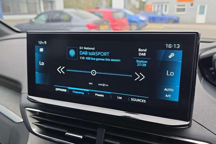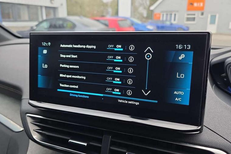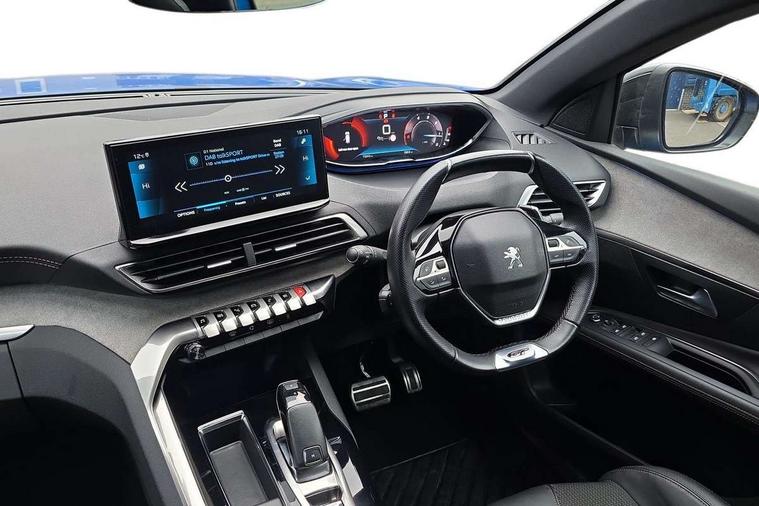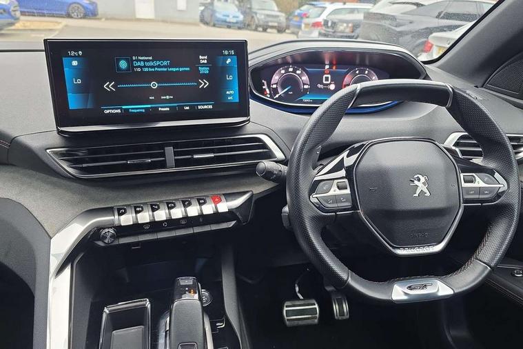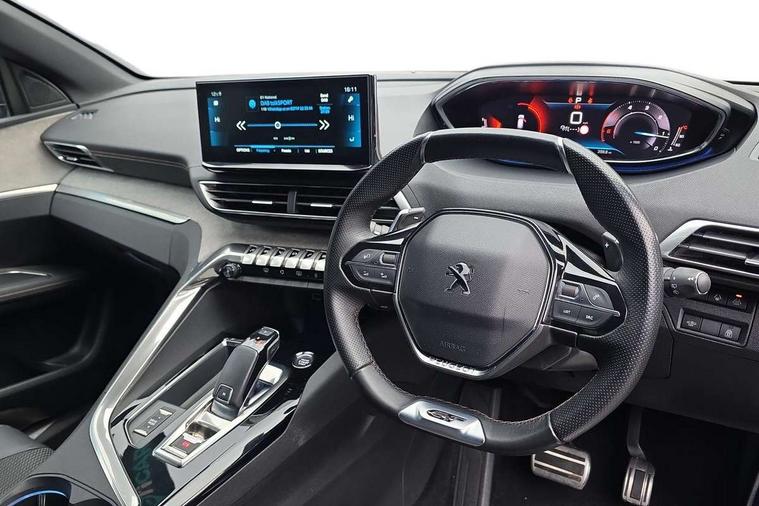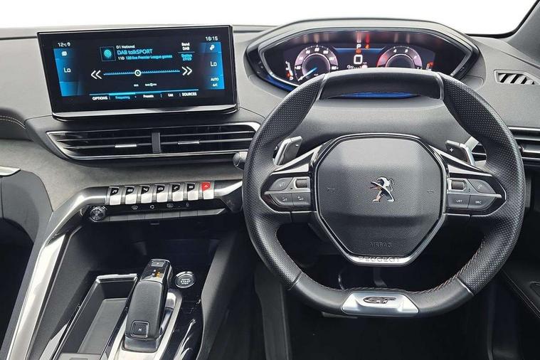 3D connected navigation with 10" HD touchscreen, Bluetooth telephone facility, Drive modes select (Eco, normal and sport), Driving Time Warning (DAA1), Emergency services call system, Extended Traffic sign recognition, Exterior temperature indicator with ice warning, Front parking sensors, Mirror screen with mirror link, apple carplay and android auto, Multi function trip computer, Peugeot connect SOS and assistance, PEUGEOT i-Cockpit with 10" high definition capacitive touchscreen, Peugeot i-cockpit with compact multi-function sports steering wheel, PEUGEOT i-Cockpit with configurable 12.3" Head-up digital instrument panel, Rear parking aid, Rear passenger USB charging sockets (x2) (type A), Speed limit recognition and recommendation, Voice recognition, Dynamic stability control and electronic anti-skid system, Stop/start function, DAB Digital radio, USB socket, Auto self levelling headlights, Automatic triggered rear windscreen wiper in reverse gear, Black with chrome detailed front wing trim, Body colour door handles, Body colour rear roof spoiler with stainless steel edging trim, Body protectors (bottom of front and rear bumpers + wheel arches + protection at bottom of doors) in black, Dark tinted rear side windows + tailgate window, Diamond Black door mirror shells, Door mirror mounted LED courtesy floor lighting, Electric folding door mirrors with exterior courtesy LED lighting, Electric operated/heated door mirrors, Fog Mode, Front windscreen wiper with magic wash cleaning system, Full LED headlights with LED fog lights with static cornering function, Gloss black B and C pillar and aerodynamic deflector trim, Gloss black front bumper air scoops, Gloss black rear cluster connecting strip, Gloss black windscreen trim, GT emblem in satin copper (front wings and tailgate), Headlights left on audible warning, Heated rear windscreen with integrated antenna, LED daytime running lights, LED front indicator, LED rear number plate lighting, LED side indicator lights integrated into door mirrors, LED third brake light, One touch electric front/rear windows with pinch protection, Rear LED Peugeot signature 'Claw Effect' lights, Rear side wing doors, Stainless steel roof arches, Twin exhaust tailpipe, 1/3 to 2/3 split folding rear seats, 12V Sockets in dashboard, rear cabin and load area, 2 cupholders in front centre console, 2 cupholders in rear armrest, 2 x Rear reading spotlights, 2x Rear coat hooks, 3x Isofix child seat fittings in the front passenger and outer rear seats, 4 Grab handles retractable and damped, Aikinite stitching in armrest, gear lever and dashboard facia, Aluminium pedals, Blue ambient lighting for connecting zone, Blue ambient lighting to front door panels, central storage and cupholders, Blue ambient lighting to headup instrument panel, Centre front armrest with butterfly wing opening and illuminated storage compartment, Driver seat manual adjustment (longitudinal and back rest angle), Dual zone automatic climate control, Electric power steering with reach and rake adjustable steering column, Flocked front door pocket interior with blue ambient lighting, Flocked glovebox interior, Foldable front passenger seat with picnic table, Footwell illumination, Front interior light with 2 reading spotlights and rear interior light with timer, Front passenger seat manual adjustment (longitudinal and back rest angle), Front seat back map pockets, Gear shift indicator, Illuminated glovebox, Individual left and right controls in boot for seat folding, LED interior lighting in storage spaces and load area, LED roof interior lighting, Mistral floor mats with Aikinite contrast stitching, Mistral full grain perforated leather steering wheel with aikinite stitch detail and satin chrome 'GT' emblem, Rear bench seat with central armrest and ski hatch, Rear centre console ventilation system, Roof lining - Mistral black, Satin chrome dashboard trim, Satin chrome digital instrument panel and touchscreen trim, Satin chrome front door panel recess trim, Satin chrome interior door handles, Satin chrome scorpion's tail and toggle switch trim, Seatbelt not fastened audible and visual alert for front seats, Seatbelt unfastened on the move audible and visual alert for front and rear seats, Sunvisors with illuminated vanity mirrors, Two position boot floor, Drive assist plus pack - 3008, Driver sport pack - 3008 Auto, Safety plus pack with high beam assist - 3008, Visibility pack - 3008, 3x Rear three-point retractable seatbelts with force limiters in the outer rear seats, ABS (Anti-lock Braking System) with EBD (Electronic Braking Distribution) and EBA (Emergency Braking Assistance), Adaptive driver and front passenger airbags with passenger airbag deactivation function, Driver and front passenger side airbags, Electric child locking functionality on rear windows and doors, Electric parking brake, Front and rear curtain airbags, Front optimised safety headrests and 3 x rear retractable headrests with height adjustable, Front three point retractable seatbelts with pre tensioners and force limiters, Front ventilated disc brakes and rear disc brakes, Hill start assist, Two tone horn, Automatic door locking when moving off, Automatic hazard light activation upon heavy brake application, Electronic immobiliser, key operated exterior door lock from the left hand door, Perimetric and volumetric alarm with lift and tilt sensor, Peugeot Open and Go System, Remote control central locking with two plip keys, Puncture repair kit including compressor, sealant cartridge and towing eye,