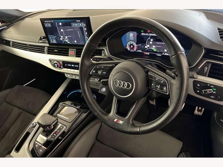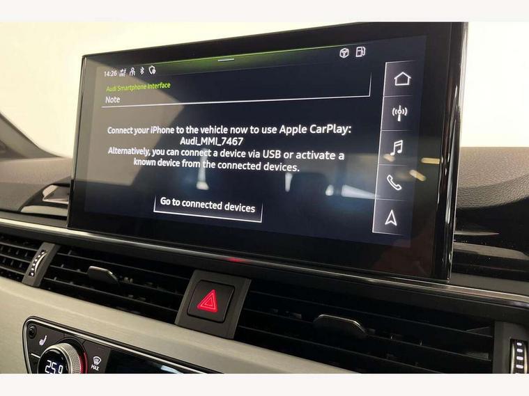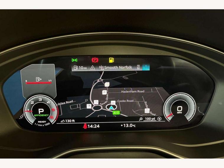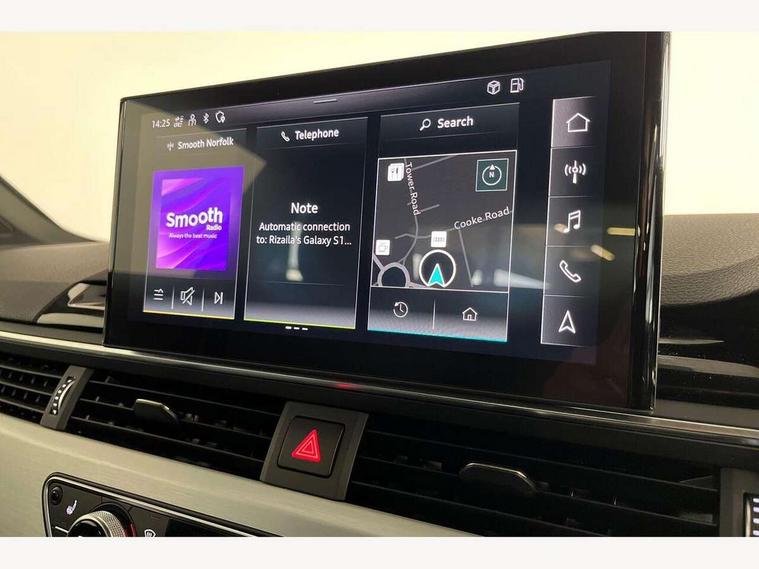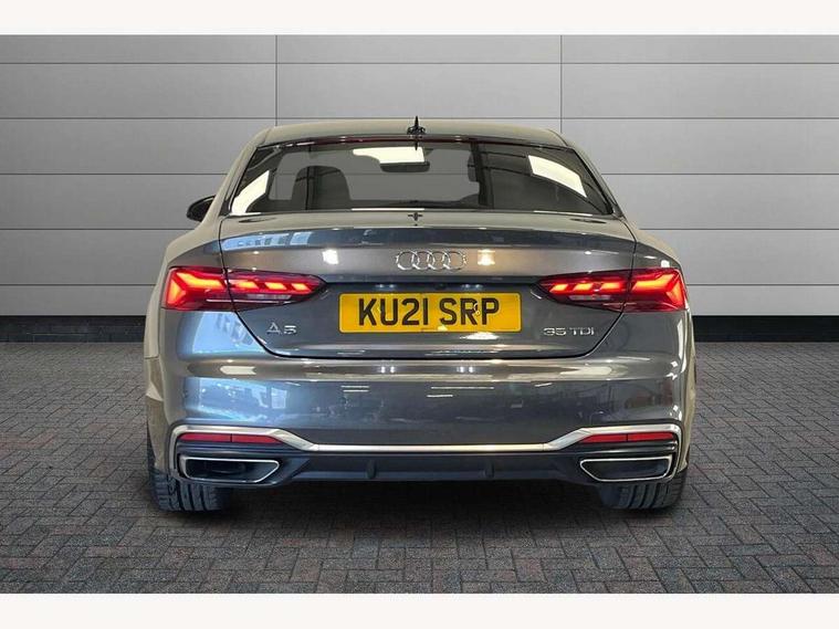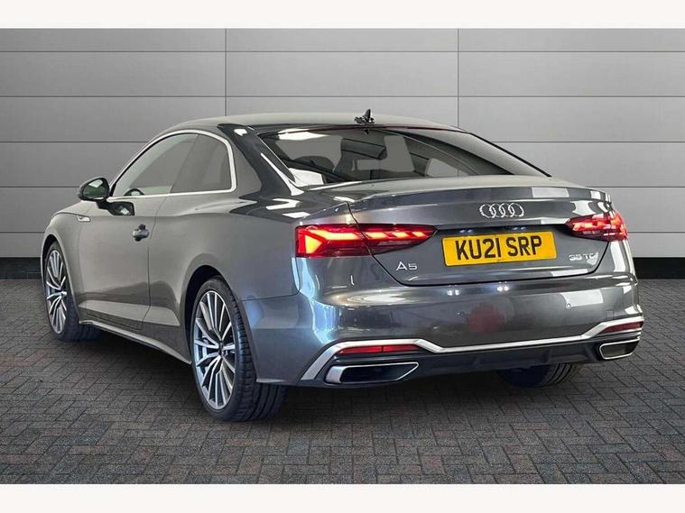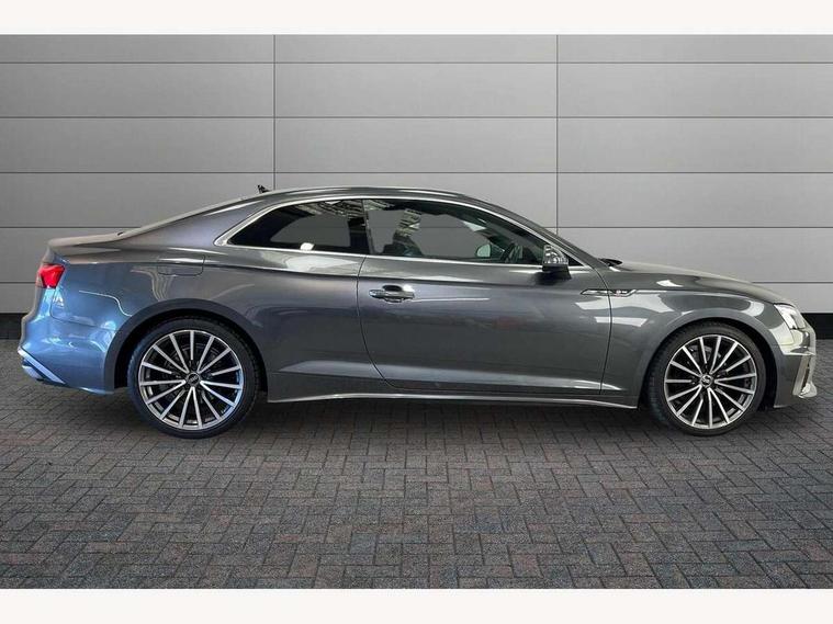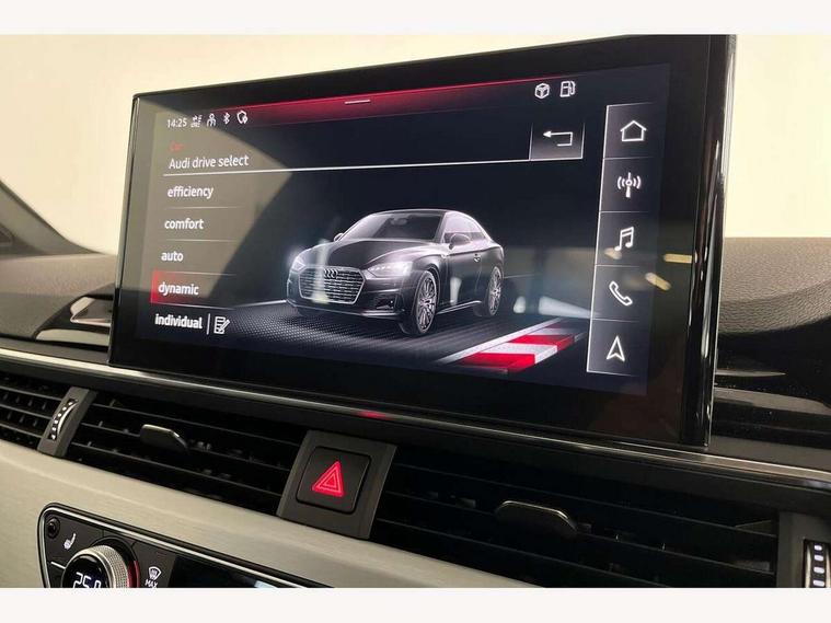 Audi connect safety and service (e-call), Audi connect with Amazon Alexa Integration, Audi drive select (Auto, Comfort, Dynamic, Efficiency and Individual), Audi parking system plus with front and rear sensors, Audi phone box with wireless charging, Audi smartphone interface, Audi virtual cockpit - 12.3" full colour digital instrument cluster, vehicle/engine speed, Radio/media information+Driver assistance systems, Automatic start-stop system with coasting functionality and efficiency programme, Bluetooth interface, Electric boot lid release, Electro-mechanical power steering, Email, calendar and text messages displayed via MMI, MMI nav+ with MMI touch - 10.1" high resolution MMI display, touch sensitive, 3D map, route/country info, dynamic route guide, personal route assist, Rear view camera, Service interval indicator, Voice control system, Diesel particulate filter, Sports suspension lowered by 23mm, 8 passive loudspeakers, CD player, DAB digital radio reception, Two additional USB ports for rear passenger in rear centre console, Two SDXC card slots, Audi matrix LED headlights with LED rear lights + dynamic front and rear indicators, Auto dimming rear view mirror, Body colour bumpers, Body colour door handles, Body colour front spoiler lip, Body colour side sill trim, Body coloured door mirrors, Electric adjustable heated door mirrors, Electric folding door mirrors, Electric front windows, Front fog lights, Honeycomb structure radiator grille in grained matt black, LED daytime running lights, Matt aluminium silver tailpipe trim, Privacy glass, Rain and light sensors, S line badges on front wings, S line front and rear bumpers with side skirts, S Line rear diffuser in matt titanium black with trim strip in matt aluminium silver, Side air inlets in grained matt black with matt aluminium silver inlay, Windscreen with acoustic glazing, 4 way electric lumbar support for driver and front passenger, 40/20/40 split folding 2 seater rear seat bench with rear centre armrest, Adjustable steering column, Black cloth headlining, Black perforated leather gearknob, Contrast stitching on seats, steering wheel and gear lever gaiter, Deluxe 3 zone electronic climate control, Front centre armrest, Front head restraints, Front/rear floor mats, Heated front seats, Illuminated door sill trim with S logo, ISOFIX child seat mounting and top tether, Luggage compartment mat, Manual seat adjustment, Rear headrests, Stainless steel pedals, Sunvisors with vanity mirrors, Tool kit, LED interior light pack - A5/RS5, 2 x 3-point rear seat belts, 6 airbags - Driver, front passenger, curtain and side airbags, Electromechanical parking brake, Electronic Stabilisation Control (ESC) including ABS, ASR and EDL, Front passenger airbag deactivation, Height adjustable front seatbelts, Hill hold assist, Multi collision brake assist, Pop-up bonnet for pedestrian protection, Pre sense city, Seatbelt monitoring, Tyre pressure warning, Variable restraint system, Warning triangle and first aid kit, Anti theft alarm system, Anti theft wheel bolts, Immobiliser, Keyless Go, Remote central locking, Matt brushed aluminium inlays, Tyre repair kit,