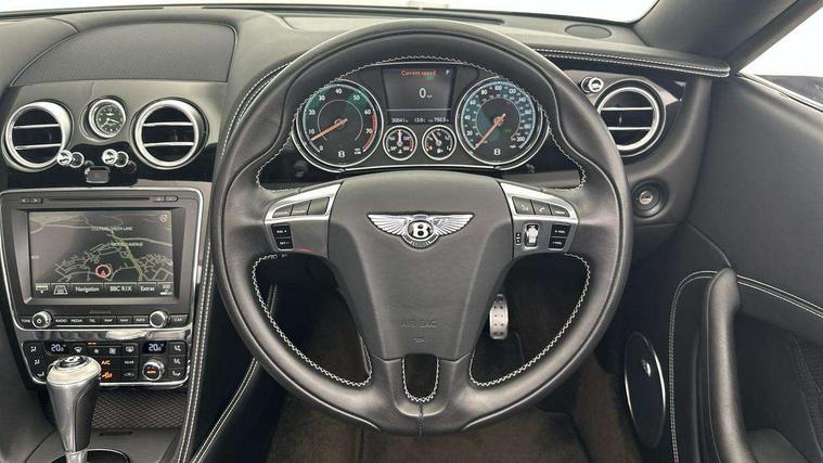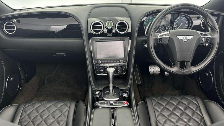 Bluetooth telephone connectivity, Breitling clock, Continuous damping control, Front/rear park distance control, Infotainment system/satellite navigation, Power boot opening and closing, Power latching to all doors for easy entry, Service indicator, Servotronic speed sensitive power steering, Telephone voice dialling, Trip computer, Anti roll bar front and rear, 30gb Hardrive media storage, DVD System, External media interface, iPod connection, Radio/CD, Satellite Radio, Steering wheel mounted controls, Acoustic glazing with infra red reflective, Aluminium bonnet, Bentley 'jewel' fuel filler cap, Bi-Xenon headlights and headlight washers, Body coloured bumpers, Chrome grille, Daytime running lights, Elec/heat/adj/fold door mirror+memory, Electric front windows, Heated rear windscreen, Rain sensor windscreen wipers, Rear diffuser, 14 way Elec adj front seats/memory/lumbar control, Centre armrest with storage box, Diamond quilted hide to seat facings and doors and rear quarter panels, Door puddle lights, Drilled alloy accelerator and brake pedals, Easy entry/electrically adj steering column+memory, Embroidered Bentley emblem in headrests, Footwell illumination, Front head restraints, Full hide trim upholstery, Heated front seats, Illuminated centre console storage, Indented hide headlining, Interior light, Isofix attachments on outer rear seats, Knurled sports gear lever, Multi-zone climate control, Rear armrest, Rear courtesy lights, Rear head restraints, Seatbelts-colour to match hide, Steering column mounted gear shift paddles, Vertical fluted seat style, Anti-lock brakes, Brake assist function, Door open warning light, Driver/front passenger airbag, Drivers knee airbag, Electronic parking brake, Electronic Stability Programme, Emergency brake force distribution, Front and rear thorax airbag system, Front passenger airbag deactivation, Hydraulic Brake Assist (HBA), Seatbelt warning, Side airbags, Traction control, Tyre pressure monitoring system, Alarm/immobiliser, Anti-theft wheel bolts, Auto door lock when driving, Keyless entry, Keyless ignition, Ultrasonic alarm, Embroidered emblems to all head restraints,