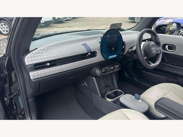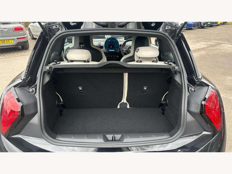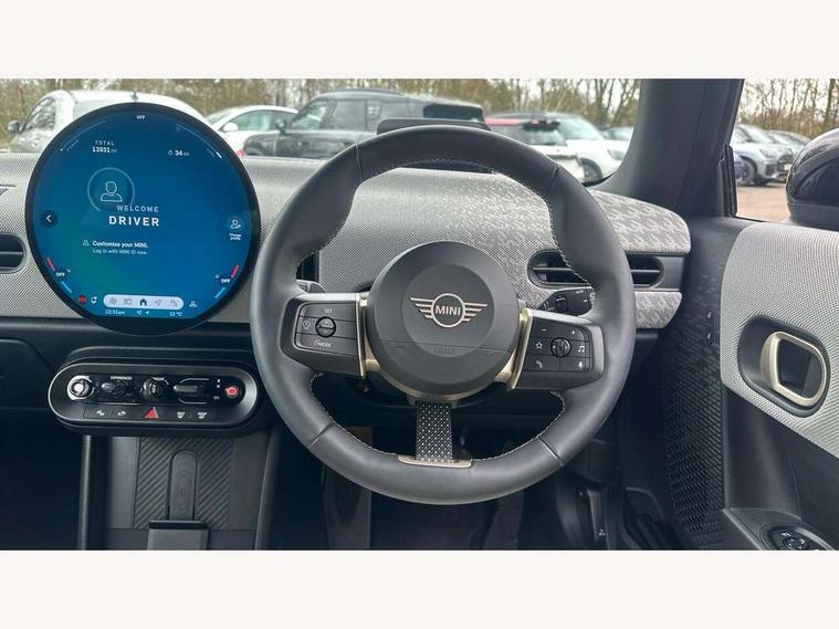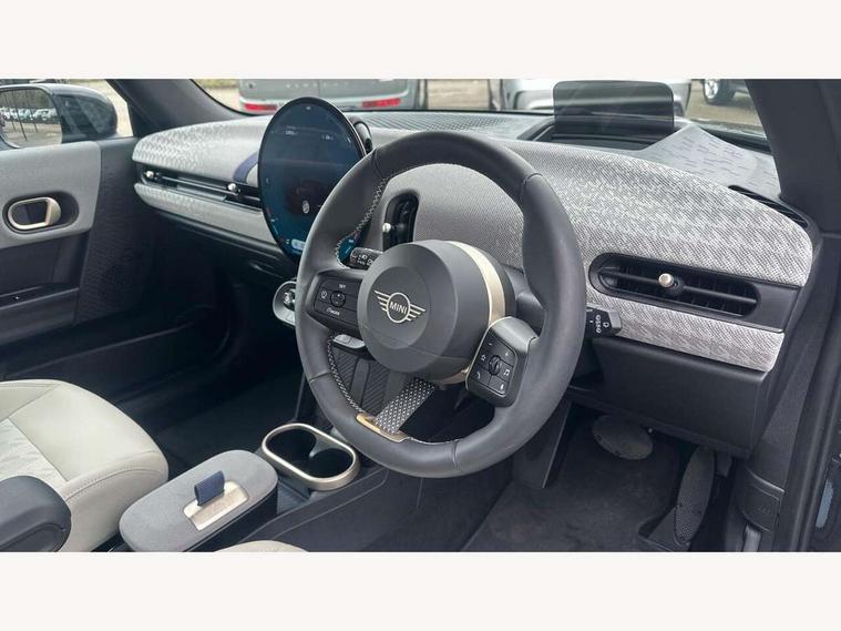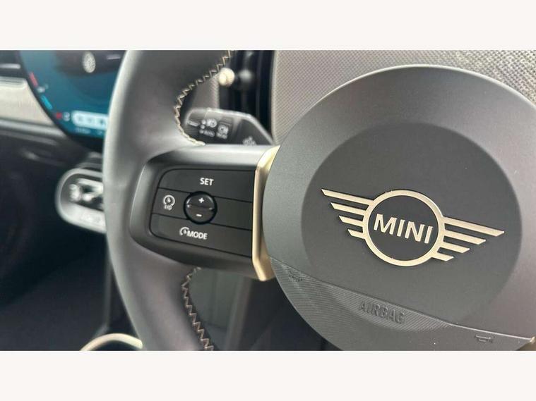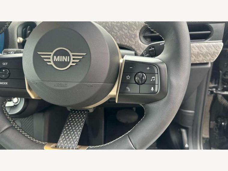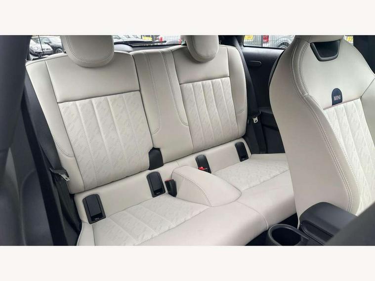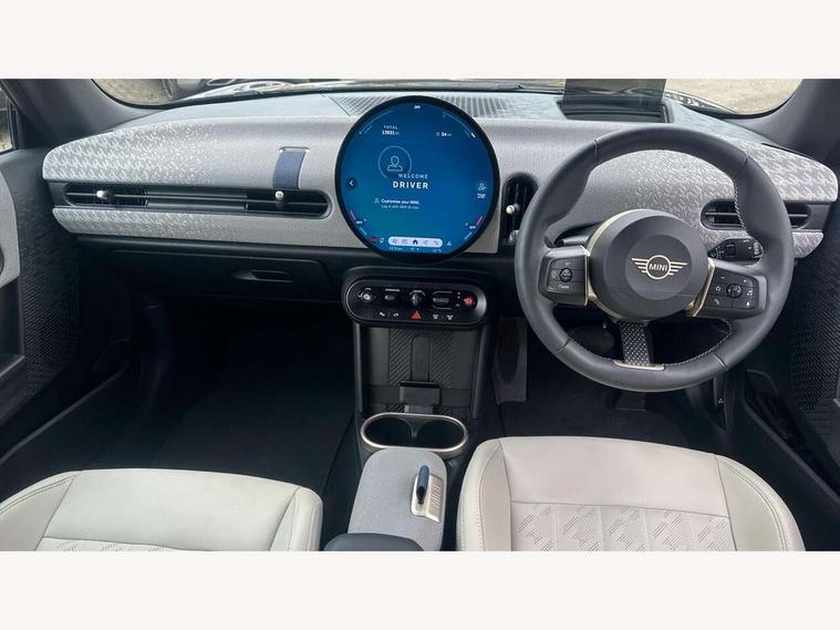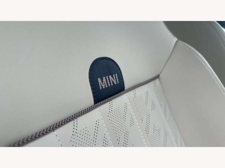 Central toggle bar, Circular OLED Screen, Compatible mobile phone bluetooth with audio streaming, Cruise control, Digital instrument cluster, Electro-mechanical speed dependant steering assistance, Emergency call service, MINI Experience Modes, Mini navigation system, On board computer, Service interval indicator, 7 speed steptronic transmission with double clutch, DAB Digital radio, Personal eSim, Auto headlights, Electric adjustable heated door mirrors, Electric front windows, Heated rear window, Heated windscreen washer jets, LED daytime running lights, LED Headlights, LED indicator lights, LED rear lights, Logos in Vibrant Silver, Rain sensor window wipers, Rear fog lights, Rear window wiper, Vibrant silver grille surround, 2 seat bench in second row, 2 zone automatic air conditioning, 60/40 rear seat bench, Ambient lighting, Cupholders, Dark headliner, Floor mats, Front and rear head restraints, Front compact armrest, Heated steering wheel, Height adjustable passenger seat, Lidded storage box in grey knit, Luggage compartment lighting, Single front passenger seat, Sport Vescin Steering Wheel black with vibrant silver accents, Sunvisors with vanity mirrors, Vescin synthetic leather upholstery, Driving assistant pack - Cooper Hatchback, Park assistant pack - Cooper Hatchback, 3 point seatbelts on all four seats, 6 Airbags - front, side, head and seat belt tensioners, Acoustic pedestrian protection, Anti-lock braking system (ABS), DSC - Dynamic Stability Control, Electronic parking brake, Front and rear disc brakes, Front ISOFIX (iSize), Front passenger airbag deactivation, Traction control, Tyre pressure monitoring system, Alarm, Immobiliser, Remote central locking, Blue decorative dash strap, Light Beige/Grey dash knit, Tyre repair kit,