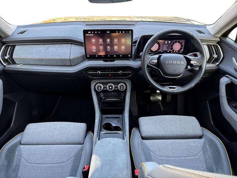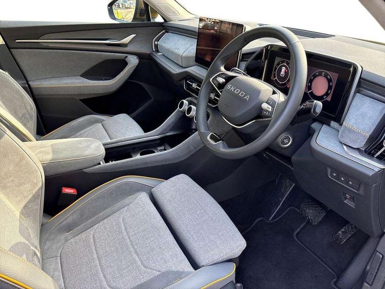 13" satellite navigation touchscreen display, Blind spot detection with door exit warning, Bluetooth system, ChatGPT functionality, Driver alert - Fatigue and drowsiness monitor, Dry display cleaner, Emergency call, Front and rear parking sensors, Front cross traffic assist, Lane assist, PAS, Rear traffic assist, Rear view camera, Tailgate unlocking from outside, Traffic sign recognition, USB C Port x 2 in front centre console, Virtual Cockpit - 10.25" digital display, Voice control system, Wireless charging for two smartphones (15W) with cooling function, Wireless SmartLink for Apple CarPlay and Android Auto, Stop/start function, 2x USB-C in the rear, 8 Speakers, DAB Digital radio, Aero front windscreen wipers with intermittent function, All weather light, Auto dimming rear view mirror, Black wheel arch surrounds, Body colour bumpers, Body colour door mirrors and handles, Cornering light and poor weather light, Electric folding /adjustable/separted heated/folding door mirrors, auto dimming with boarding sports and memory function, Electric front and rear windows, Exterior black decorative trims, Heat insulating glass in windshield, Heated rear window, Ice scraper in fuel tank cap, Invisible tailpipe, LED daytime running lights, LED front fog lamps, LED Headlights, LED rear fog light, LED rear lights, LED third brake light in rear spoiler, Light assistant with automatic headlight control and coming home feature, Logo projection in door mirrors, Rear roof spoiler, Rear side wing doors, Rear window wiper, Safety reflectors on front and rear doors, Unique dark chrome design logo on alloy wheels, Window control switches with black trim, Windscreen wipers with rain sensor, Without engine designation, 1.5l bottle holder points in all door, 1x centre rear reading light, 2 seat bench in 3rd row, 3 configurable smart dials with 32mm coloured display, 3 seat bench in 2nd row, 4 foldable roof handles with rear coat hooks, Ambient interior lighting - Dashboard, front-door stowage compartments, front and rear door panels and footwell lighting, Automatic gear selector on steering column, Chrome interior door handles, Driver/front passenger reading lights, Fabric headlining, Fixed bench 40:60:40 split folding backrests, Front and rear floor mats, Front centre armrest with jumbo box storage compartment, cup holder and 12V socket, Height adjustable front headrests, Isofix child seat fittings in outer middle row rear seats and front passenger with top tether, Manual height adjustment for front passenger seats and thigh support extender, Manual lumbar support for front passenger seat, Manually adjustable steering column, Pollen filter, Rear centre armrest with cupholders, Rear seat boot backrest release, Single front passenger seat, Skoda lettering on steering wheel, Storage pocket including mobile phone pockets on the backs of the front seats, Sunvisors with illuminated vanity mirrors, Three rear height adjustable headrests, Ticket holder on A Pillar, Tri zone climate control, Umbrella in door panel x1 made from sustainable materials, Upper and lower glovebox with card holder and coin compartment, USB C port by rear view mirror for charging only (15W), Variable boot floor, Auto door release and activation of warning lights in the event of an accident, Driver and front passenger airbag with knee airbag and front passenger airbag deactivation, Electric child locks, Electronic parking brake, ESC (incl. ABS+EMD+MSR+ASR+EDL+HBA+DSR+RBS+ESBS+MCB+TSA+XDS), Front assist with braking reaction to vehicles, pedestrians and cyclists, Front disc brakes, Fuel cut off safety device, Height adjustable front 3 point seatbelts + pretensioners, Hill hold assist, Junction assist with automatic emergency braking, Rear disc brakes, Safety vest holder in door, Seat belt reminder for all seats, Three point rear seat belts, Two tone horn, Tyre pressure monitor, Alarm with interior monitoring and tilt sensor with safe function, Anti-theft wheel bolts, Immobiliser, Remote central locking with 2 keys, Breakdown kit, Tool kit,