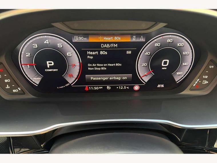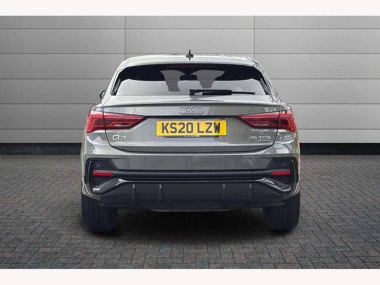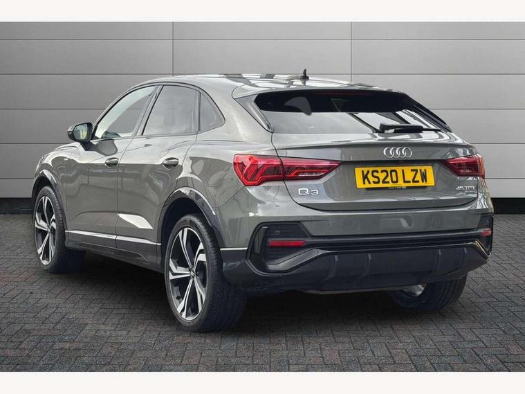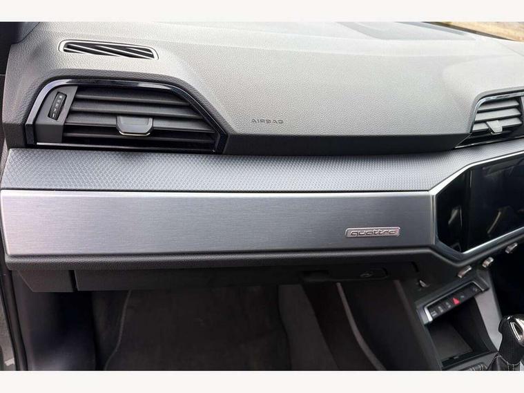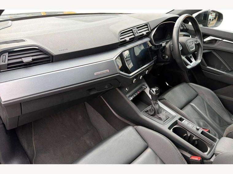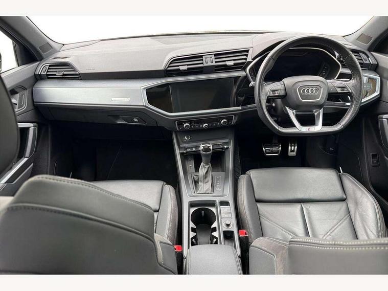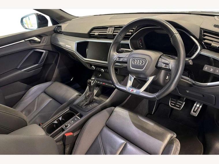 Audi connect safety and service (e-call), Audi drive select, Audi lane departure warning, Audi side assist, Audi smartphone interface includes wireless Apple carplay/Android Auto, Audi virtual cockpit plus, Bluetooth interface, Camera based traffic sign recognition, MMI Navigation Plus with high resolution 10.1 inch touchscreen colour display, Power operated tailgate, Progressive steering, Service interval indicator, Start stop system with recuperation, Voice control system with natural language interaction, Sports suspension, 1 x USB type C and 1 USB type A charging points, 6 passive loudspeakers, DAB digital radio module, Acoustic windscreen, Audi Beam uses LEDs to project the Audi Sport logo, Auto dimming frameless rear view mirror, Diffuser grille in grained matt black, Diffuser trim in selenite silver, Electrically folding, adjustable and heated door mirrors with integrated LED side indicators and kerb view function for passenger side, Front and rear electric windows, Front fog lights, Front underbody protection in manhattan grey paint finish, Grille surround in aluminium silver matt, Headlight washers, High gloss black finish B and C pillars, Matrix LED headlights with LED rear lights and dynamic front and rear indicator, Privacy glass dark tinted rear and rear-side windows (from B-pillar backwards), Rain and light sensors, Rear underbody protection in matt black, Side skirt insert in matt Platinium grey, 12V socket in rear centre console, 3 spoke flat bottomed high multi-function leather sport steering wheel with gearshift paddles, 4 way electric lumbar support for driver and front passenger, 40:20:40 folding with manual adjustment for 60:40 forwards/backwards position and backrest angle, Adjustable rear seat bench/backrest with centre armrest and cupholder, Black cloth headlining, Dual zone electronic climate control, Electrically adjustable front seats, Front and rear black floor mats with contrast stitching, Front and rear headrests, Front and rear roof module including reading lights, Front centre armrest, Glove compartment lighting, Heated front seats, Height and reach adjustable steering wheel, Illuminated door sill trims with S logo, ISOFIX child seat mounting for front passenger with airbag deactivation and outer rear seat including top tether attachment point for outer rear seats, Luggage compartment light, Perforated leather gearknob, Stainless steel luggage compartment sill finisher, Stainless steel pedals, Black styling pack - Q3, Multi coloured extended ambient interior lighting pack - Q3, Non smoking pack - Q3, 3x3 point rear seatbelts, 6 airbags - Driver, front passenger, curtain and side windows, Audi pre-sense front with pedestrain and cyclist recognition, Electrically operated child locks on rear doors, Electromechanical parking brake, Electronic stabilisation control including ABS, ASR and EDL, Hill descent control, Hill hold assist, Pre sense basic, Seatbelt monitoring, Tyre pressure warning, Warning triangle and first aid kit, Anti theft alarm, Anti theft wheel bolts, Remote central locking, Dark matt brushed aluminium inlay, Detail dashboard around MMI touch colour display in glass look, black with surround in aluminium look, Leatherette door armrest,