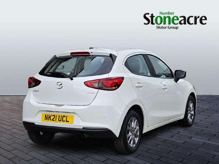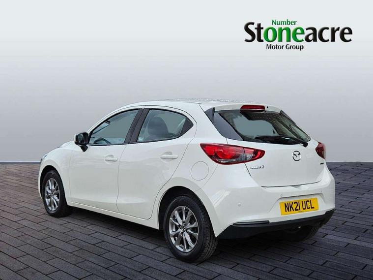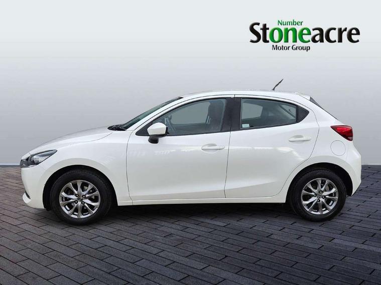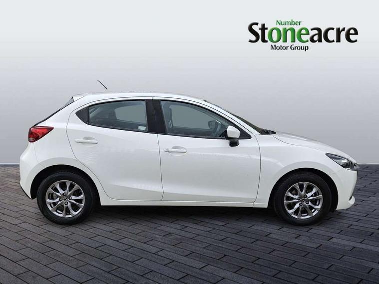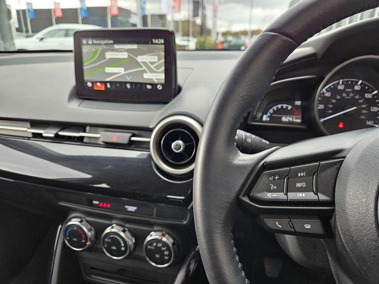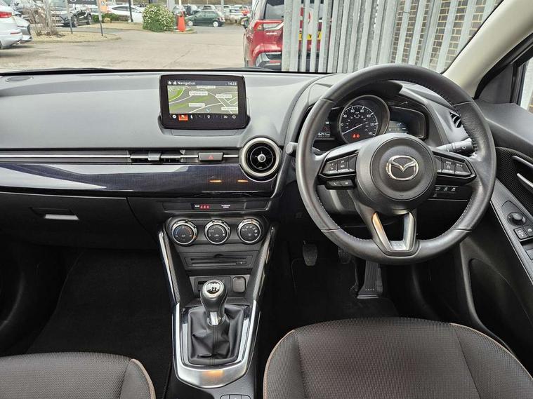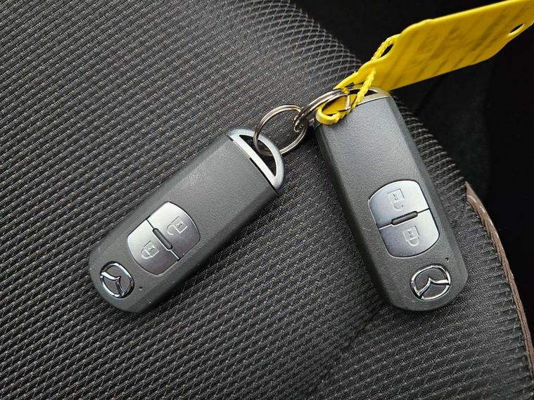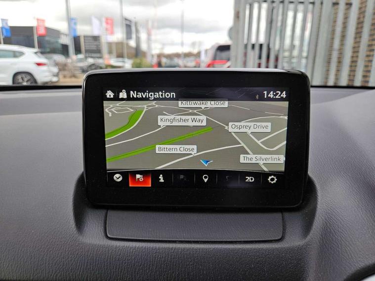 Adjustable speed limiter, Analogue speed display meter, Apple car play/Android Auto, Cruise control, Digital instrument cluster, Emergency stop signalling system, Integrated bluetooth with hands-free calling, bluetooth audio and easy access to phone contacts, Lane departure warning system, Lane keep assist, Mazda connect with 7" colour touch screen, Multimedia Commander, Navigation system, PAS, Rear parking sensor, Service indicator, Trip computer, i-stop, 2 USB interfaces and Aux-In jack, Audio system with 6 speakers with 2 in driver headrest, AM/FM/DAB radio and single CD/MP3, Steering wheel mounted audio/bluetooth controls, Auto dimming rear view mirror, Black front grille, Black front lower bezel, Black rear lower bezel, Body coloured bumpers, Coming/leaving home lighting function, Dusk sensing headlights, Electric adjustable/heated/folding door mirrors, Electric front/rear windows with one touch, Halogen daytime running lights, LED Headlights, LED indicator lights, LED third brake light, Rain sensing front wipers, Rear wiper, 60/40 split rear seats, Climate control air conditioning, Cloth upholstery, Driver, Front passenger and two rear grab handles with coathooks, Drivers seat manual slide recline and height adjustment, Drivers/front passengers covered vanity mirrors and drivers ticket holder, Folding rear seats, Front head restraints, Front passenger and driver door pockets, Front passenger seatback pockets, Gear shift indicator, Glovebox, Interior courtesy light with integrated spotlight, ISOFIX child seat anchorage points attached on outer rear seats, Leather handbrake, Leather steering wheel and gear knob, Luggage compartment light, Passenger seat manual slide and height adjustment, Three height adjustable rear head restraints, Tilt/telescopic adjustable steering wheel, 3 point seatbelts on all seats, Anti-lock braking system (ABS), Collision mitigation braking system, Dual front airbags, Dynamic stability control + Traction control, ESP, Front and rear curtain airbags, Front driver, passenger and rear seat seatbelt warning, Front side airbags, Front smart city brake support, G-Vectoring control plus, Hill hold assist, Passenger airbag cut-off switch, Tyre pressure monitoring system, Alarm, Immobiliser, Remote central locking, Black dashboard, 15" Alloy wheels, Emergency tyre repair kit,