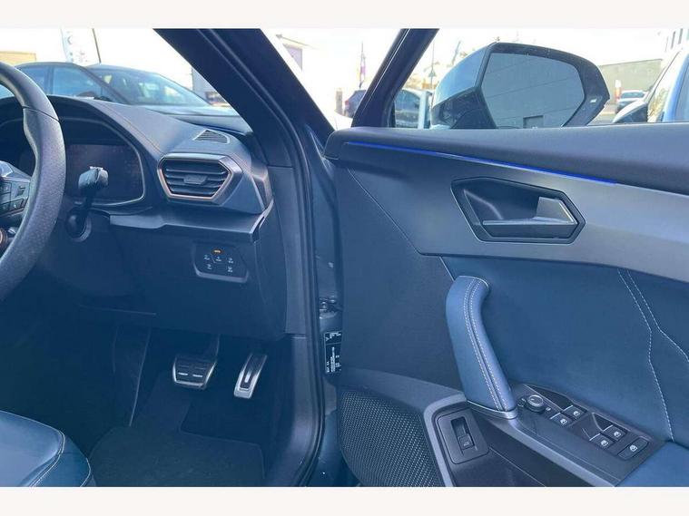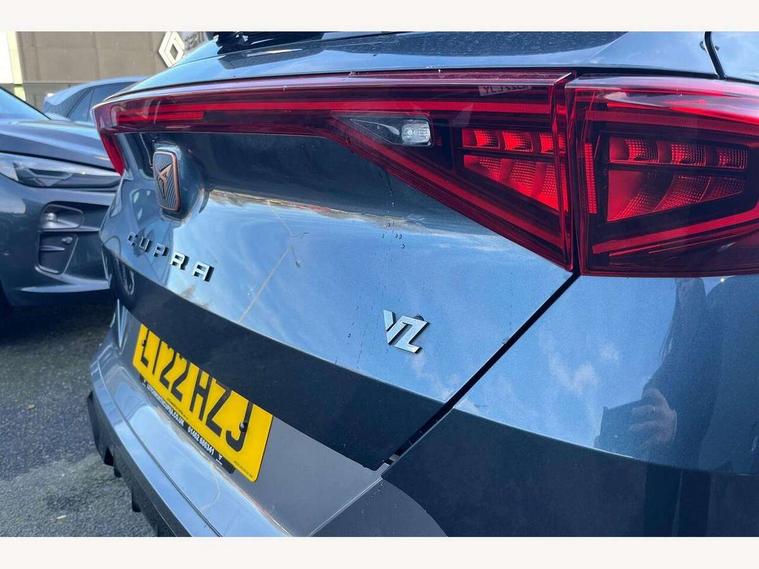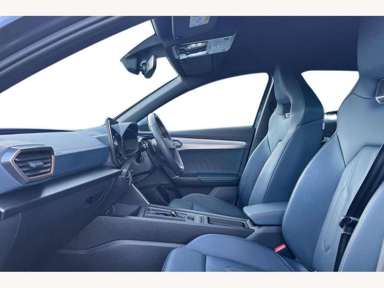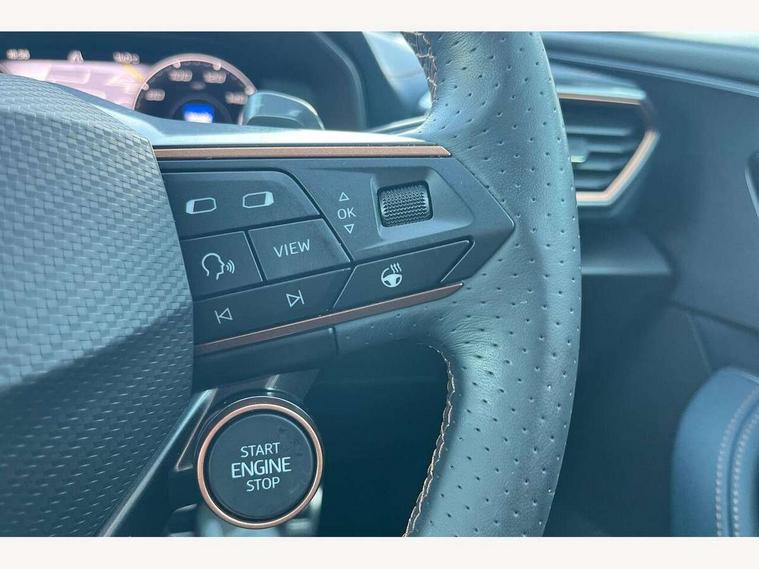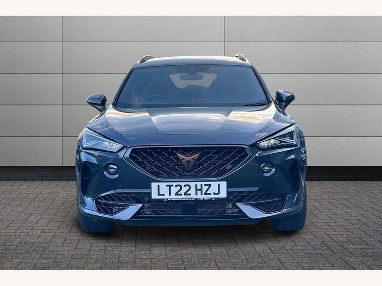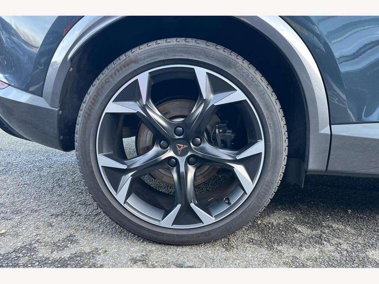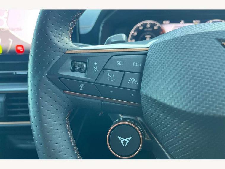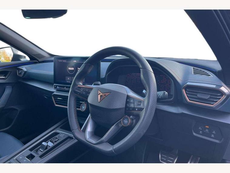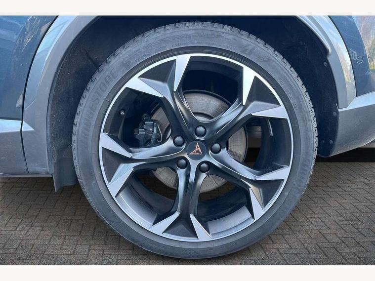 Digital cockpit and configurable dashboard, Driver alert system, Dynamic chassis control with driving profile selection (Comfort, Sport, CUPRA, Individual), E-call, Forward collision warning with automatic braking, Lane assist, Park assist (inc front/rear parking sensors), Predictive adaptive cruise control with speed limiter, RPM, trip computer, outside temp gauge, instrument light brightness, low fuel warning light, lights on reminder, gearshift indicator, Service interval indicator, Speed sensitive power steering, Start/stop system with regenerative braking, Virtual pedal and electric tailgate, Wireless apple carplay, Wireless phone charger, Electronic locking differential and dynamic traction support, Sports suspension with front shock absoption, 2 front and 2 rear USB type C sockets, Auxiliary input socket, DAB radio, Auto dimming rear view mirror, Body colour door handles, Body coloured bumpers, Dark grey wing mirror, Daytime running light with automatic headlight control and coming home feature, Dynamic headlight range control, Electric front/rear windows, Electrically adjustable heated and folding door mirrors with memory function, Front fog lamps with cornering function, Gloss black roof rails and window surrounds, LED Headlights, LED Taillights with dynamic indicator, Rain sensing wipers, Rear diffuser with twin exhaust pipe on each side, Rear side wing doors, Rear wash/wipe, Sports bumpers, Third brake light, Tinted rear windows, VZ logo rear badging, Welcome lights, 12v power supply in centre console, 12V socket, 12v socket in loadspace, 2 front and 2 rear reading lights, 230V socket, 3 seat bench in 2nd row, 60/40 split rear bench seat with armrest and mechanical seat release, Black headlining, Cupra sports pedals, Dust/pollen filter, Front and rear head restraints, Front centre armrest, Height/reach adjust steering wheel, Illuminated interior front door sills, Illuminated sunvisor with mirror, Isofix, Leather heated multi-function sports steering wheel with start stop, CUPRA mode button and gear shift paddles, Luggage tie-down hooks, Single front passenger seat, Three zone climate control with control panel in rear, Variable luggage/load compartment floor, Wraparound lighting, Genuine Nappa leather Pack - Cupra, Navigation system pack - Formentor, Safety and driving pack (XL) - Formentor, 3 point seatbelts on all rear seats, ABS, Brake control system - ESC and brake booster, Child proof door locks, Driver and front passenger airbags with front passenger airbag de-activation, Electronic parking brake, Front and rear disc brakes, Front side curtain airbags, Hill hold control, Seat belt reminder for front and rear seats, Tyre pressure monitoring system, Anti theft alarm system, Keyless entry and start system (KESSY), Locking wheel bolts, Copper and aluminium interior detailing, 19" 'Exclusive' machined sport matte black and silver alloy wheels, Space saver spare wheel,