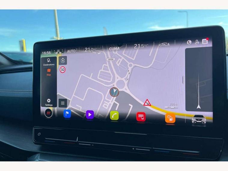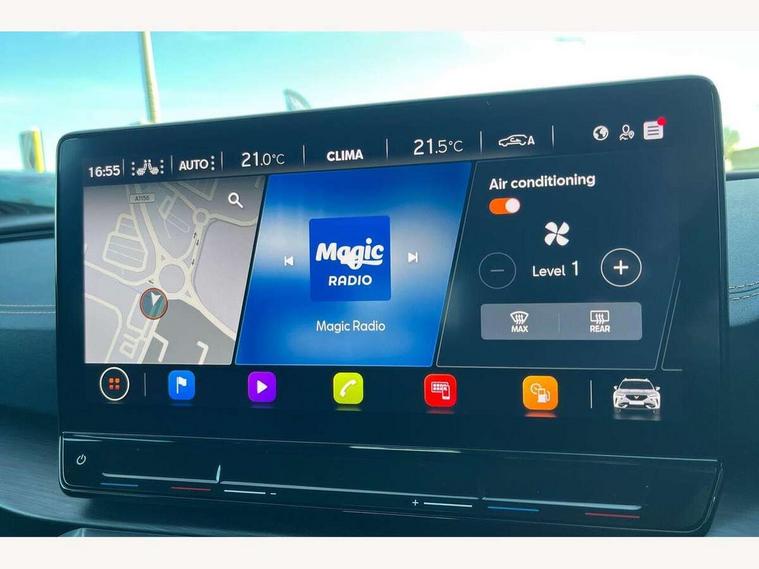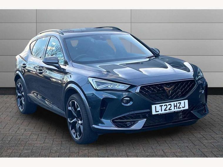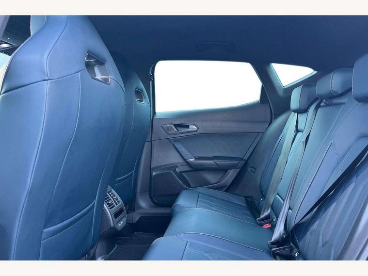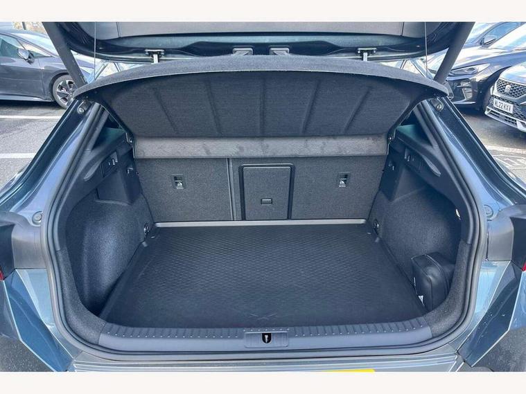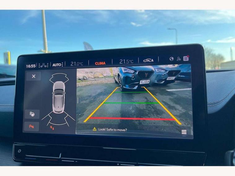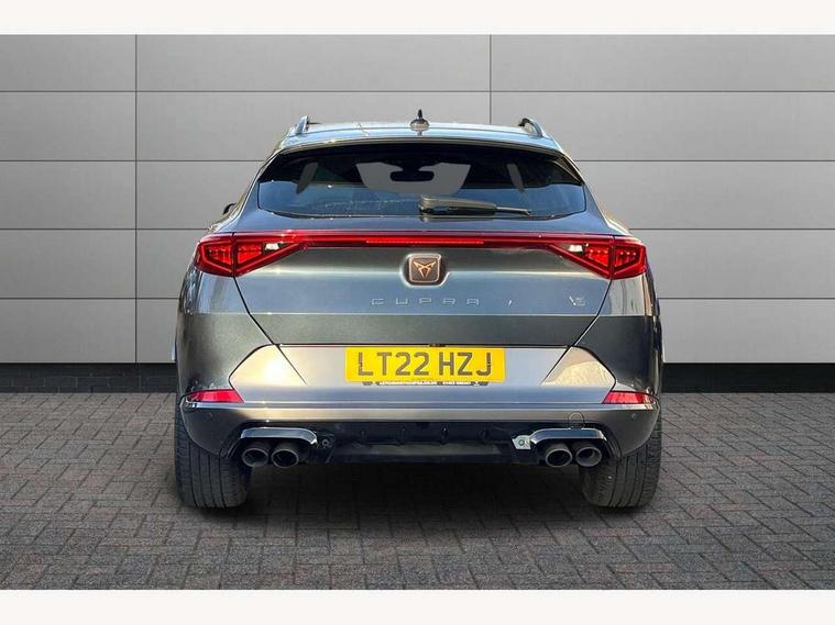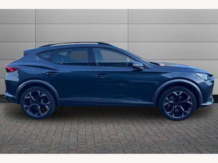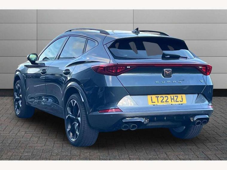 Digital cockpit and configurable dashboard, Driver alert system, Dynamic chassis control with driving profile selection (Comfort, Sport, CUPRA, Individual), E-call, Forward collision warning with automatic braking, Lane assist, Park assist (inc front/rear parking sensors), Predictive adaptive cruise control with speed limiter, RPM, trip computer, outside temp gauge, instrument light brightness, low fuel warning light, lights on reminder, gearshift indicator, Service interval indicator, Speed sensitive power steering, Start/stop system with regenerative braking, Virtual pedal and electric tailgate, Wireless apple carplay, Wireless phone charger, Electronic locking differential and dynamic traction support, Sports suspension with front shock absoption, 2 front and 2 rear USB type C sockets, Auxiliary input socket, DAB radio, Auto dimming rear view mirror, Body colour door handles, Body coloured bumpers, Dark grey wing mirror, Daytime running light with automatic headlight control and coming home feature, Dynamic headlight range control, Electric front/rear windows, Electrically adjustable heated and folding door mirrors with memory function, Front fog lamps with cornering function, Gloss black roof rails and window surrounds, LED Headlights, LED Taillights with dynamic indicator, Rain sensing wipers, Rear diffuser with twin exhaust pipe on each side, Rear side wing doors, Rear wash/wipe, Sports bumpers, Third brake light, Tinted rear windows, VZ logo rear badging, Welcome lights, 12v power supply in centre console, 12V socket, 12v socket in loadspace, 2 front and 2 rear reading lights, 230V socket, 3 seat bench in 2nd row, 60/40 split rear bench seat with armrest and mechanical seat release, Black headlining, Cupra sports pedals, Dust/pollen filter, Front and rear head restraints, Front centre armrest, Height/reach adjust steering wheel, Illuminated interior front door sills, Illuminated sunvisor with mirror, Isofix, Leather heated multi-function sports steering wheel with start stop, CUPRA mode button and gear shift paddles, Luggage tie-down hooks, Single front passenger seat, Three zone climate control with control panel in rear, Variable luggage/load compartment floor, Wraparound lighting, Genuine Nappa leather Pack - Cupra, Navigation system pack - Formentor, Safety and driving pack (XL) - Formentor, 3 point seatbelts on all rear seats, ABS, Brake control system - ESC and brake booster, Child proof door locks, Driver and front passenger airbags with front passenger airbag de-activation, Electronic parking brake, Front and rear disc brakes, Front side curtain airbags, Hill hold control, Seat belt reminder for front and rear seats, Tyre pressure monitoring system, Anti theft alarm system, Keyless entry and start system (KESSY), Locking wheel bolts, Copper and aluminium interior detailing, 19" 'Exclusive' machined sport matte black and silver alloy wheels, Space saver spare wheel,