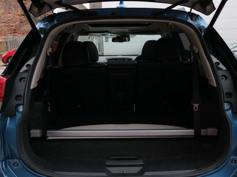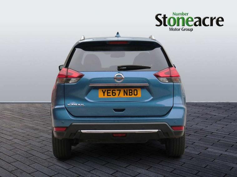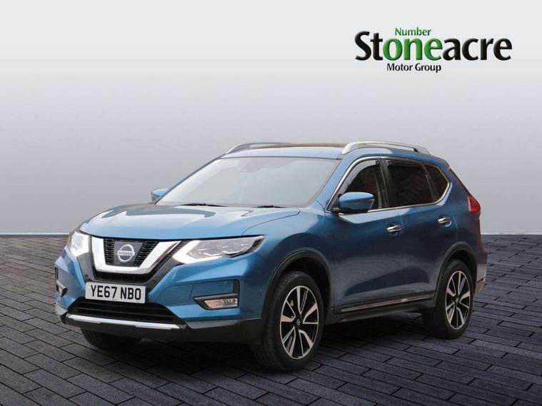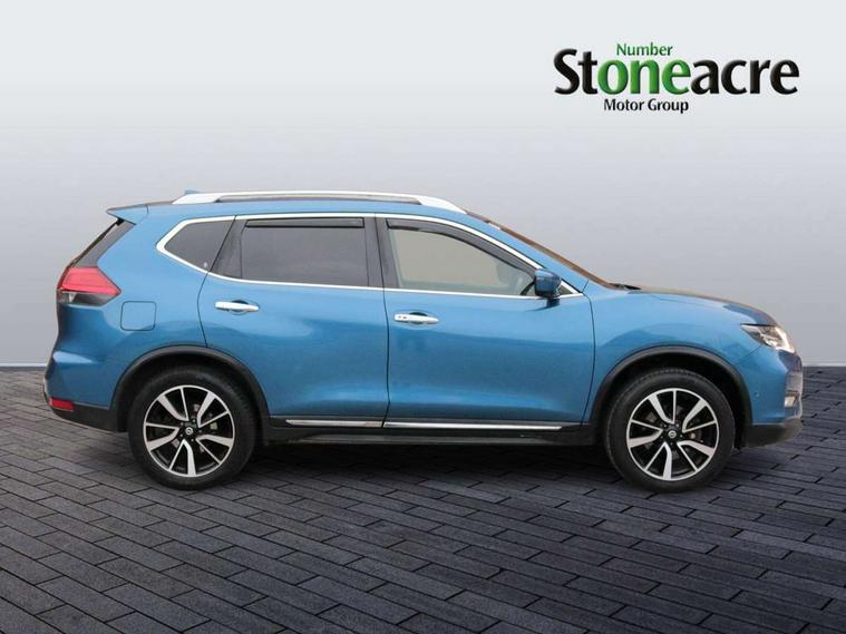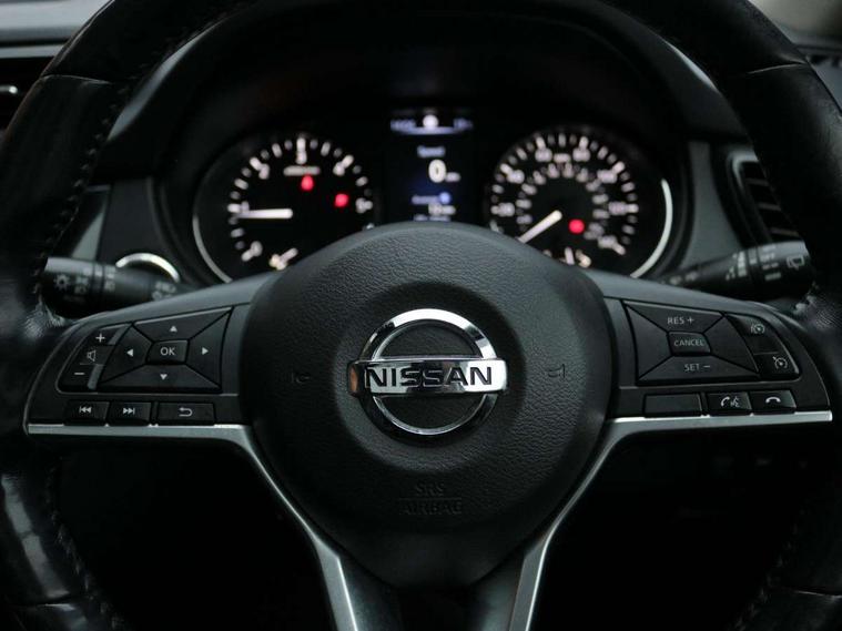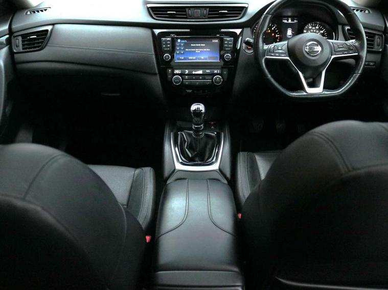 5" TFT driver information centre, Around View Monitor, Attention assist, Automatic tailgate opening, Blind spot monitoring, Bluetooth phone integration system, Cruise control + speed limiter, Engine start button, Front and rear parking sensors, Intelligent parking assist, Lane departure warning system, Moving object detection, Nissan connect sat nav system, PAS, Rear cross traffic alert, Traffic sign recognition, Trip computer, 6 speakers, Audio remote control in steering wheel, DAB Digital radio, Radio/CD, Smartphone apps, USB/aux input socket, Adaptive front lighting system, Auto dimming rear view mirror, Automatic headlights, Automatic rain sensing wipers, Black honeycomb front grille, Body colour door mirrors, Chrome door handles, Chrome side mouldings, Chrome window surround, Electric folding door mirrors, Electric heated door mirrors, Front and rear power windows, Front fog lights, High beam assist, LED daytime running lights, LED Headlights, Panoramic sunroof, Rear privacy glass, Satin silver roof rails, Shark fin roof aerial, 3 rear headrests, 60/40 split rear bench seat, Centre console storage box/armrest, Configurable luggage board system, Dual zone climate control, Electric adjustable front seats including height adjust, Front and rear door pockets with bottle holders, Front cupholders, Heated front seats, Heated rear seats, Heated steering wheel, Height adjustable front headrests, Individual rear reading lights, Isofix child seat attachment, Leather steering wheel and gear knob, Lumbar support, Pollen filter, Rake/reach adjustable steering wheel, Rear armrest, Synthetic leather instrumental panel inserts, Synthetic leather knee pad, 3 point seatbelts on all seats, ABS, Child locks on rear doors, Driver and passenger airbags, EBD + Brake Assist, Electronic parking brake, ESP + traction control, First aid kit, Front and rear curtain airbags, Hill hold assist, Intelligent emergency braking with pedestrian recognition, Seatbelt warning, Tyre pressure monitoring system, Warning triangle, Alarm, Immobiliser, Intelligent Key, Remote central locking, Full size spare wheel,