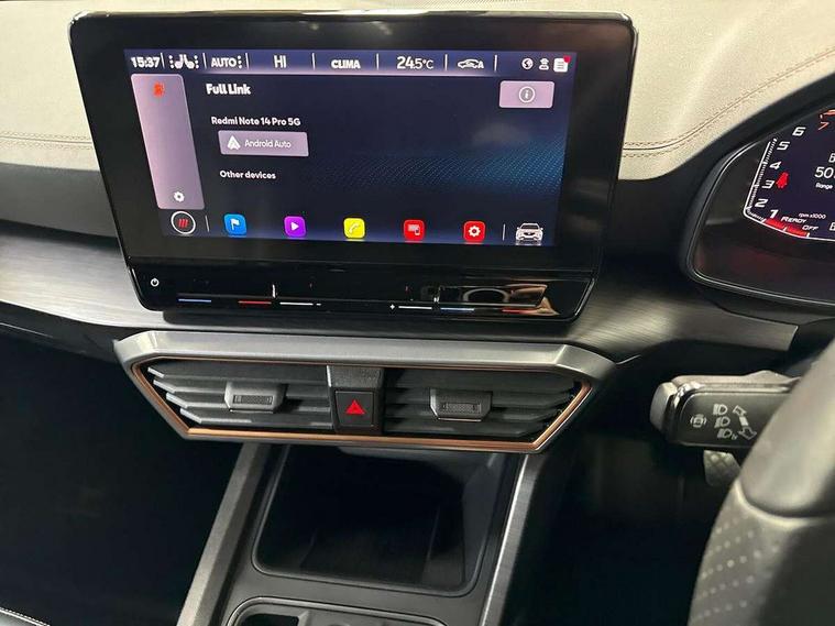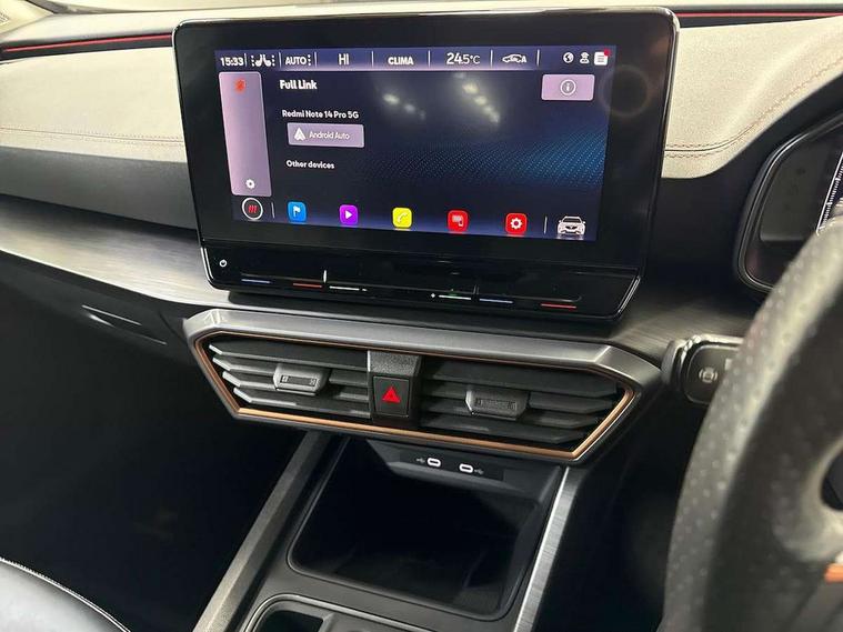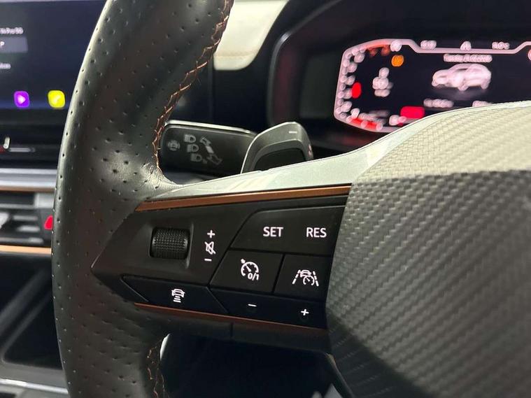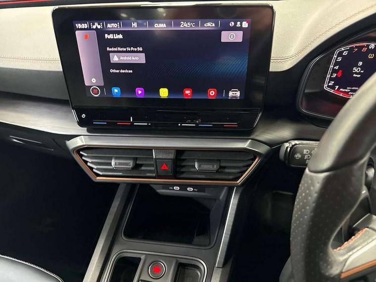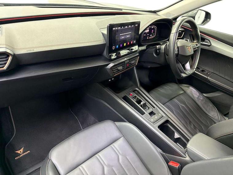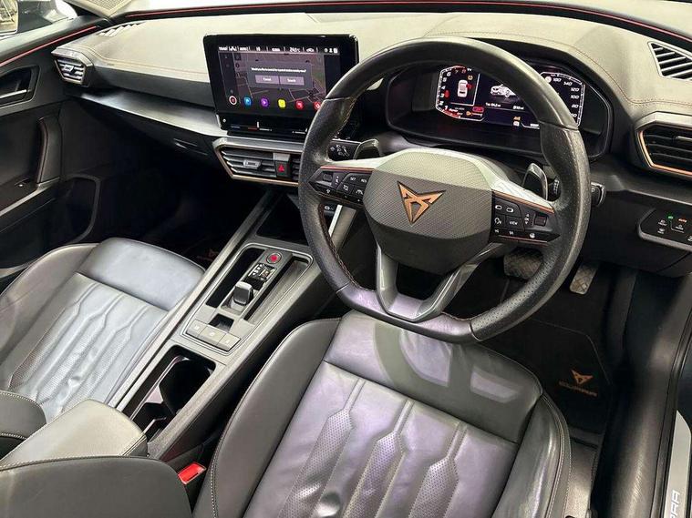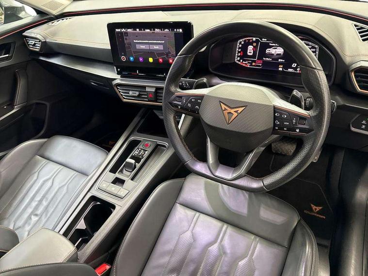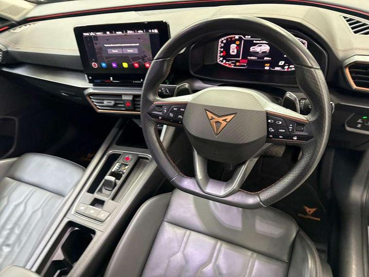 Digital cockpit and configurable dashboard, Driver alert system, Driving profile selection, E-call, Forward collision warning with automatic braking, Lane assist, Park assist (inc front/rear parking sensors), PAS, Predictive adaptive cruise control with speed limiter, Rear view camera, RPM, trip computer, outside temp gauge, instrument light brightness, low fuel warning light, lights on reminder, gearshift indicator, Service interval indicator, Start/stop system with regenerative braking, Wireless apple carplay, Wireless phone charger, Electronic locking differential and dynamic traction support, Standard suspension, 2 front and 2 rear USB type C sockets, Auxiliary input socket, DAB radio, Auto dimming rear view mirror, Body colour door handles, Body coloured bumpers, Dark grey wing mirror, Daytime running light with automatic headlight control and coming home feature, Dynamic headlight range control, Electric front/rear windows, Electrically adjustable heated and folding door mirrors with memory function, Front fog lamps with cornering function, Gloss black roof rails and window surrounds, LED Headlights, LED Taillights with dynamic indicator, Rain sensing wipers, Rear diffuser with black simulated exhaust pipes, Rear side wing doors, Rear wash/wipe, Third brake light, Tinted rear windows, Welcome lights, 12v power supply in centre console, 12V socket, 12v socket in loadspace, 2 front and 2 rear reading lights, 230V socket, 3 seat bench in 2nd row, 60/40 split rear bench seat with armrest and mechanical seat release, Dust/pollen filter, Front and rear head restraints, Front centre armrest, Height/reach adjust steering wheel, Illuminated interior front door sills, Illuminated sunvisor with mirror, Isofix, Leather multi function heated steering wheel with gear shift paddles, Luggage tie-down hooks, Single front passenger seat, Three zone climate control with control panel in rear, Variable luggage/load compartment floor, Wraparound lighting, Genuine Nappa leather Pack - Cupra, Navigation system pack with 10" navigation system - Formentor, 3 point seatbelts on all rear seats, ABS, Brake control system - ESC and brake booster, Child proof door locks, Driver and front passenger airbags with front passenger airbag de-activation, Electronic parking brake, Front and rear disc brakes, Front side curtain airbags, Hill hold control, Seat belt reminder for front and rear seats, Tyre pressure monitoring system, Anti theft alarm system, Keyless entry and start system (KESSY), Locking wheel bolts, Copper and aluminium interior detailing, 19" 'Exclusive' machined sport matte black and silver alloy wheels,