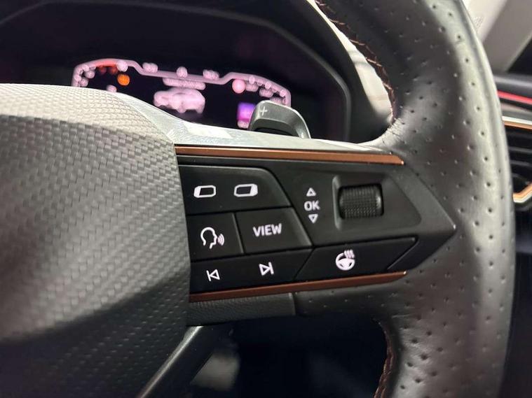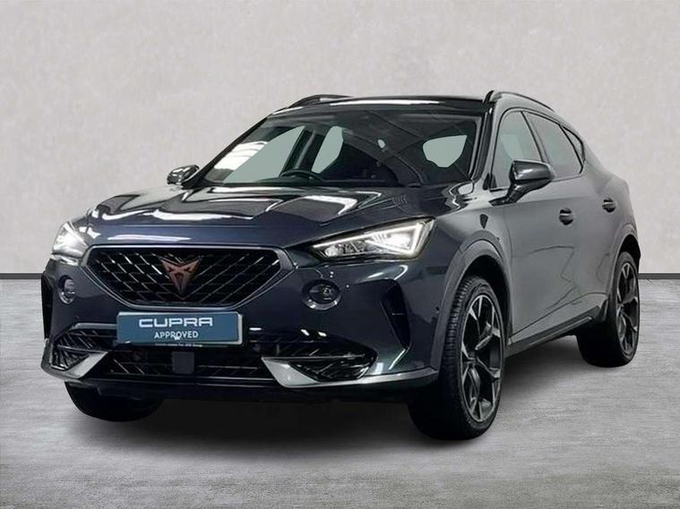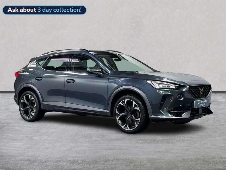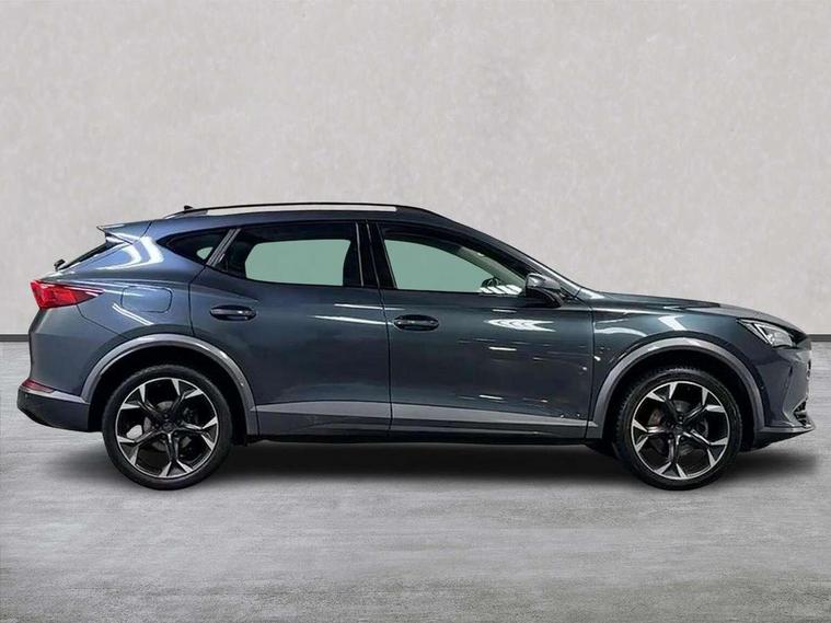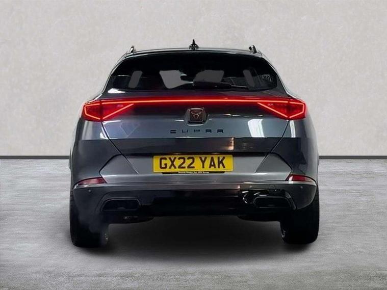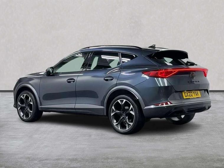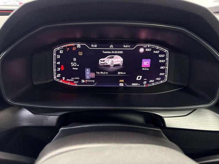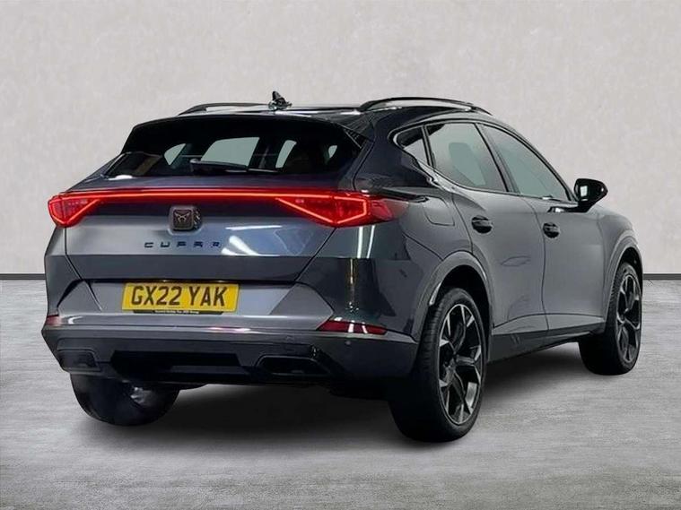 Digital cockpit and configurable dashboard, Driver alert system, Driving profile selection, E-call, Forward collision warning with automatic braking, Lane assist, Park assist (inc front/rear parking sensors), PAS, Predictive adaptive cruise control with speed limiter, Rear view camera, RPM, trip computer, outside temp gauge, instrument light brightness, low fuel warning light, lights on reminder, gearshift indicator, Service interval indicator, Start/stop system with regenerative braking, Wireless apple carplay, Wireless phone charger, Electronic locking differential and dynamic traction support, Standard suspension, 2 front and 2 rear USB type C sockets, Auxiliary input socket, DAB radio, Auto dimming rear view mirror, Body colour door handles, Body coloured bumpers, Dark grey wing mirror, Daytime running light with automatic headlight control and coming home feature, Dynamic headlight range control, Electric front/rear windows, Electrically adjustable heated and folding door mirrors with memory function, Front fog lamps with cornering function, Gloss black roof rails and window surrounds, LED Headlights, LED Taillights with dynamic indicator, Rain sensing wipers, Rear diffuser with black simulated exhaust pipes, Rear side wing doors, Rear wash/wipe, Third brake light, Tinted rear windows, Welcome lights, 12v power supply in centre console, 12V socket, 12v socket in loadspace, 2 front and 2 rear reading lights, 230V socket, 3 seat bench in 2nd row, 60/40 split rear bench seat with armrest and mechanical seat release, Dust/pollen filter, Front and rear head restraints, Front centre armrest, Height/reach adjust steering wheel, Illuminated interior front door sills, Illuminated sunvisor with mirror, Isofix, Leather multi function heated steering wheel with gear shift paddles, Luggage tie-down hooks, Single front passenger seat, Three zone climate control with control panel in rear, Variable luggage/load compartment floor, Wraparound lighting, Genuine Nappa leather Pack - Cupra, Navigation system pack with 10" navigation system - Formentor, 3 point seatbelts on all rear seats, ABS, Brake control system - ESC and brake booster, Child proof door locks, Driver and front passenger airbags with front passenger airbag de-activation, Electronic parking brake, Front and rear disc brakes, Front side curtain airbags, Hill hold control, Seat belt reminder for front and rear seats, Tyre pressure monitoring system, Anti theft alarm system, Keyless entry and start system (KESSY), Locking wheel bolts, Copper and aluminium interior detailing, 19" 'Exclusive' machined sport matte black and silver alloy wheels,