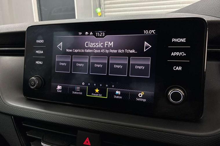 Bluetooth system, E-call, Front assist system, PAS, Service indicator, Speed limiter, Wireless Smartlink for Apple CarPlay (wired for Android Auto), 8 Speakers, Auxiliary input socket, DAB Digital radio, Body colour bumpers, Body colour door mirrors and handles, Chrome grille surround, Dimming rear view mirror with black surround, Electrically adjustable and heated door mirrors, Front and rear electric windows, Headlight range control, Heated rear window, LED rear lights - low functionality, LED third brake light, Light sensors, Rain sensor, Rear fog lights, Rear side wing doors, Rear wiper, 12V Accessory socket in centre console, 3 seat bench in 2nd row, Chrome inner door handles, Cloth upholstery, Front head restraints, Glove compartment with illumination, Ice scraper, Isofix child seat fittings on outer rear seats, ISOFIX on front passenger seat, Manual lumbar support for front seats, Rake/reach adjustable steering wheel, Reading lights, Single front passenger seat, Sun visors with illumination on front passenger, Textile floor mats, Third rear headrest, Top tether for front passenger seat, Umbrella in driver's door, 3x3 point rear seatbelts, Airbags - driver and front passenger, ESP, Front passenger airbag deactivation switch, Front side airbags with curtain airbags, Hill hold control, Manual parking brake, Manual rear child locks, One tone horn, Rear disc brakes, Seatbelt reminder for driver an co-driver, Traction control, Tyre pressure monitor, Anti-theft alarm system with interior monitoring, backup horn, towing protection and remote central locking with SAFE system, Anti-theft wheel bolts, Electronic engine immobilizer,