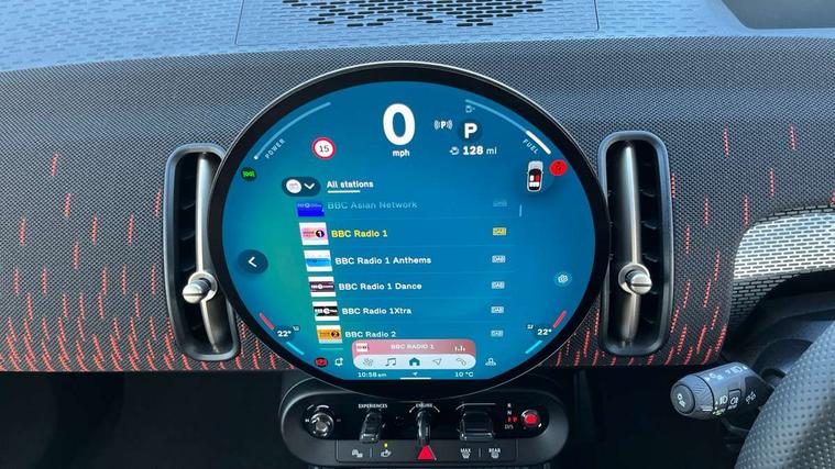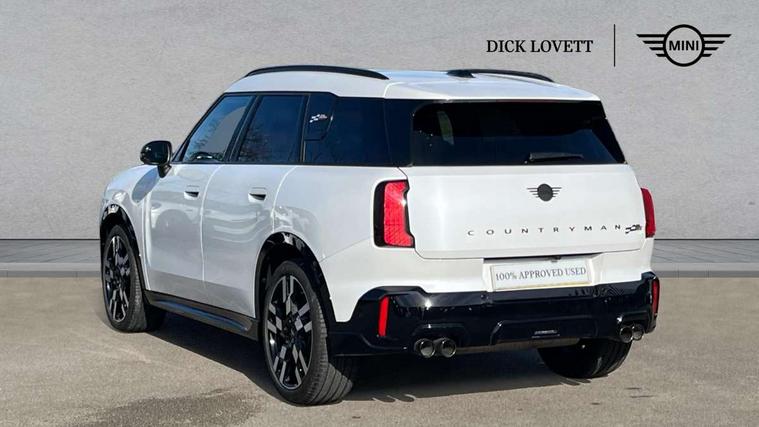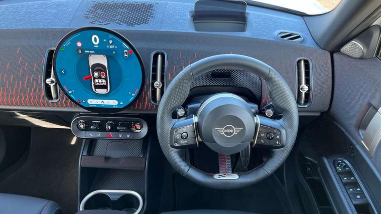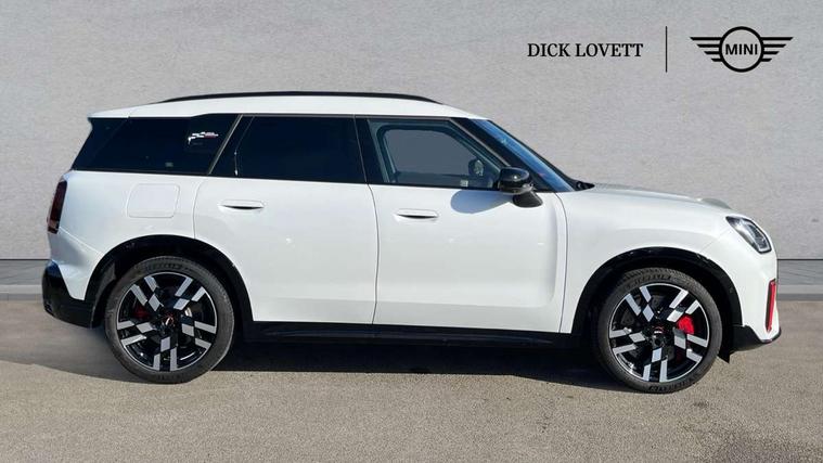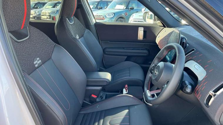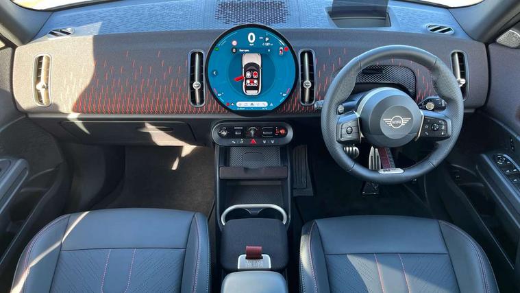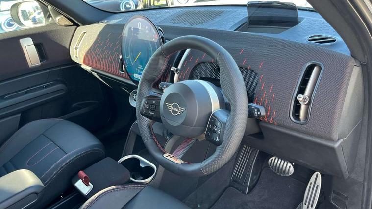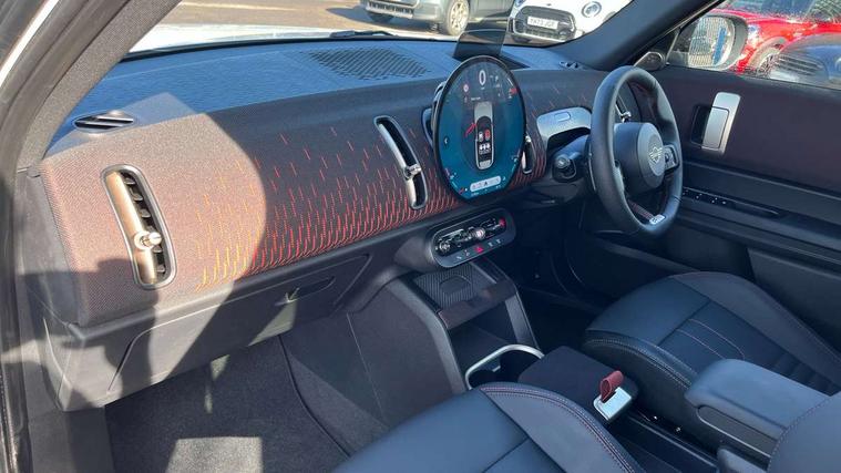 Bluetooth connection, Circular OLED Screen, Compatible mobile phone bluetooth with audio streaming, Cruise Control (DCC), Digital dashboard display, Driving Assistant Plus Preparation, E-call, Electro-mechanical speed dependant steering assistance, MINI Experience Modes, MINI Head up display, Mini navigation system, MINI TeleServices, Parking assistant in camera and ultrasound based assistance system, rear view camera, parking aid and distance control, Double clutch sports transmission, Quad exhaust system, DAB Digital radio, Harman Kardon surround sound system, Personal eSim, Auto tailgate, Electric adjustable heated door mirrors, Front and rear apron, Front and rear electric windows, Heated rear window, High beam assistant, High gloss hexagonal patterned grille surround, Interior rear-view mirror with automatic anti-dazzle function, LED daytime running lights, LED headlights with extended contents including Adaptable light signatures, LED rear lights, LED third brake light, Rain sensor with auto headlights, Rear roof spoiler with airblades, Rear side wing doors, Rear window wiper, Roof rails, 3 seat bench in 2nd row, 60/40 split rear bench seat, Anthracite headliner, Auto air conditioning, Driver and front passenger seat heating, Floor mats, Front armrest, Front headrests, Heated steering wheel, Height and length steering column adjustment, JCW Front sports seats, Lidded storage box in Black/Red knit, Luggage compartment separating net, Perforated Vescin steering wheel, Rear headrests, Seat adjustment for rear seats, Single front passenger seat, Sunvisors with vanity mirrors, Vescin/Cloth upholstery, Wireless charging tray, Interior and exterior mirror package - Mini Countryman, 3x3 point rear seat belts, 6 Airbags - front, side, head and seat belt tensioners, ABS, DSC - Dynamic Stability Control, Electronic handbrake, Electronic Stability Programme (ESP), Front ISOFIX (iSize), Hill descent control, Hill hold assist, Hill start assist, JCW logo in brake calipers, JCW Sport brakes with Chilli Red calipers, Manual rear child locks, Traction control, Tyre pressure monitoring system, Warning triangle, Alarm system with tilt sensor, monitoring doors, bonnet interior and tailgate, Auto drive away locking, Comfort access system, Deadlocking function, Electronic vehicle immobiliser, Locking wheel bolts, Remote control locking, Start/stop toggle with keyless go, JCW Black/Red dashboard knit, 19" JCW Runway Spoke Black alloy wheels, MINI Mobility Kit,