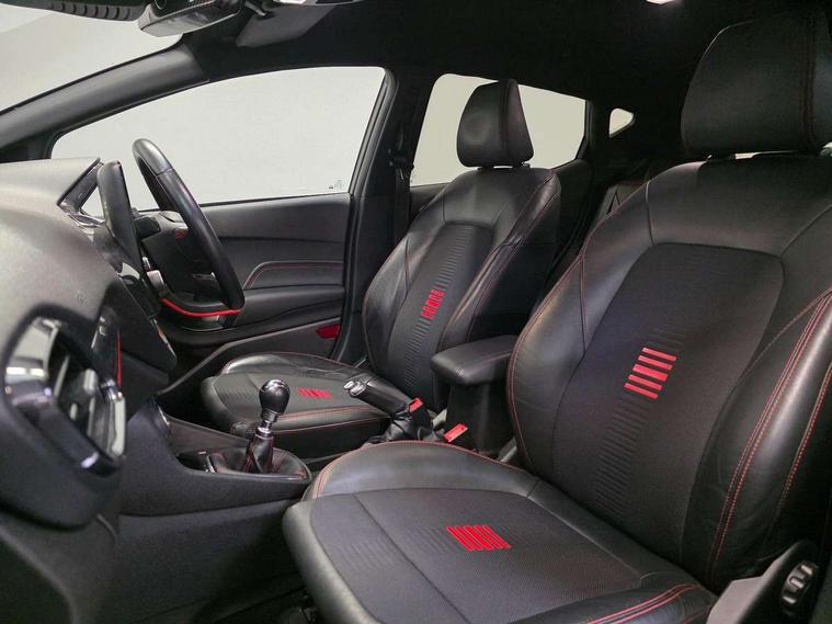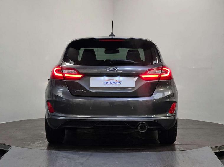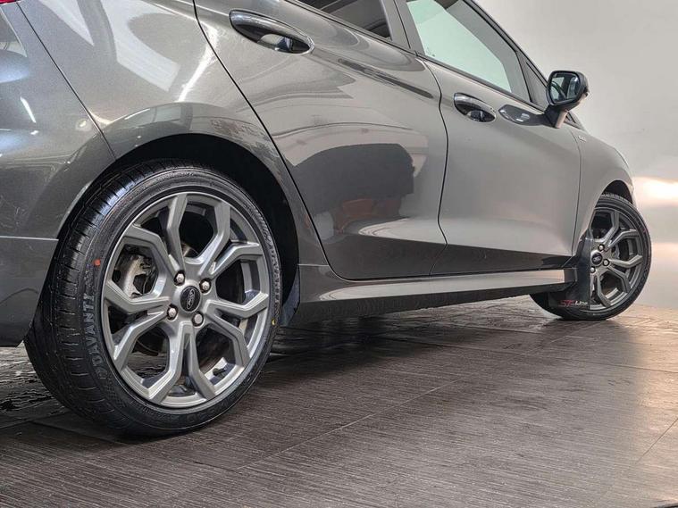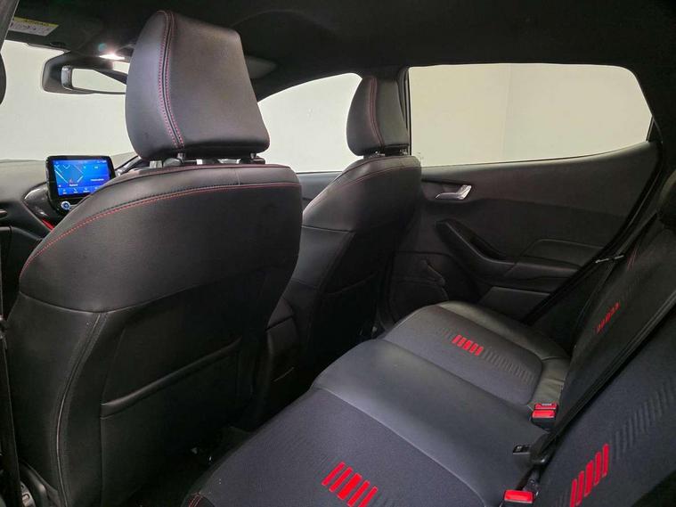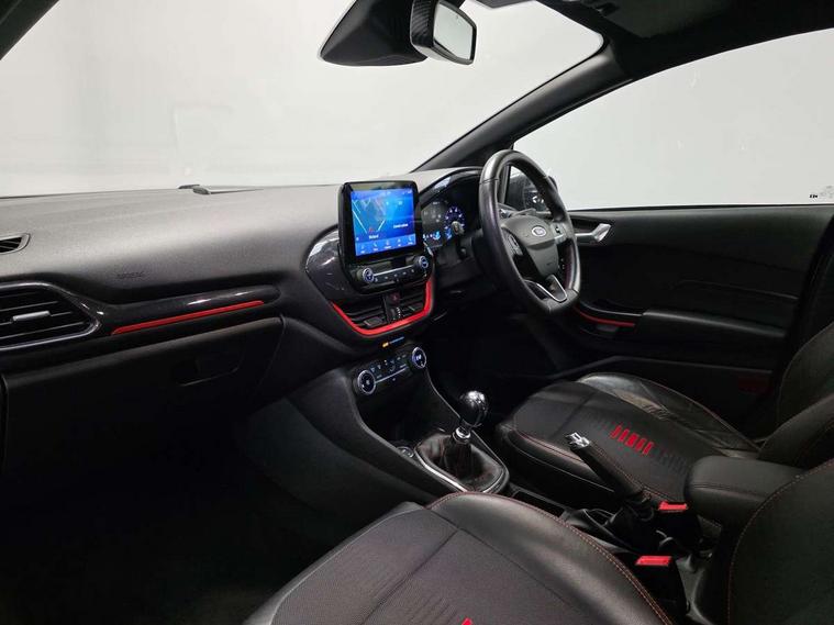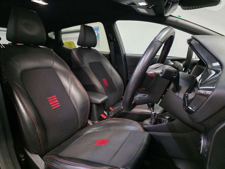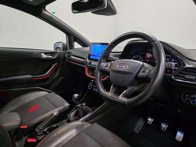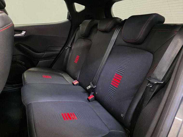 Bluetooth system, Electric power steering, Ford easy fuel, Trip computer, Sports suspension, 2 USB ports, Auxiliary input socket, DAB Digital radio, Steering wheel mounted controls, Auto dimming rear view mirror, Automatic headlights, Body colour bumpers, Body colour door handles, Body colour electric adjustable heated door mirrors with integral indicators, Body colour large rear spoiler, Chrome door handles, Chrome lower window surround, Cornering front fog lights, Electric front windows/one touch facility, LED Night signature to rear lights, LED rear lights, Power foldable door mirrors with puddle lights, Quickclear heated windscreen, Rain sensing wipers and auto dimming rear view mirror, Rear privacy glass, Rear wiper, Rugged body styling kit with active front wing badges, Tinted glass, Unique ST-Line upper grille & full bodystyling kit with ST-Line wing badges, 12V Accessory socket in centre console, 3 spoke flat bottomed leather steering wheel, 60/40 split folding rear seat, Adjustable head restraints, Black headlining, Boot carpet, Centre console with armrest and illuminated cupholders, Chrome inner door handles, Drivers and Passenger lumbar support, EATC - Electronic Auto Temperature control, Footwell illumination, Front and rear velour floor mats, Front map reading lights, Front seat and rear pockets, Illuminated glovebox, Leather gear knob, Leather trimmed handbrake handle, Load area light, Overhead console with sunglasses holder, Pollen filter, Rake/reach adjustable steering wheel, Rear centre head restraint, Sports front seats, Sports pedals, Driver assistance pack - Fiesta/Titanium/Titanium X/Active B+O/Active X/ST-Line X, NCAP Pack - Fiesta, Red pack - Fiesta ST-Line X, 3 point seatbelts on all rear seats, ABS+EBA, Curtain airbags, Driver and passenger airbags, Drivers knee airbag, Electronic stability control with hill start assist, Front passenger airbag deactivation, Front side airbags, Seatbelt warning, Tyre pressure monitoring system, MyKey system, Remote central locking & engine immobiliser, Thatcham Cat.1 alarm,