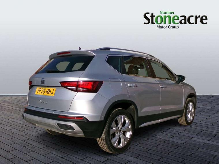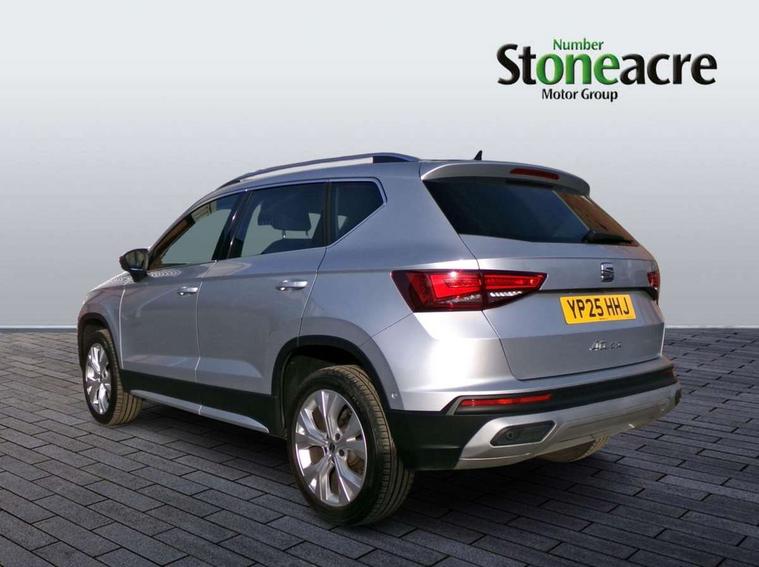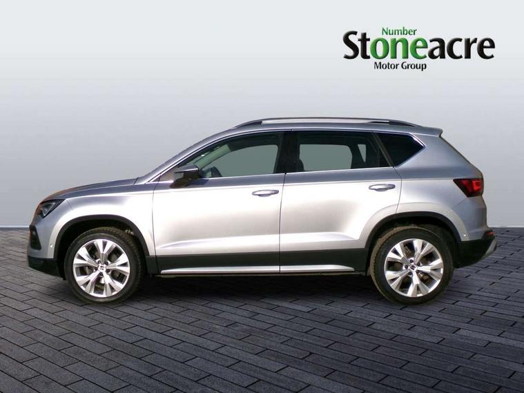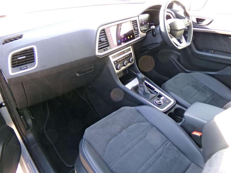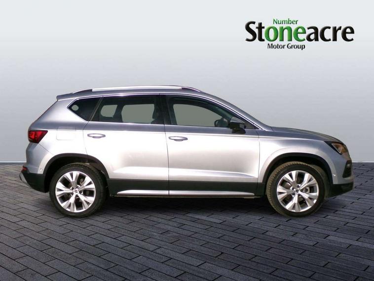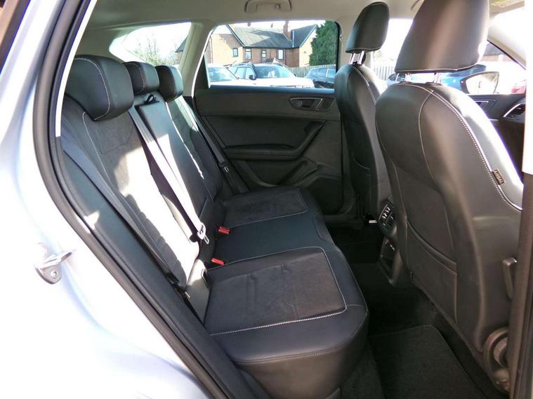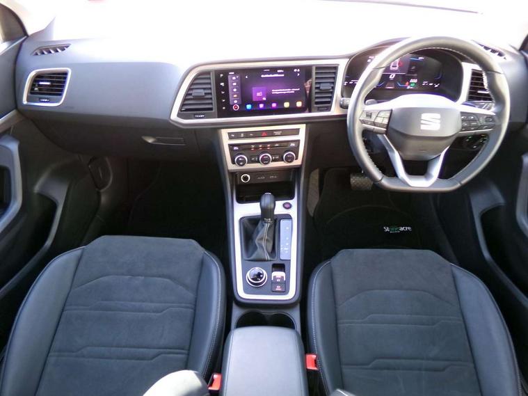 8" Digital cockpit, Colour multi-function on board computer display, E-call, Electric tailgate, Outside temperature gauge, Progressive power assisted steering, Rear view camera, SEAT drive profile with driving experience button - Normal, Sport, Eco and Individual mode, gearshift, steering and throttle response, Self parking functionality (includes front and rear parking sensors), Start/stop system, Trip computer, wired and wireless full link smartphone integration, Wireless phone charger, Steering wheel mounted audio/phone controls, Black wheel arch surrounds, Body colour bumpers, Chrome front grille frame, Chrome roof rails, Chrome side window trim, Dark tinted rear windows, Daytime running lights, Door mirrors with welcome light silhouette, Dynamic headlight range control with self adjusting whilst driving, Electric adjustable/heated/folding door mirrors, Front and rear electric windows, Front grille hot stamping, Full LED headlamps with lens and LED front fog lamps with cornering function, Heat reflecting windscreen, Illuminated aluminium front door sill, LED 3rd brake light, LED rear tail lights with dynamic indicators, Rear exhaust tailpipe, Rear fog lights, Rear side wing doors, Rear wash/wipe, Reflex silver side mouldings, Variable front intermittent wipers, 12V socket in front, 3 seat bench in 2nd row, 60/40 split folding rear seat, Dinamica upholstery with front comfort seats, Drawer under right front seat, Dual zone climate control, Front and rear head restraints, Front centre armrest, Front seat back storage pockets, Height adjustable driver and passenger seat with lumbar adjustment, ISOFIX points in outer rear seats with top tether anchorage points, Leather sports steering wheel and gear knob, Rear armrest and easy back seat release mechanism from boot, Single front passenger seat, Steering wheel mounted gearshift paddles, Convenience pack - Ateca, Interior lighting pack - Ateca, Navigation system pack with DAB - Ateca, Safety and driving pack (M) - Ateca, Safety and driving pack with attention and drowsiness assist - Ateca, 3x3 point rear seatbelts, ABS, Traction control system (TCS), Electronic stability control (ESC) and Electronic differential lock system (XDS), Airbags - Driver and front passenger airbag with deactivation, front side, two curtain and driver's knee airbags, Electric parking brake with auto hold function, Front and rear seatbelt reminder, Hill hold control, Manual rear child locks, Single tone horn, Tiredness recognition system, Tyre pressure monitoring system, Alarm, Keyless entry, Locking wheel bolts, Remote central locking, Chrome interior detailing, 18" Brillaint silver alloy wheels,