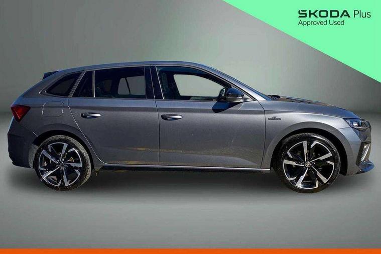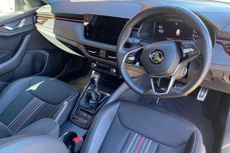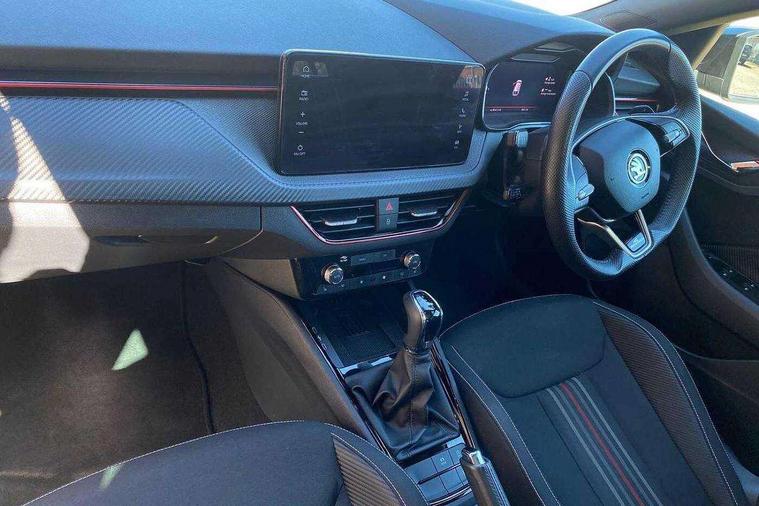 Advanced driver attention and drowsiness monitor, Bluetooth, e-Call (emergency call), Front assist system, PAS, Rear parking sensors, Rear view camera, Speed limiter, Tailgate, Traffic sign recognition, Virtual Cockpit - 10.25" digital display, Voice control system, Wireless smartlink, 4 USB C ports, 8 Speakers, 9.2" Skoda navigation display, DAB radio, Auto dimming rear view mirror, Automatic headlamp activation with Coming home and Leaving home feature, Automatic high/low beam, Automatic intermittent wipers, Black door mirrors, Black lettering on boot lid, Black radiator grille, Black rear diffuser, Black roof spoiler, Body colour bumpers, Body colour door handles, Chrome moulding around grille, Extended tailgate glass, Front and rear electric windows, Heated rear window, LED 3rd brake light, LED brake lights, LED daytime running lights, LED high beam, LED low beam, Light sensors, Monte carlo plaque, Panoramic glass roof, Privacy glass, Rear LED fog light, Rear side wing doors, Rear wiper, Tinted windows, Unique dark chrome design logo on alloy wheels, 12V socket in luggage compartment, 3 seat bench in 2nd row, Aluminium pedals, Ambient lighting in white/red, Black / White armrest stitching, Black ceiling, Black roof headlining, Cargo elements, Chrome inner door handles, Door inserts in art.leather carbon, Driver and passenger sun visors with vanity mirror, Dual zone climate control, Front and rear roof lights, Front centre armrest, Front head restraints, Height adjustable driver seat, Height adjustable passenger seat, Ice scraper, Illuminated glove compartment, Inner circulation control with pollen filter, ISOFIX for front passenger seat, Isofix preparation for back seats, Leather gearknob and handbrake lever, Luggage net under rear parcel shelf, Manual lumbar support for front seats, Monte Carlo cloth upholstery, Net package and top tether hooks in boot space, Pocket on the back of both front seats, incl. mobile phone pockets, Rear centre armrest, Red hotstamping, Single front passenger seat, Skoda lettering on steering wheel, Sport seats, Textile floor mats, Third rear headrest, Ticket holder, Top tether for front passenger seat, Umbrella in driver's door, Light and view plus pack - Scala, 3x3 point rear seatbelts, ABS, Child locks, Curtain airbags and front side airbags, Disc brakes, Driver and front passenger airbags, ESP, Hill hold control, Manual leather parking brake, One tone horn, Passenger airbag switch off function, Seatbelt reminder for driver and front passenger, Tyre pressure monitoring system, Anti theft alarm system with interior monitoring, backup horn and towing protection, Anti-theft wheel bolts, Remote central locking with 2 remote folding keys, SAFE function for remote central locking, Carbon effect decorative inserts, 18" Ursa black diamond cut alloy wheels,