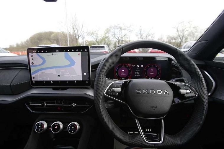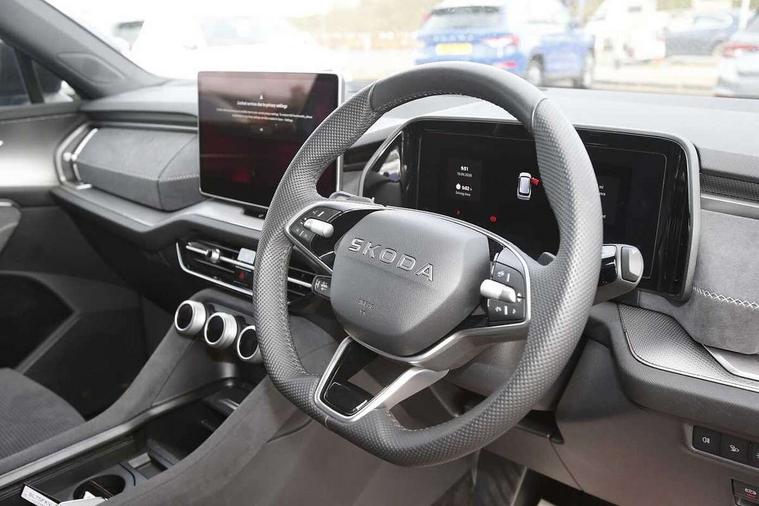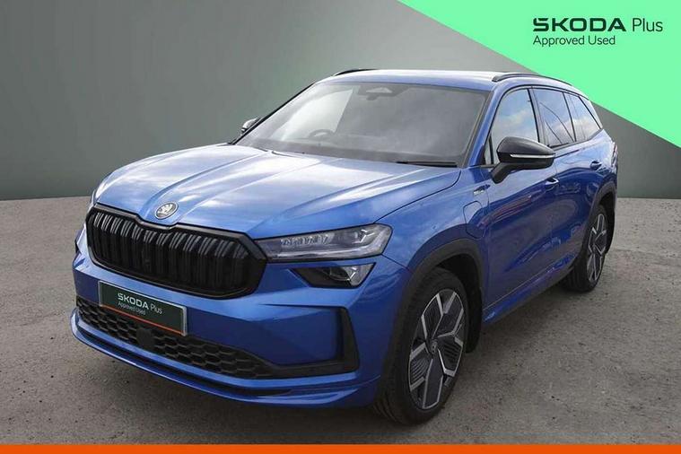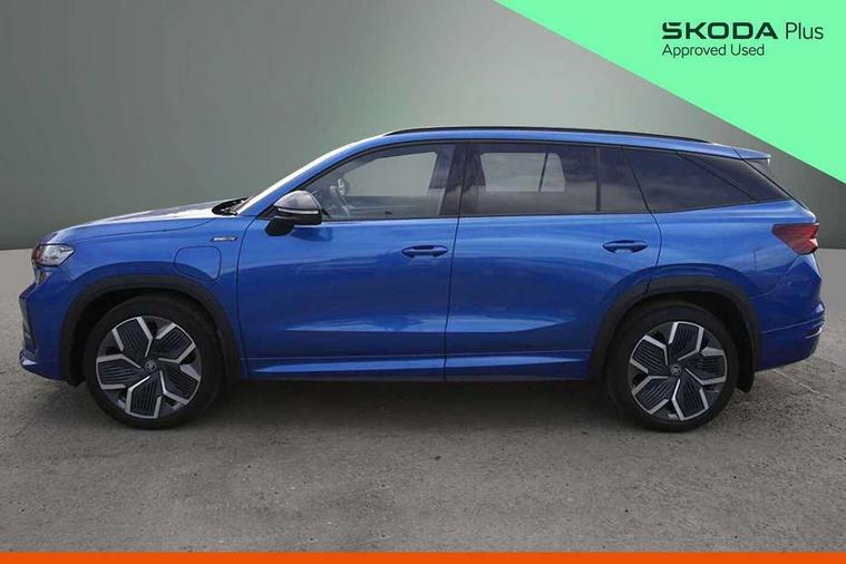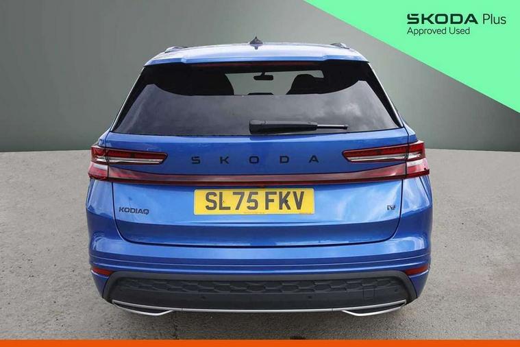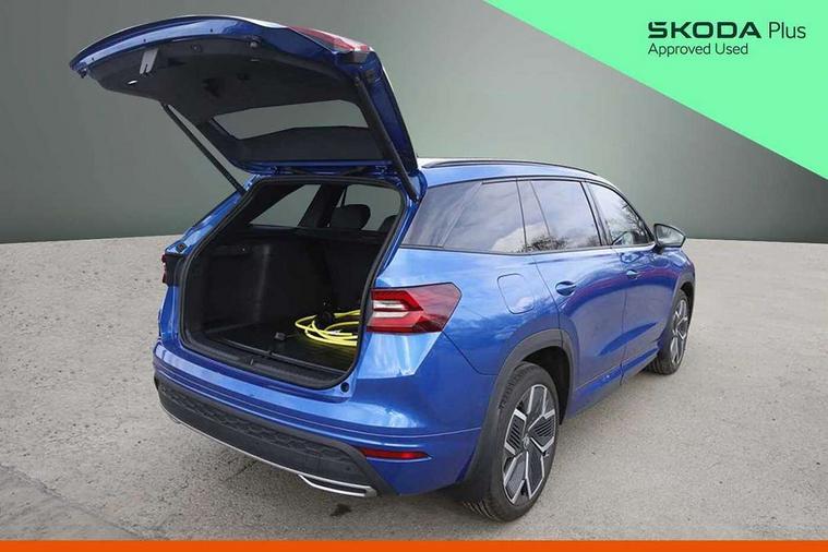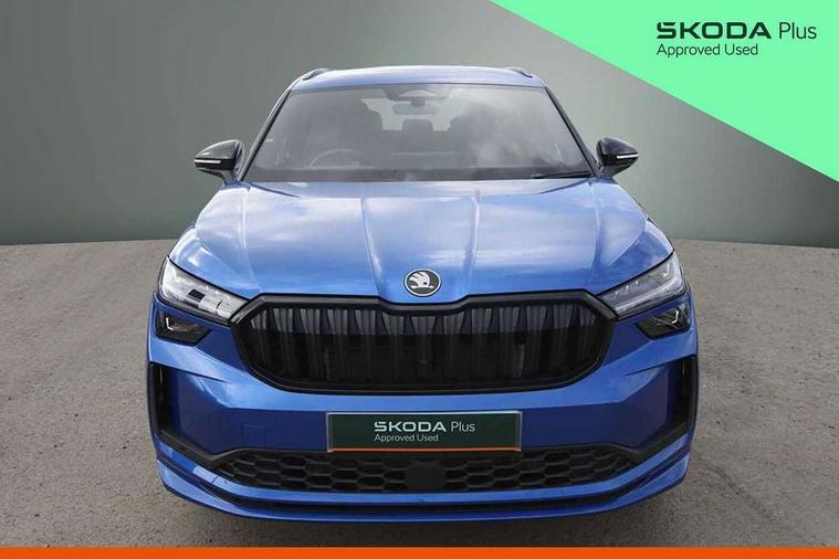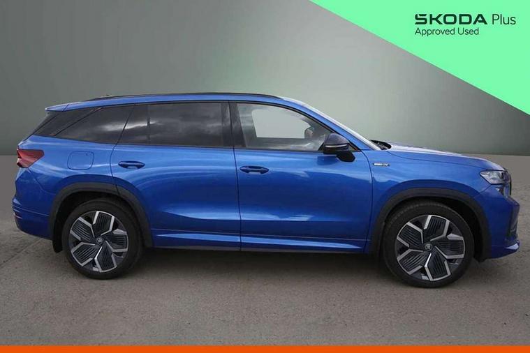 13" satellite navigation touchscreen display, Blind spot detection with door exit warning, Bluetooth system, ChatGPT functionality, Driver alert - Fatigue and drowsiness monitor, Dry display cleaner, Emergency call, Front and rear parking sensors, Front cross traffic assist, Lane assist, PAS, Rear traffic assist, Tailgate unlocking from outside, Traffic sign recognition, USB C Port x 2 in front centre console, Virtual Cockpit - 10.25" digital display, Voice control system, Wireless charging for two smartphones (15W) with cooling function, Wireless SmartLink for Apple CarPlay and Android Auto, 32A charging cable, Stop/start function, 2x USB-C in the rear, DAB Digital radio, Aero front windscreen wipers with intermittent function, Auto dimming rear view mirror, AWL (all weather lighting) and all weather light with cornering function, Black diffuser and decorative tailpipe with a unique dark chrome finish, Black roof rails, Black sports styling including front grille and window surrounds, Black wheel arch surrounds, Body colour door handles, Cornering light and poor weather light, Electric folding /adjustable/separted heated/folding door mirrors, auto dimming with boarding sports and memory function, Electric front and rear windows, Exterior black decorative trims, Front and rear sports bumpers including lower rear chrome strip, Front grille with horizontal light strip, Gloss black door mirrors, Gloss black window frame and D pillar, Heat insulating glass in windshield, Heated rear window, Ice scraper in fuel tank cap, LED daytime running lights, LED matrix headlights with AFS and LED fog lights, LED rear light with welcome effect and dynamic turn signals, LED third brake light in rear spoiler, Light assistant with automatic headlight control and coming home feature, Logo projection in door mirrors, Multiple matrix beam, Privacy glass, Rear roof spoiler, Rear side wing doors, Rear window wiper, Red decorative strip between rear LED lights, Safety reflectors on front and rear doors, Sportline badge on front fenders, Tailgate lettering in Black, Unique dark chrome design logo on alloy wheels, Window control switches with black trim, Windscreen wipers with rain sensor, Without engine designation, 1.5l bottle holder points in all door, 1x centre rear reading light, 3 configurable smart dials with 32mm coloured display, 3 seat bench in 2nd row, 3 spoke multi-function heated leather sports steering wheel with paddle shift, 4 foldable roof handles with rear coat hooks, Aluminium pedals, Ambient interior lighting - Dashboard, front-door stowage compartments, front and rear door panels and footwell lighting, Automatic gear selector on steering column, Chrome interior door handles, Driver/front passenger reading lights, Fabric headlining, Fixed bench 40:60:40 split folding backrests, Front and rear floor mats, Front centre armrest with jumbo box storage compartment, cup holder and 12V socket, Front sport seats, Height adjustable front headrests, Interior black decorative trims, Isofix child seat fittings in outer rear seats and front passenger with top tether, iV badging on boot, Manually adjustable steering column, Pollen filter, Rear centre armrest with cupholders, Rear seat boot backrest release, Single front passenger seat, Skoda lettering on steering wheel, Storage pocket including mobile phone pockets on the backs of the front seats, Sunvisors with illuminated vanity mirrors, Three rear height adjustable headrests, Ticket holder on A Pillar, Tri zone climate control, Umbrella in door panel x1 made from sustainable materials, Upper and lower glovebox with card holder and coin compartment, USB C port by rear view mirror for charging only (15W), Acoustic package - Kodiaq, Performance package - Kodiaq, Sportline design selection pack - Kodiaq, Auto door release and activation of warning lights in the event of an accident, Driver and front passenger airbag with knee airbag and front passenger airbag deactivation, Electric child locks, Electronic parking brake, ESC (incl. ABS+EMD+MSR+ASR+EDL+HBA+DSR+RBS+ESBS+MCB+TSA+XDS), Front assist with braking reaction to vehicles, pedestrians and cyclists, Front disc brakes, Fuel cut off safety device, Height adjustable front 3 point seatbelts + pretensioners, Hill hold assist, Junction assist with automatic emergency braking, Rear disc brakes, Safety vest holder in door, Seat belt reminder for all seats, Three point rear seat belts, Two tone horn, Tyre pressure monitor, Alarm with interior monitoring and tilt sensor with safe function, Anti-theft wheel bolts, Immobiliser, Remote central locking with 2 keys, 20" Rila anthacite polished alloy wheel with black matte aero covers, Breakdown kit, Tool kit,
