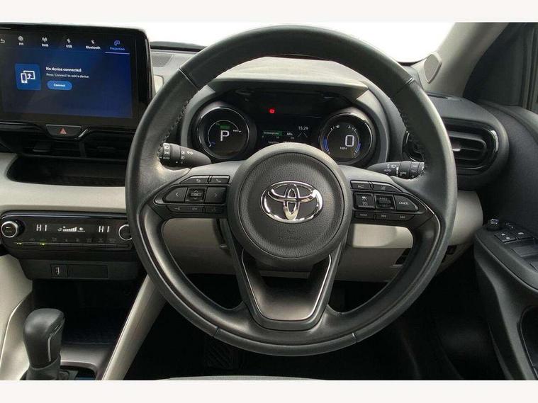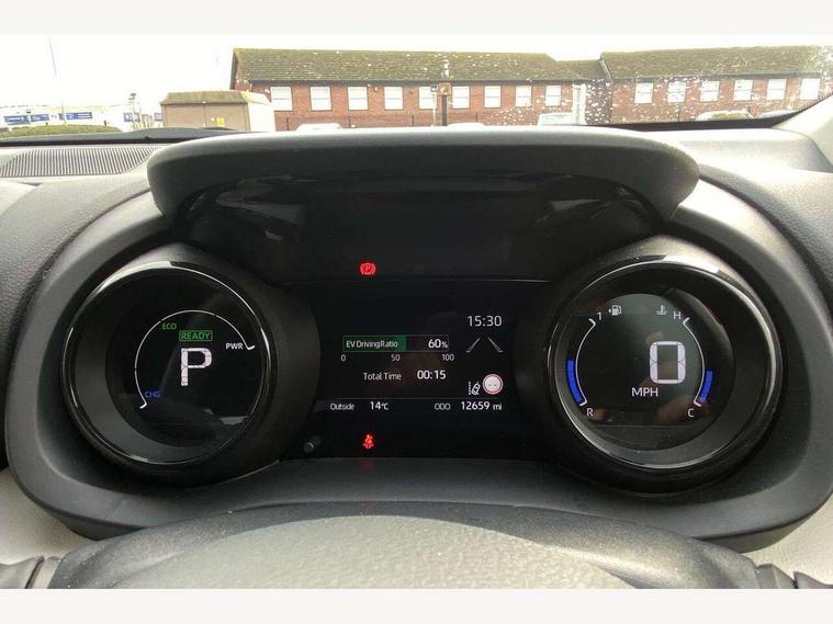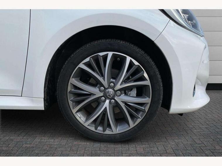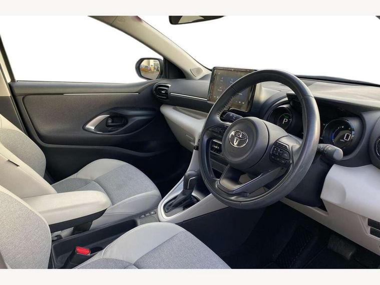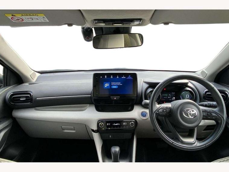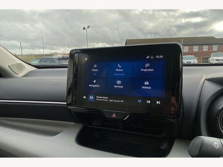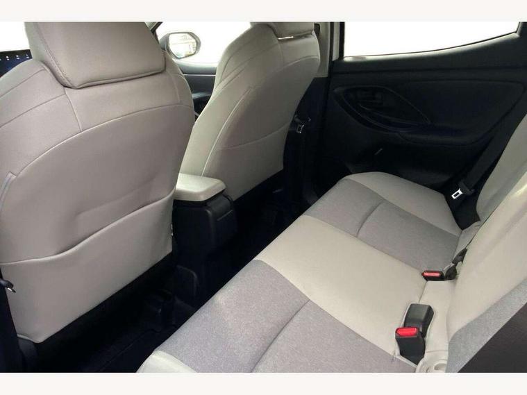 Adaptive cruise control, Adjustable speed limit with speed warning, Blind spot monitoring, Bluetooth connectivity, Colour binocular inspired displays with digital speedometer, E-call, Electric power steering, Hybrid energy display, Multi information display switches on steering wheel, Reversing camera, Smartphone integration with Apple CarPlay and Android auto, Tailgate, Touch 2 navigation system, Voice recognition, Vehicle Stability Control (VSC), 6 speakers, 9" HD multimedia display touch screen with Toyota smart connect, USB connection, Acoustic windscreen glass, Auto windscreen wipers, Automatic headlights, Automatically retractable door mirrors, Body coloured door mirrors, Electric adjustable heated door mirrors, Follow me home headlights, Front auto power windows with anti jam protection, Full LED rear lights, LED daytime running lights, LED front fog lights, LED front light guide, LED Headlights, LED High mounted stop lamp, LED Indicators, LED rear light guide, Manual headlight levelling, Painted chequered front grille, Rain sensor, Rear auto power windows with anti jam protection, Rear privacy glass, Rear side wing doors, Rear spoiler, Rear wiper, Satin lower front grille, Shark fin antenna, Turning signal integrated indicators in door mirrors, Variable front intermittent wipers, 3 adjustable rear headrests, 3 seat bench in 2nd row, 3 spoke leather steering wheel, 60/40 split folding rear seat, Active headrests, Adjustable boot height, Coat hooks in rear grab handles, Cup holders (2 front & door), Data Communication Module (DCM) connected services, Dual zone automatic air conditioning, Fabric seat with partial synthetic leather upholstery, Front armrest, Front sport seats, Glovebox, Grey roof lining, Height adjustable driver's seat, Height adjustable passenger seat, Isofix seat fixing, Leather gearshift, Map pockets on the backs of the front seats, Pollen filter, Shopping bag hooks, Single front passenger seat, Tilt/telescopic steering column, Parking pack - Yaris, 3 point seatbelts on all rear seats, ABS+EBD+Brake assist, Electronic parking brake, Emergency brake light system (EBS), Front passenger airbag on/off switch, Front seatbelt reminder, Hill start assist control (HAC), Rear child proof door locks, Rear seat belt reminder, Supplemental Restraint System (SRS) 8 airbags: Driver & passenger's airbags, dual side curtain airbags, side impact airbags, front centre airbag, Toyota Safety Sense 2, Precollison + Night time Pedestrian & Cyclist Detection, Lane Trace Assist, Auto High Beam, Intelligent ACC & Road Sign Assist, Tyre pressure warning system, 2x Master key, Alarm/immobiliser, Keyless smart entry with push button start, Remote AC via MyT, Remote locking via MyT, Remote powered central double locking doors, Satin chrome interior styling, Soft touch instrument panel, Space saver spare wheel,