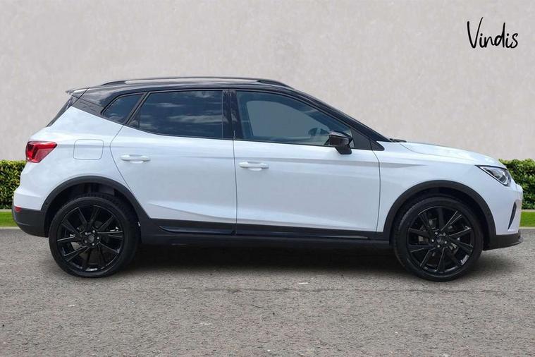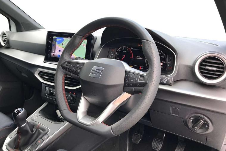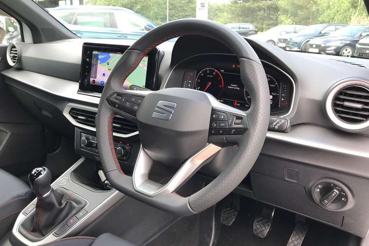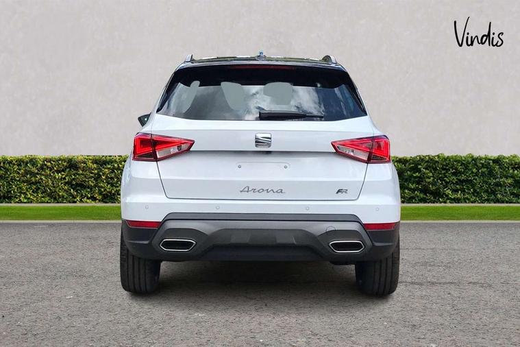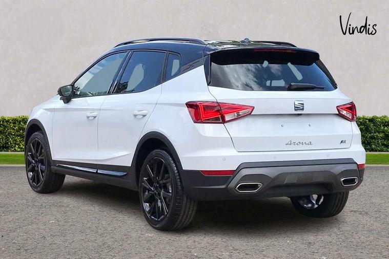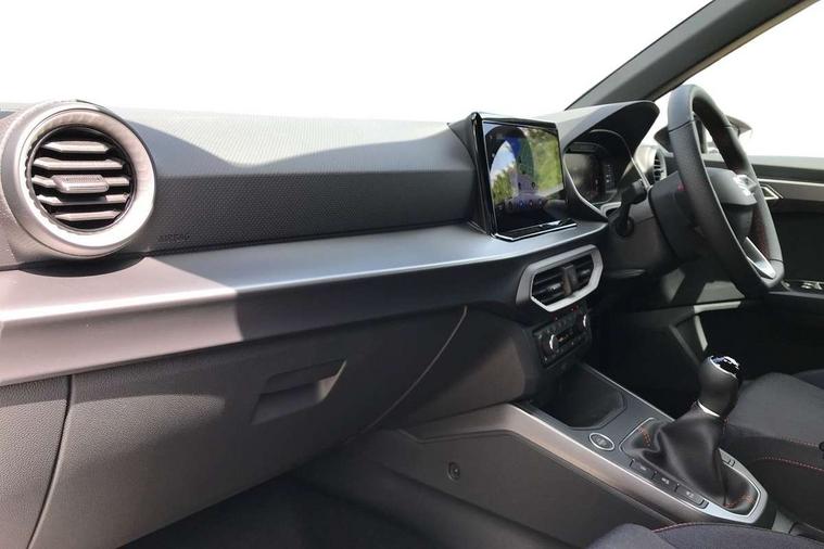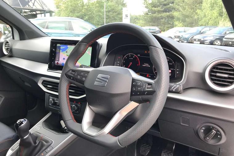 'Lights On' Reminder warning buzzer, 10" Digital cockpit, Digital clock, E-call, Electric speed sensitive power steering, Full link smartphone integration with mirror link, wireless apple carplay, Google android auto + USB Type C cable for apple and android devices, Lane keeping system, Low fuel warning light, Outside temperature display, Park assist system, Rear view camera, RPM counter, SEAT Drive profile - Four different models normal-sport-eco-individual, steering response, throttle response, Trip computer, Wireless phone charger, 9.2" colour touchscreen with navigation system, voice control and USB port (type c), Bluetooth interface for hands free and audio streaming, DAB digital radio and AM/FM radio, Steering wheel mounted audio controls, Anti theft roof antenna, Auto dimming interior rear view mirror, Automatic activation of hazard warning lights, Black roof rails and window surrounds, Black side skirts, Body coloured bumpers, Body coloured door handle inserts, Dark tinted rear windows, Electric front/rear windows, Electrically adjustable, heated and folding door mirrors, Front fog lights with cornering function and rear fog light, FULL LED automatic headlights with dynamic headlight range control, coming and leaving home, LED daytime running lights, Lasered lettering on B pillar, LED rear tail lights and licence plate lights, Protective side mouldings, Rain sensing wipers, Rear side wing doors, Rear spoiler, Rear window wash/wipe, Roof colour door mirrors, Third brake light, Twin exhaust pipe styling hidden exhaust pipe, Visible VIN plate, 2 cupholders, 3 seat bench in 2nd row, 60/40 split folding rear seat, Aircare filter, Black interior roof, Double boot floor, Driver sunvisor with covered mirror + card holder, Dual zone climate control, Front courtesy light with front reading lights, Front seat back storage pockets, Gear shift indicator, Grey interior air vents, Heated front seats, Height adjustable front seats, Height/reach adjustable steering column, Illuminated air vent surrounds, Illuminated boot, Instrument lighting with brightness control, Interior ambient lighting, Interior light in footwell, central console and door panel, ISOFIX points in outer rear seats with top tether anchorage points, Microsuede cloth upholstery, Passenger sunvisor with vanity mirror, Perforated flat bottomed leather steering wheel/gear knob/handbrake with red stitching and FR logo, Potentiometer, Single front passenger seat, Sports cloth bucket seats, Two front and three rear height adjustable headrests, Interior chrome pack - Arona, Safe and driving pack (S) - Arona, Safety and driving pack (M) - Arona, ABS, Active front headrests, Child locks on rear doors, Driver and front passenger airbags with front passenger airbag de activation, front side and curtain airbags, Emergency Brake Assist (EBA) and front assist, Front and rear seatbelt reminder, Hill hold control, Multi-Collision braking, Tiredness recognition system, Traction control, Tyre pressure monitoring system, Alarm with back up horn with tow away protection, Deadlock, Electronic engine immobiliser, KESSY Keyless entry and go, Locking wheel bolts, Remote central locking, Titan black dashboard, 18" Black alloy wheels,