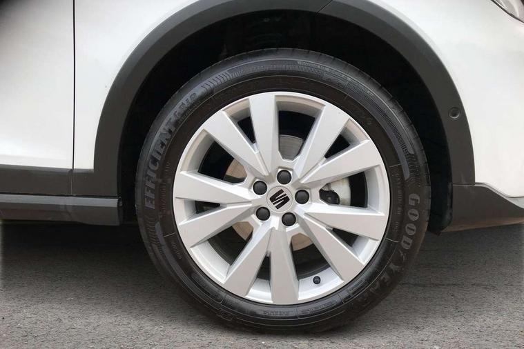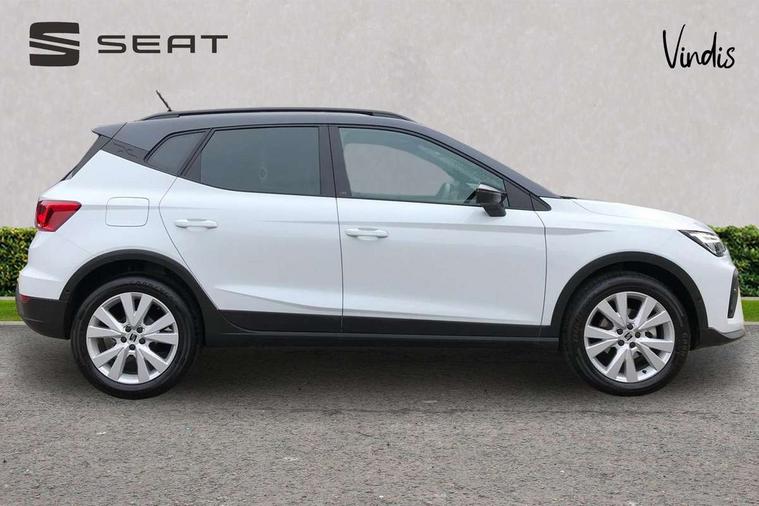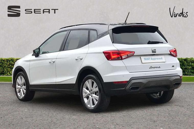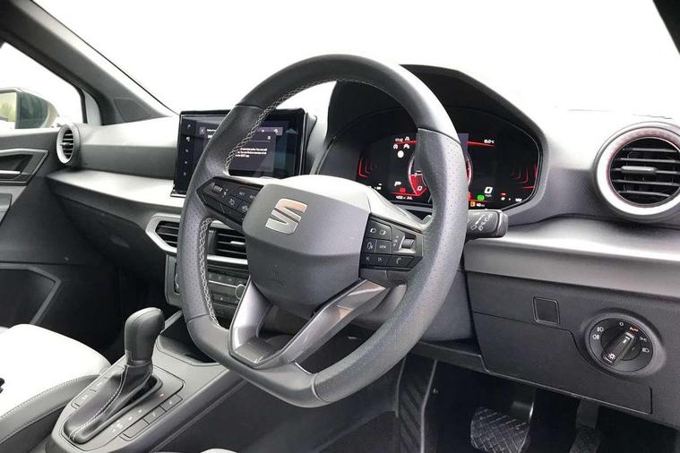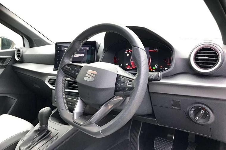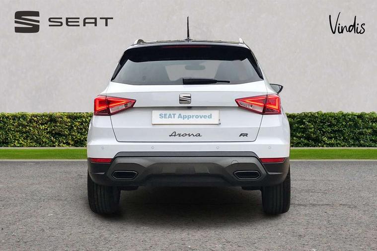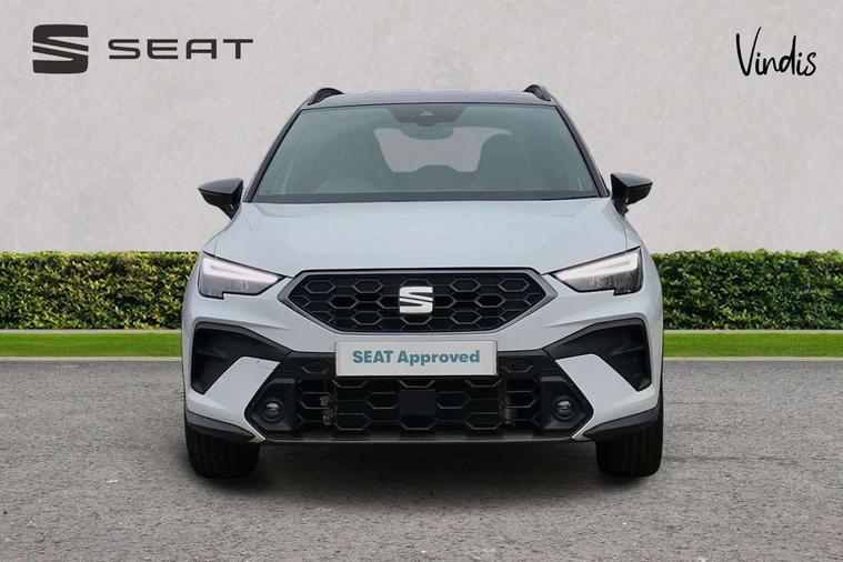 'Lights On' Reminder warning buzzer, 8" Digital cockpit, Digital clock, E-call, Electric speed sensitive power steering, Front parking sensors, Full link smartphone integration with mirror link, wireless apple carplay, Google android auto + USB Type C cable for apple and android devices, Low fuel warning light, Outside temperature display, Rear view camera, RPM counter, SEAT Drive profile - Four different models normal-sport-eco-individual, steering response, throttle response and gear shifts mode, Trip computer, Wireless phone charger, 9.2" colour touchscreen with navigation system, voice control and USB port (type c), Bluetooth interface for hands free and audio streaming, DAB digital radio and AM/FM radio, Steering wheel mounted audio controls, Anti theft roof antenna, Auto dimming interior rear view mirror, Automatic activation of hazard warning lights, Black roof rails and window surrounds, Body coloured bumpers, Body coloured door handle inserts, Dark tinted rear windows, Electric front/rear windows, Electrically adjustable, heated and folding door mirrors, Front fog lights with cornering function and rear fog light, LED 3rd brake light, LED daytime running lights, LED rear tail lights and licence plate lights, Protective side mouldings, Rain sensing wipers, Rear side wing doors, Rear spoiler, Rear window wash/wipe, Roof colour door mirrors, SEAT design Full LED automatic headlamps with dynamic headlight range control, coming and leaving home feature, Twin exhaust pipe styling with double flow exhaust pipe, Visible VIN plate, 2 cupholders, 3 seat bench in 2nd row, 60/40 split folding rear seat, Aircare filter, Black headliner, Cloth upholstery with embossed textile/Sport bucket seats, Double boot floor, Driver sunvisor with covered mirror + card holder, Dual zone climate control, Front courtesy light with front reading lights, Front seat back storage pockets, Heated front seats, Height adjustable front seats, Height/reach adjustable steering column, Illuminated air vent surrounds, Interior ambient lighting, Interior light in footwell, central console and door panel, ISOFIX points in outer rear seats with top tether anchorage points, Passenger sunvisor with vanity mirror, Perforated flat bottomed leather steering wheel/gear knob/handbrake with red stitching and FR logo, Red coloured interior air vents, Single front passenger seat, Steering wheel mounted gearshift paddles, Two front and three rear height adjustable headrests, Interior chrome pack - Arona, Safe and driving pack (S) - Arona, Storage pack - Arona, 3 point seatbelts on all rear seats, ABS, Active front headrests, Child locks on rear doors, Driver and front passenger airbags with front passenger airbag de activation, front side and curtain airbags, Emergency Brake Assist (EBA) and front assist, Front and rear seatbelt reminder, Hill hold control, Multi-Collision braking, Tiredness recognition system, Traction control, Tyre pressure monitoring system, Anti-theft alarm (perimeter and interior monitoring) with backup horn and towing protection, Central locking with radio remote control, interior controls and SAFELOCK, Deadlock, Electronic engine immobiliser, KESSY Keyless entry and go, Locking wheel bolts, 17" Dynamic alloy wheels in brilliant silver,