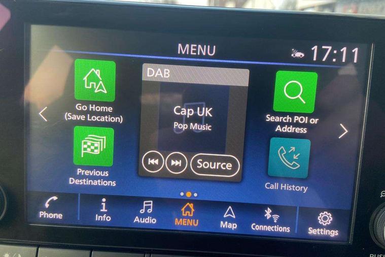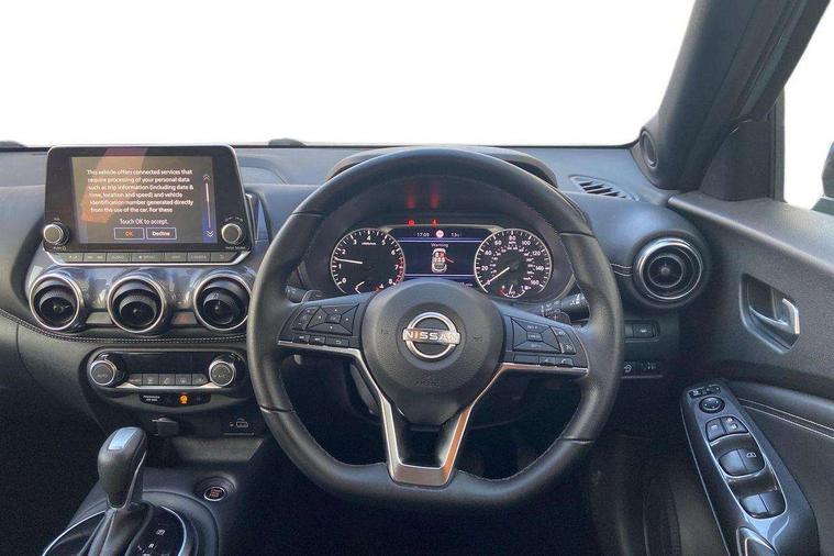 7" full colour TFT screen combimeter, Apple CarPlay and Google Android auto, Drive modes select (Eco, normal and sport), Emergency and breakdown call, Front parking sensor, Idle start/stop system, Intelligent lane intervention, Lane departure warning system, Nissan connect 8" touch screen entertainment system, Nissan connect nav with TomTom traffic, Nissan connect services and Wifi connection, Outside temperature sensor, Power Steering, Rear parking sensor, Traffic sign recognition, Trip computer, Voice recognition, Gasoline particulate filter, 6 speakers, Bluetooth system, USB, Aux-in and 12V socket, DAB Digital radio, Rear console USB port, Auto dimming interior rear view mirror, Auto headlights, Automatic hazard signal with emergency stop signal, Body colour bumpers, Body colour door handles, Electrically adjustable door mirrors with integrated indicators, Follow me home headlights, Front and rear electric window with one touch driver window, Heated and auto folding door mirrors, High beam assist, LED daytime running lights, LED headlamps, LED rear fog lamp, LED rear lamps, Rain sensor windscreen wipers, Rear privacy glass, Rear side wing doors, Rear wiper, Shark fin roof antenna in Pearl Black, Three blink turn signal, 3 height adjustable rear headrests, 3 seat bench in 2nd row, 60/40 split folding rear seat, Automatic climate control, Card holder on driver sunvisor, Cloth upholstery with black and metallic grey syntech leather inserts, Driver and passenger sliding and reclining seats, Driver side rear coat hanger, Driver/passenger sunvisors and vanity mirrors, Front and rear cabin lights, Front armrest, Front door pockets with bottle holders, Front head restraints, Front/rear passenger grab handles, Grey synthetic leather kneepad, Height adjustable driver's seat, Internal chrome door handles, Leather gearshift knob, Leather steering wheel, Luggage board, Luggage space lighting, Monoform sporty seats, Multifunction steering wheel, Rear door bottle holders, Single front passenger seat, Steering wheel mounted gearshift paddles, Telescopic steering wheel adjustment, Two cupholders in front centre console, Two rear isofix child seat anchorage points with top tether, Welcome light and console tray ambient lighting, ABS with EBD and brake assist, Active ride control, Active Trace Control, Driver and passenger airbags, Driver and passenger side airbags, Electric handbrake with auto hold function, Electronic Stability Programme (ESP), Front and rear curtain airbags, Height adjustable seatbelts, Hill start assist, Intelligent emergency braking with pedestrian and cyclist recognition, Rear door child safety locks, Seatbelt reminder for driver/front passenger and rear seats, Single tone horn, Three 3 point rear seatbelts, Traction control, Tyre pressure monitoring system, VDC Dynamic Vehicle Control, Ventilated rear brake discs, Alarm, Immobiliser, Intelligent key and start push button with walk away lock and approach unlock functions, Remote central locking,