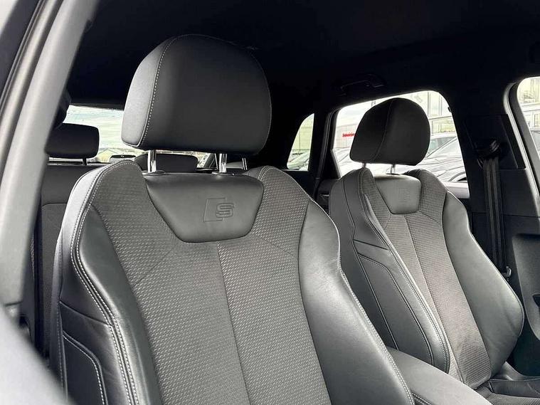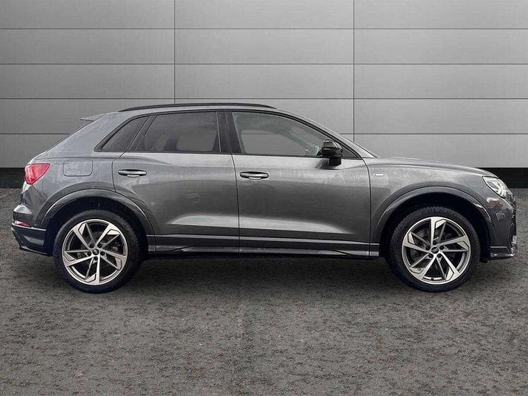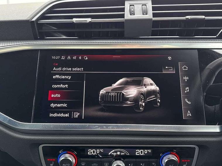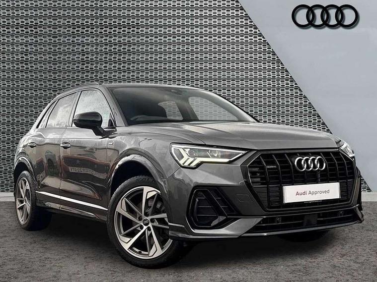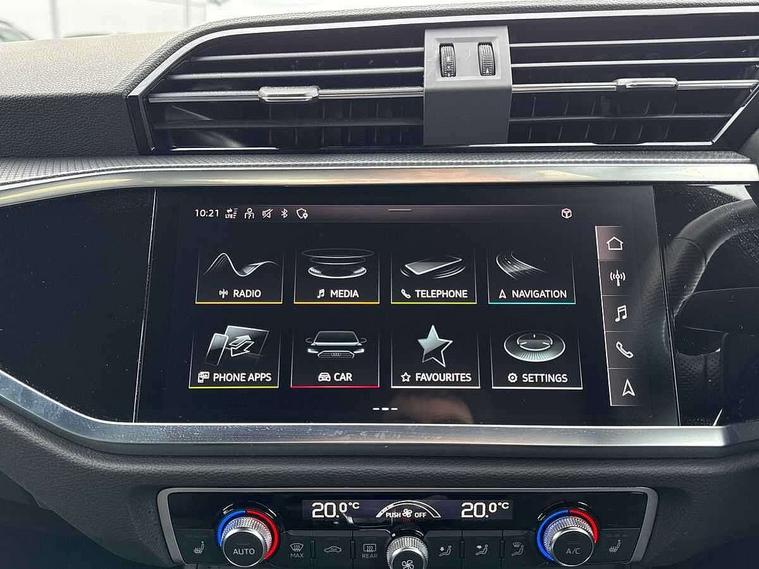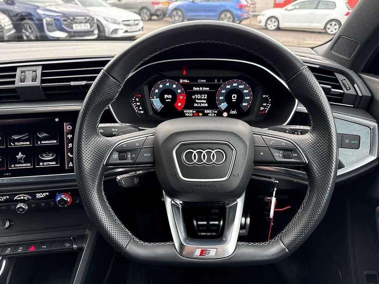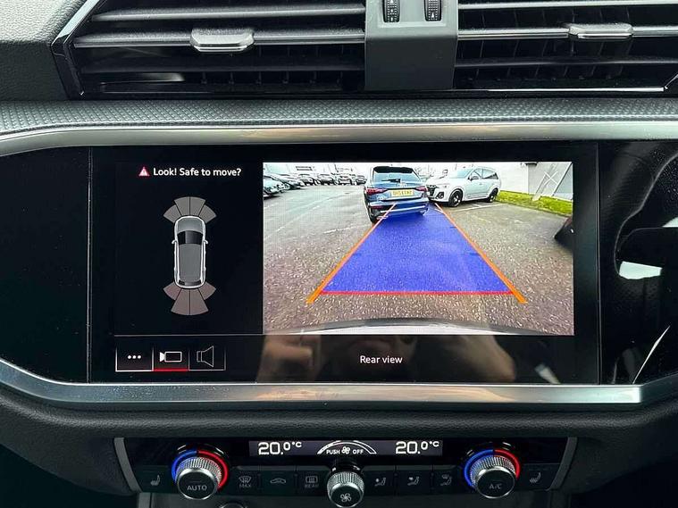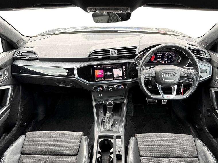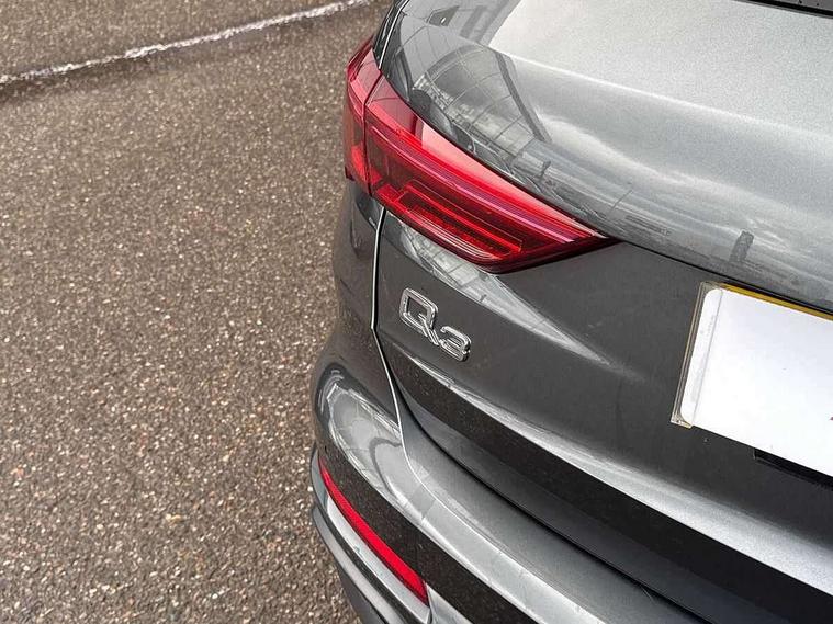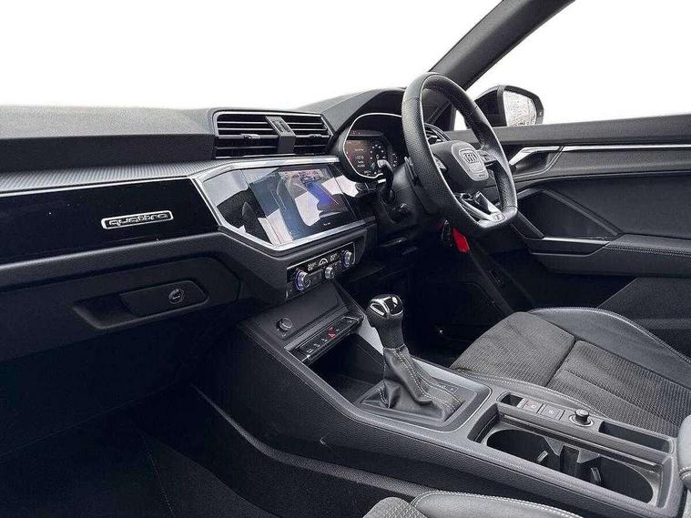 Amazon alexa Integration, Audi connect safety and service (e-call), Audi drive select, Audi lane departure warning, Audi Virtual Cockpit - 10.25" display, Bluetooth interface, Camera based traffic sign recognition, MMI Navigation Plus with high resolution 10.1 inch touchscreen colour display, Power operated tailgate, Progressive steering, Service interval indicator, Smartphone interface includes wireless Apple carplay/Android Auto, Start stop system with recuperation, Voice control system with natural language interaction, Sports suspension, 2 USB-C ports with charge and data functions, 6 passive loudspeakers, DAB digital radio module, Acoustic windscreen, Auto dimming frameless rear view mirror, Black roof rails, Electrically folding, adjustable and heated door mirrors with integrated LED side indicators and kerb view function for passenger side, Front and rear electric windows, Front fog lights, Grille vertical bars in aluminium silver/Matt, High gloss black finish B and C pillars, LED headlights with LED daytime running lights and dynamic rear indicator, LED rear lights, Privacy glass dark tinted rear and rear-side windows (from B-pillar backwards), Rain and light sensors, Rear diffuser strip in matt titanium black, Rear side wing doors, Rear wiper, S line bumpers in contrasting Manhattan grey, Third brake light, Tinted rear windows, Variable front intermittent wipers, 12V socket in rear centre console, 3 seat bench in 2nd row, 40:20:40 folding with manual adjustment for 60:40 forwards/backwards position and backrest angle, Adjustable rear seat bench/backrest with centre armrest and cupholder, Black cloth headlining, Dual zone electronic climate control, Front and rear black floor mats with contrast stitching in rock grey, Front and rear headrests, Front and rear roof module including reading lights, Front centre armrest, Glove compartment lighting, Height and reach adjustable steering wheel, Illuminated door sill trims with S logo, ISOFIX child seat mounting for front passenger with airbag deactivation and outer rear seat including top tether attachment point for outer rear seats, Luggage compartment light, Manual front seats with height adjustment, Perforated leather gearknob, Single front passenger seat, Stainless steel luggage compartment sill finisher, Stainless steel pedals, Black styling pack - Q3, Non smoking pack - Q3, 3x3 point rear seatbelts, 6 airbags - Driver, front passenger, curtain and side windows, Audi pre-sense front with pedestrain and cyclist recognition, Electrically operated child locks on rear doors, Electromechanical parking brake, Electronic stabilisation control including ABS, ASR and EDL, Front seatbelt reminder, Hill descent control, Hill hold assist, Pre sense basic, Seatbelt monitoring, Tyre pressure warning, Warning triangle and first aid kit, Anti theft alarm, Anti theft wheel bolts, Immobiliser, Remote central locking, Detail dashboard around MMI touch colour display in glass look, black with surround in aluminium look, Leatherette door armrest, Piano black inlay,
