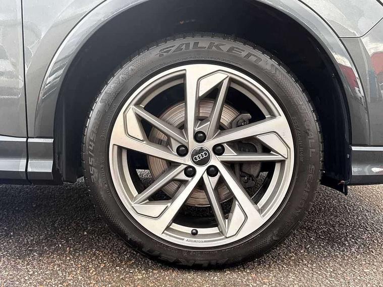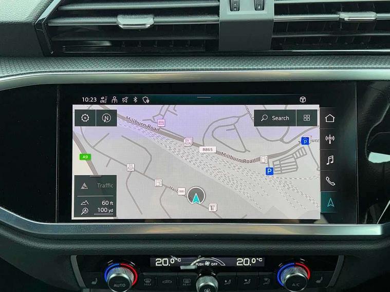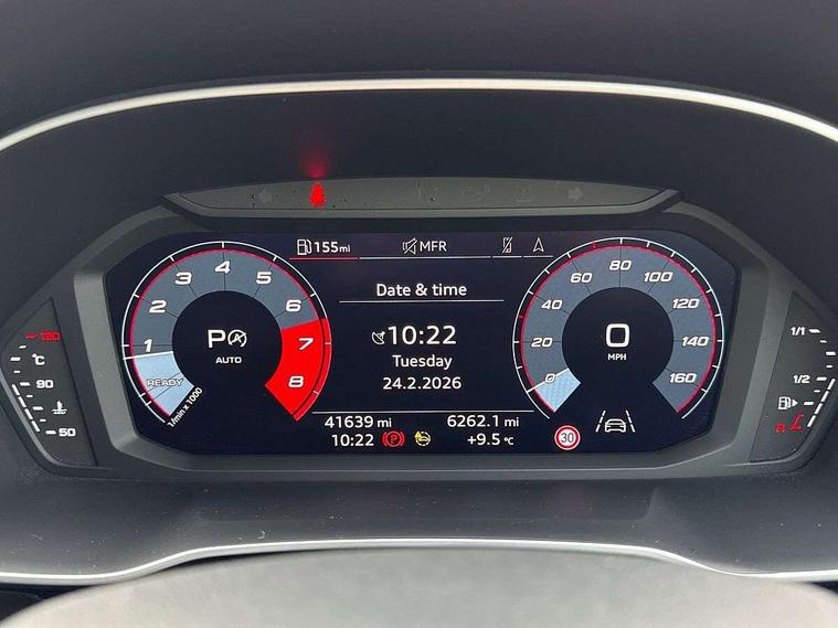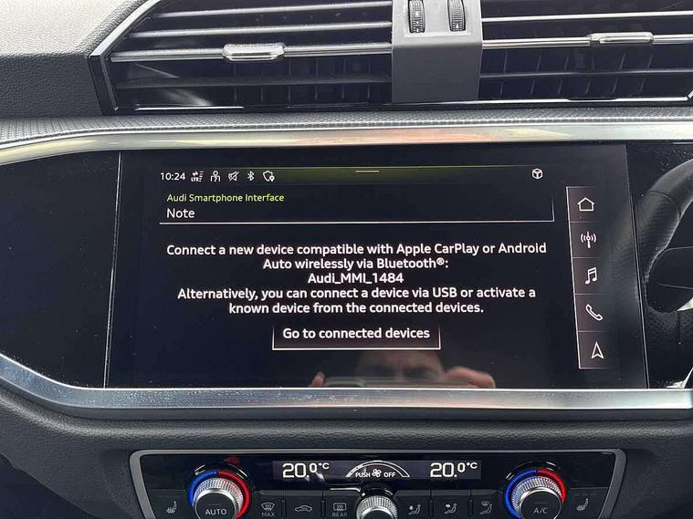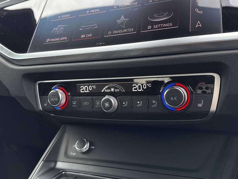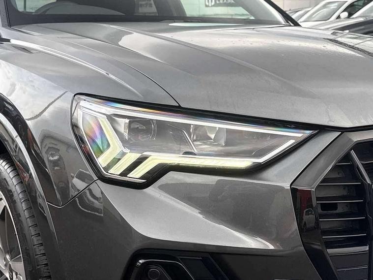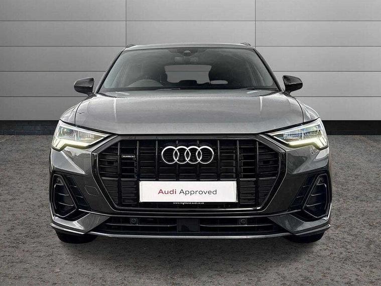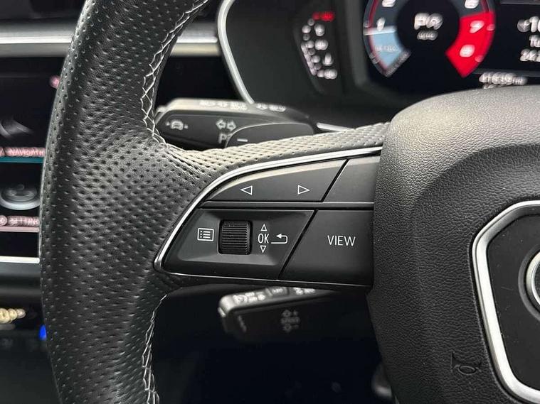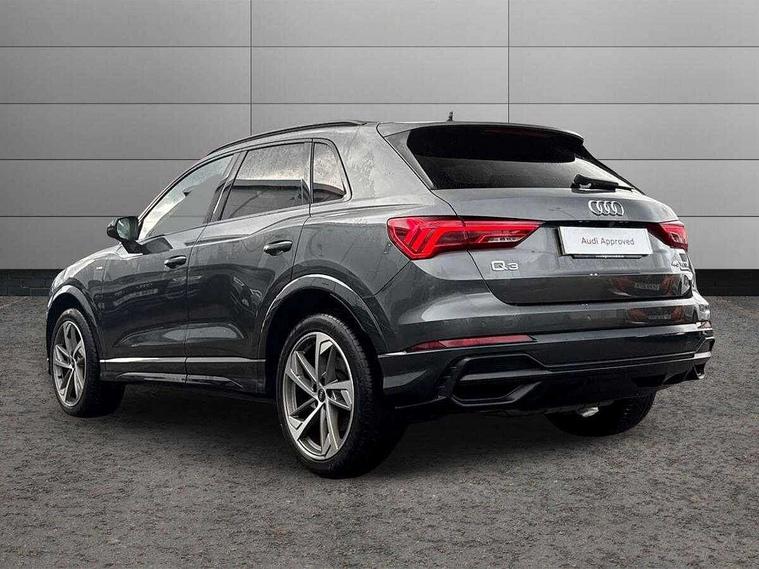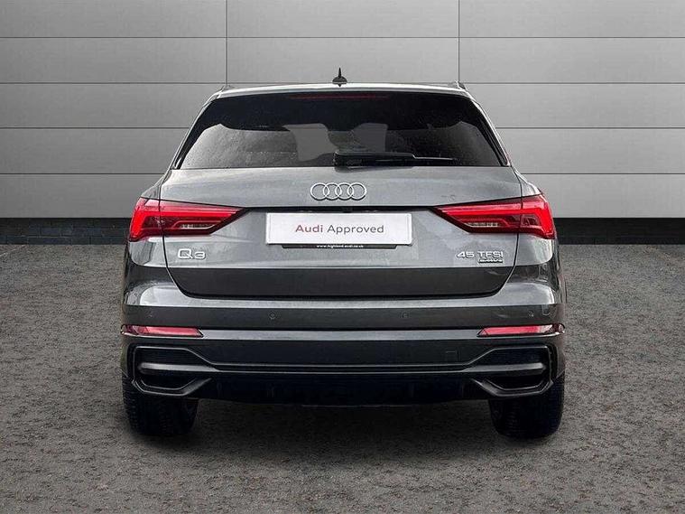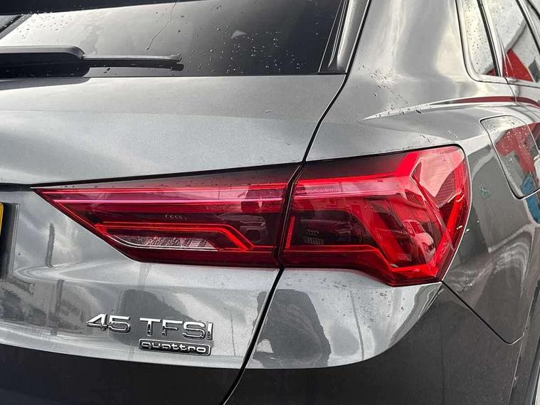 Amazon alexa Integration, Audi connect safety and service (e-call), Audi drive select, Audi lane departure warning, Audi Virtual Cockpit - 10.25" display, Bluetooth interface, Camera based traffic sign recognition, MMI Navigation Plus with high resolution 10.1 inch touchscreen colour display, Power operated tailgate, Progressive steering, Service interval indicator, Smartphone interface includes wireless Apple carplay/Android Auto, Start stop system with recuperation, Voice control system with natural language interaction, Sports suspension, 2 USB-C ports with charge and data functions, 6 passive loudspeakers, DAB digital radio module, Acoustic windscreen, Auto dimming frameless rear view mirror, Black roof rails, Electrically folding, adjustable and heated door mirrors with integrated LED side indicators and kerb view function for passenger side, Front and rear electric windows, Front fog lights, Grille vertical bars in aluminium silver/Matt, High gloss black finish B and C pillars, LED headlights with LED daytime running lights and dynamic rear indicator, LED rear lights, Privacy glass dark tinted rear and rear-side windows (from B-pillar backwards), Rain and light sensors, Rear diffuser strip in matt titanium black, Rear side wing doors, Rear wiper, S line bumpers in contrasting Manhattan grey, Third brake light, Tinted rear windows, Variable front intermittent wipers, 12V socket in rear centre console, 3 seat bench in 2nd row, 40:20:40 folding with manual adjustment for 60:40 forwards/backwards position and backrest angle, Adjustable rear seat bench/backrest with centre armrest and cupholder, Black cloth headlining, Dual zone electronic climate control, Front and rear black floor mats with contrast stitching in rock grey, Front and rear headrests, Front and rear roof module including reading lights, Front centre armrest, Glove compartment lighting, Height and reach adjustable steering wheel, Illuminated door sill trims with S logo, ISOFIX child seat mounting for front passenger with airbag deactivation and outer rear seat including top tether attachment point for outer rear seats, Luggage compartment light, Manual front seats with height adjustment, Perforated leather gearknob, Single front passenger seat, Stainless steel luggage compartment sill finisher, Stainless steel pedals, Black styling pack - Q3, Non smoking pack - Q3, 3x3 point rear seatbelts, 6 airbags - Driver, front passenger, curtain and side windows, Audi pre-sense front with pedestrain and cyclist recognition, Electrically operated child locks on rear doors, Electromechanical parking brake, Electronic stabilisation control including ABS, ASR and EDL, Front seatbelt reminder, Hill descent control, Hill hold assist, Pre sense basic, Seatbelt monitoring, Tyre pressure warning, Warning triangle and first aid kit, Anti theft alarm, Anti theft wheel bolts, Immobiliser, Remote central locking, Detail dashboard around MMI touch colour display in glass look, black with surround in aluminium look, Leatherette door armrest, Piano black inlay,