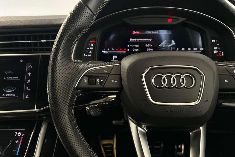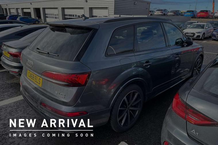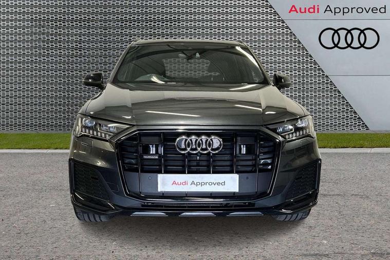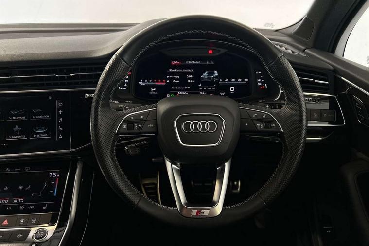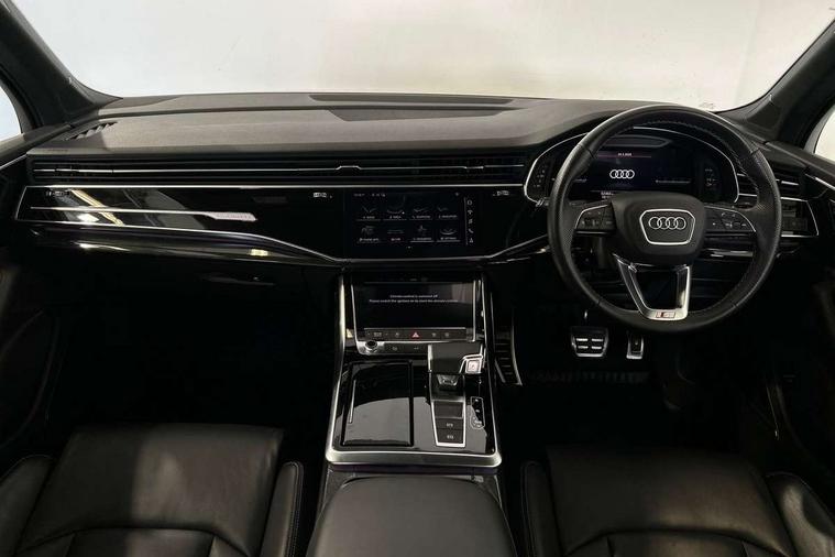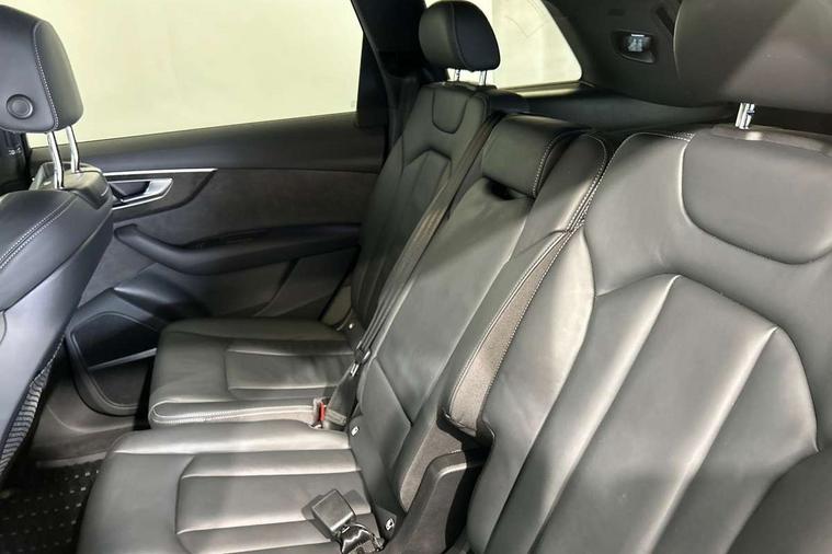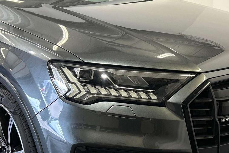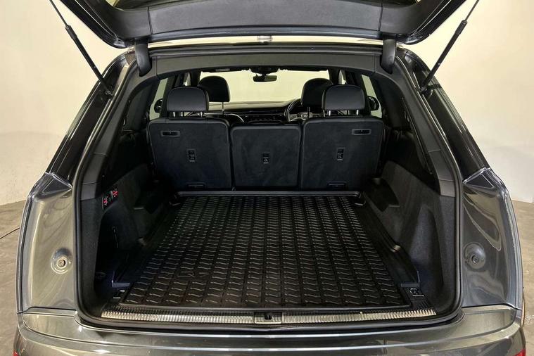 Audi connect safety and service (e-call), Audi connect with Amazon Alexa Integration, Audi drive select (Auto, Comfort, Dynamic, Efficiency, Individual, Off-road and All road), Bluetooth interface, Camera based traffic sign recognition, Electromechanical steering, MMI navigation plus with MMI touch screens includes 10.1" and 8.6" screens with haptic feedback, Natural voice recognition, Parking system plus with 360 degree display (front, rear and side sensors) - acoustic and visual park assist system, Power operated tailgate, Rear view camera, Smartphone interface includes wireless Apple carplay/Android Auto, Start/stop system, 48V Mild hybrid technology, Adaptive air sports suspension, Quattro all wheel drive with self locking centre differential, Audi music interface - front 2 USB-C ports with charger and data functions, Audi sound system with 6 channel amplifier, 180 watt amplifying capacity and 10 loudspeakers including subwoofer, DAB digital radio module, 3rd brake light, Audi matrix LED headlights with dynamic front and rear indicators, Auto dimming frameless rear view mirror, Black roof rails, Bumpers in contrast paint scandium grey finish includes door trim and wheel arch trim strips, inlays in door strip contain quattro embossing, Electrically adj heated/folding + automatically dimming exterior mirrors with memory + automatic kerb side function for passenger side exterior mirror, Heat insulating glass in windshield, Integrated LED indications in door mirrors, LED daytime running lights, LED rear tail lights, Privacy glass - dark tinted rear and rear side windows from B-pillar backwards, Rear side wing doors, Rear wiper, 2 seat bench in 3rd row, 3 seat bench in 2nd row, 4 zone deluxe automatic climate control, 7 seat layout with ISOFIX points for the front passenger seat and rear passenger seat, Black cloth headlining, Comfort front centre armrest, Electric adjustable front seat with 4 way lumbar support, driver memory functionality, Folding rear seats, Front head restraints, Front/rear floor mats, Heated front seats, Illuminated door sill trims with S logo, LED interior ambient lighting, Luggage compartment cover, Luggage compartment sill protection in stainless steel, Rear head restraints, Single front passenger seat, Stainless steel pedals, Sunvisors with illuminated vanity mirrors, Titanium black styling pack - Q7/SQ7, 3 point seatbelts on all rear seats, Audi pre sense front, Child locks on rear doors, Driver and front passenger, front side and curtain airbags, Electromechanical parking brake, Electronic Stabilisation Control (ESC) including ABS, ASR and EDL, Extended pedestrian protection measures, Hill hold assist, Seatbelt monitoring, Tyre pressure loss indicator, Warning triangle and first aid kit, Anti theft alarm, Anti-theft wheel bolts and wheel loosening detection, Keyless Go, Remote central locking, Polished oak trim with grey finish inlay, Tool kit, Tyre repair kit,