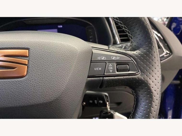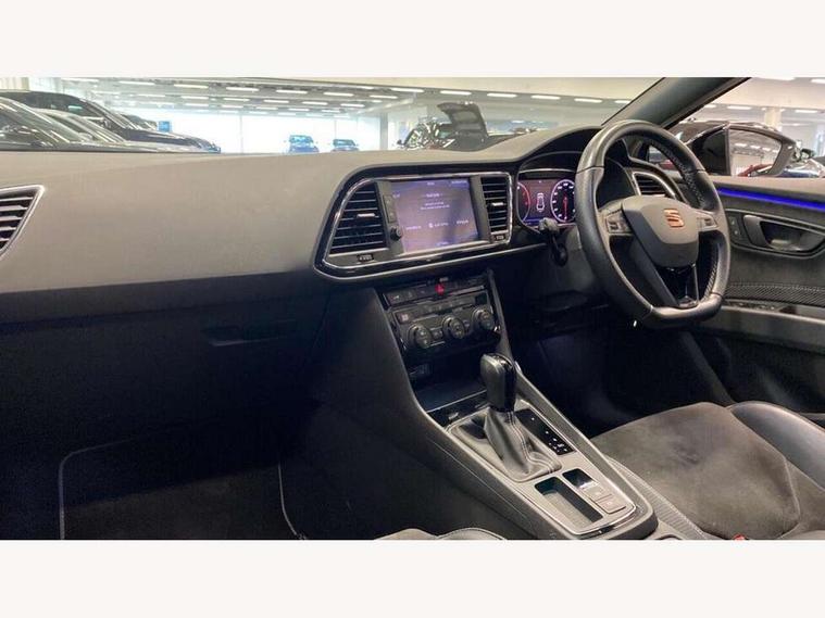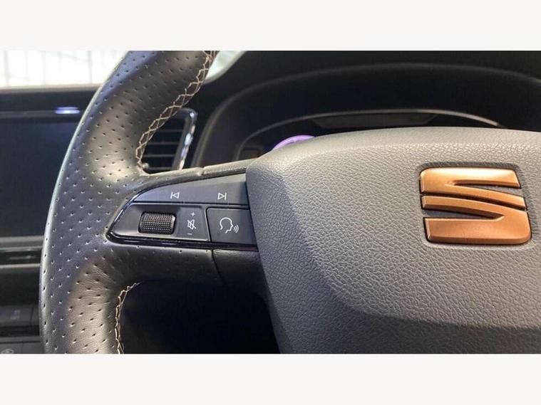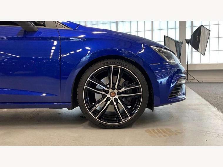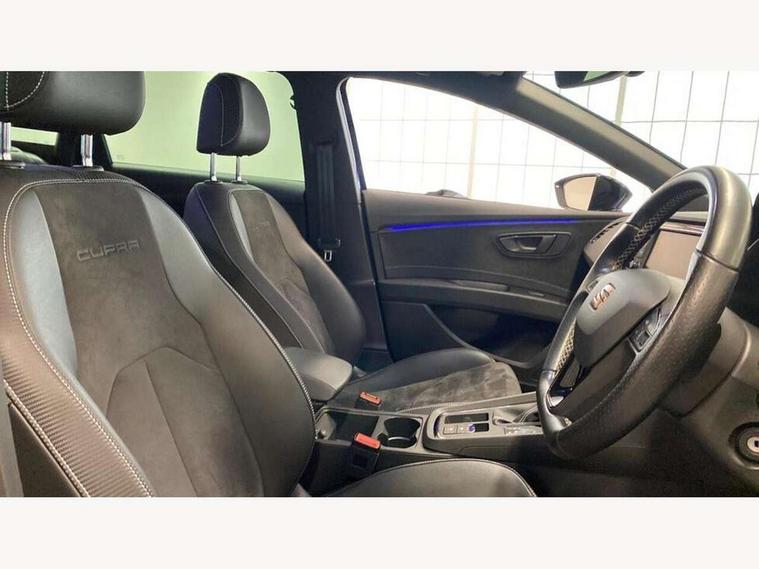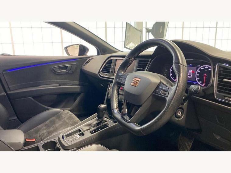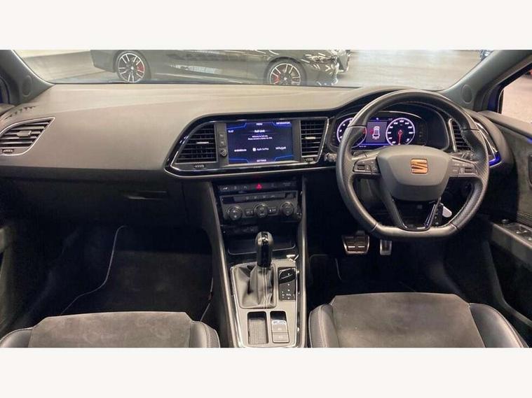 'Lights On' Reminder warning buzzer, 3D map display, 8" touch screen, Bluetooth Handsfree Phone Connection, CUPRA performance interface, Digital cockpit, Electro-mechanical progressive power assisted steering, Front and rear parking sensors, Front assist with pedestrian protection, Full Link Smartphone Integration with Mirror Link, Apple Car Play, Google Android Auto, Low fuel warning light, Navigation system (incl. media system plus), Outside temperature gauge, RPM counter, SEAT Drive profile CUPRA, SEAT logo boot release, Service interval indicator, Trip computer, Voice recognition, Dynamic chassis control, Lowered suspension, Mechanical limited slip differential, XDS electronic differential lock, 2x SD card slot, 4 USB, 8 speakers, Auxiliary input socket, Bluetooth audio streaming, CD player, DAB Digital radio, High resolution colour driver display, Media system plus (incl. media system colour), SEAT USB media cable, Steering wheel mounted audio/phone controls, Black radiator grille, Black roof rails, Body colour door handles, Body coloured bumpers, Dark tinted rear windows, Electric front/rear windows, Electrically adjustable door mirrors, Electrically foldable exterior mirrors with parking position and passenger-side mirror with lowering function, Exclusive Cupra front and rear bumpers, Gloss black exterior mirrors with integrated LED indicators, Heated door mirrors, High gloss black finish B and C pillars, High gloss black front grille surround, Illuminated aluminium front door sill with CUPRA logo, LED front fog lights, LED headlights with LED day time running lights + LED rear lights + LED number plate lights, LED rear fog light, Rear wash/wipe, Visible dual exhaust pipes, 12v power point in centre console, 60/40 split folding rear seat with armrest, Active front headrests and 3 rear headrests, Additional heating and ventilation outlet in rear of centre console, Black roof lining, Boot storage net, Cargo rings in boot, Double boot floor, Driver and passenger seat height adjust, Driver and passenger sun visor, covered and illuminated mirror, driver sun visor with card holder, Driver seat lumbar adjustment, Dual zone climate control, Dust/pollen filter, Flat bottomed perforated leather steering wheel with white stitching and CUPRA logo, Front adjustable head restraints, Front armrest with storage box, Front cupholders x 2, Front seatback storage pockets, Front sport seats in alcantara, Front/rear floor mats, Gear shift indicator, Height/reach adjust steering wheel, High centre console with integrated box & cup holder, rear air outlet, with armrest in front seats, Illuminated door sills, Instrument lighting with brightness control, Interior copper and black detailing, Luggage compartment cover, Luggage tie-down hooks, Multi-colour ambient interior lighting, Passenger seat lumbar adjust, Pedals with Aluminium Cover, Rear top tether child seat ISOFIX attachment, Steering wheel gearshift paddles, Storage box under drivers and passenger seat, 3 point seatbelts on all rear seats, 7 airbags - 2 front, 2 front side, 2 curtain, 1 knee, ABS + TCS, Child proof door locks, Electric handbrake, Electronic parking brake with auto hold, ESC with switch off key, ESC with tyre pressure warning indicator, ESP+EBA, Front and rear black brake calipers with cupra logo, Front seatbelt pretensioners, Front seatbelt reminder, Hill hold control, Multi-Collision braking, Passenger airbag deactivation system, 2 folding remote keys with window open/close function and boot opening/door mirror folding function, Central locking fuel filler cap, Engine immobiliser, Locking wheel bolts, Remote central locking + deadlocks, Volumetric alarm with back up horn, Gloss black interior detailing, 19" Cupra Machined alloy wheels 30/2,