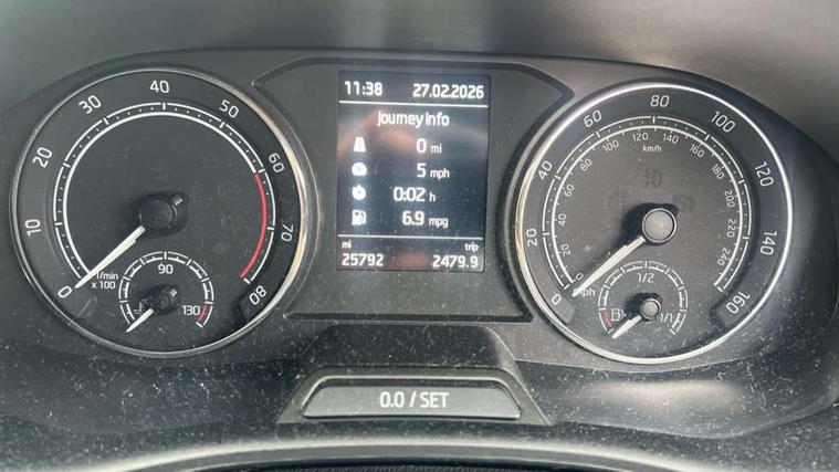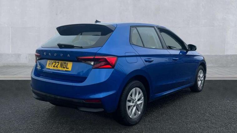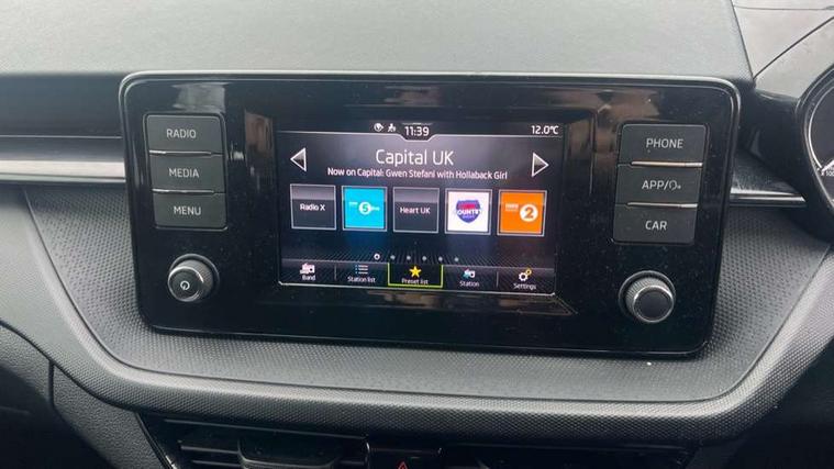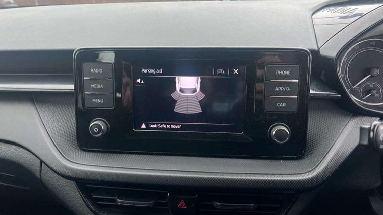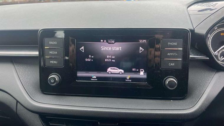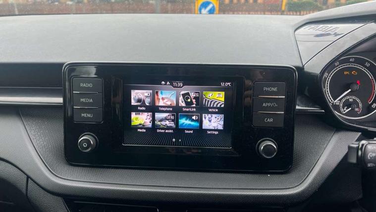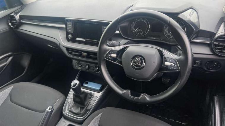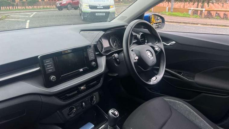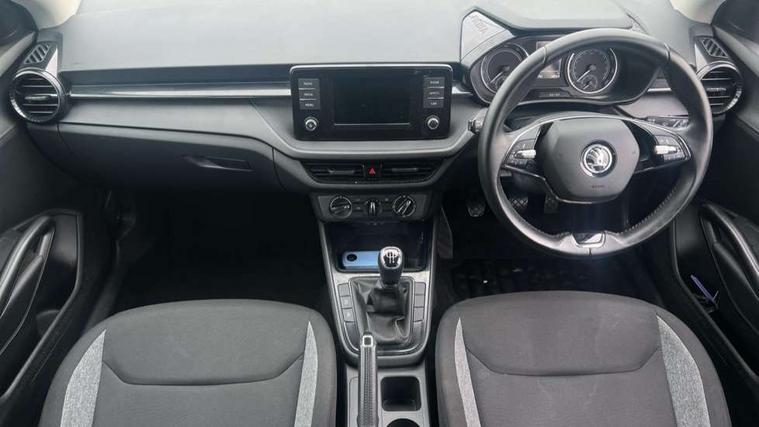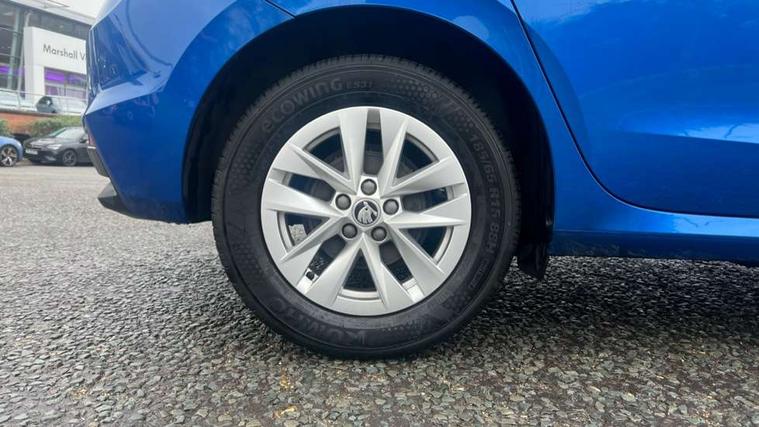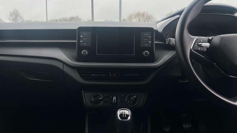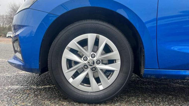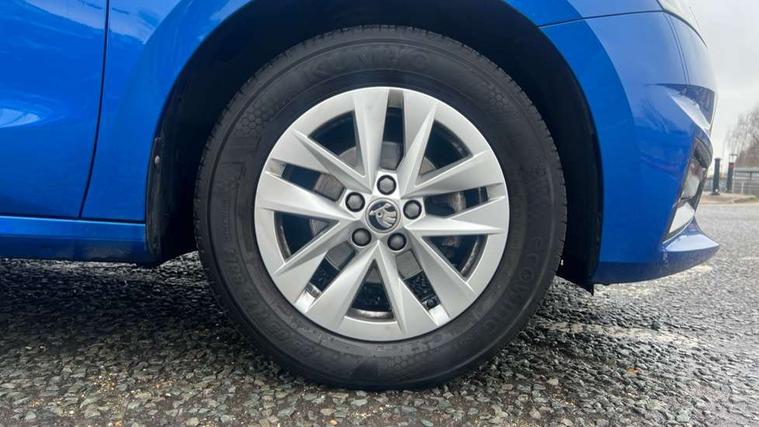 Bluetooth connection, Driver alert system - DAS, Electromechanical power steering, Exterior temperature gauge, Lane assist including road edge detection, Multifunction trip computer in black and white, Service interval indicator, Speed limiter, 2x USB-C in the front (for data transmission and charging), 4 speakers in front, Auxiliary socket for external MP3 player, DAB digital radio reception, Radio Swing with 6.5" colour display, Basic LED Headlights, Basic rear lights, Body colour door mirrors, Body coloured bumpers, Dimming rear view mirror with black frame, Door mirror integrated indicators, Electrically adjustable and heated door mirrors, Electrically adjustable front windows with function auto up/down, Front fog lights, Front window wiper intermittent control, Headlight range control - Automatic, Ice scraper in fuel cap, LED daytime running lights with coming and leaving home feature, Mechanical adjustable rear windows, Rain sensor, Rear LED fog light, Rear side wing doors, Rear window wiper with washing nozzles, Roof mounted spoiler, SKODA tailgate lettering in chrome, Third brake light, 2 reading lights in front and 2 reading lights in rear, 2 spoke leather multifunction steering wheel, 3 rear headrests, Backrest split and folding, Central console with fixed cup holder and storage box, Chrome handbrake release button, Fabric upholstery, Gearshift knob/handle in leather, Grain satin black interior door handles, Hand brake lever handle in leather, Height adjustable front headrests, Height adjustable front seats, Height adjustable steering wheel, ISOFIX and TopTether anchorage points to the outer rear seats, ISOFIX and TopTether on the front passenger seat, Luggage compartment lighting, Manual air conditioning, Manually adjustable lumbar support in front seats, Pollen filter, Rear seat bench unsplit, Single front passenger seat, Storm grey headlining, Sun visors with mirror and airbag label on passenger side, Ticket holder, 3-point height adjustable front seats belts with pretensioner and force limiter, Automatic warning lights in case of crash, Driver and passengers airbag with switch off function, e-Call+, ESC including ABS, MSR, ASR, EDS, HBA and XDS, Front and rear seat belt warning, FRONT ASSIST (AEB City and AEB Inter Urban), Front side airbags, Head airbags, One tone horn, Pedestrian protection, Three rear 3-points safety seat belts with pretensioner and force limiter including stop function for outer rear seat belts, Tyre pressure monitoring system, Anti-theft alarm system including immobiliser, interior monitoring, backup horn, and towing protection, Central locking with radio remote control, interior controls, SAFE function and 2 foldable keys, Black painted air vents, Glossy black decorative trim, Grain satin black central console cover, Grain satin black lower decorative trim, Satin black door and side trim panel in front, Anti-theft wheel bolts protection, Super-low rolling resistance tyres,