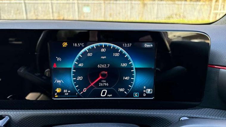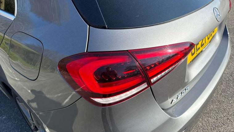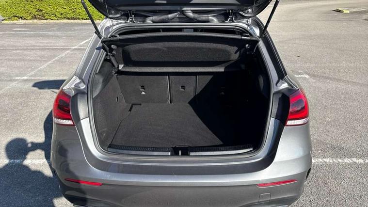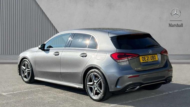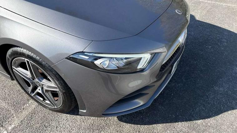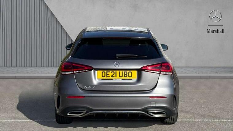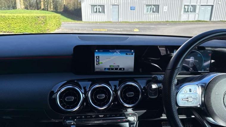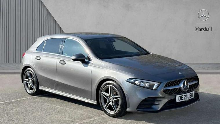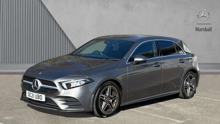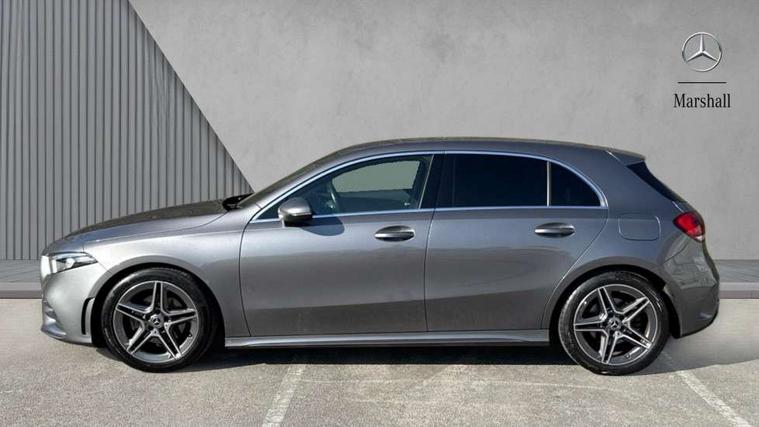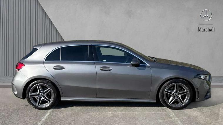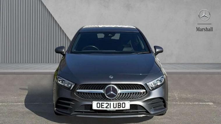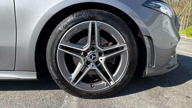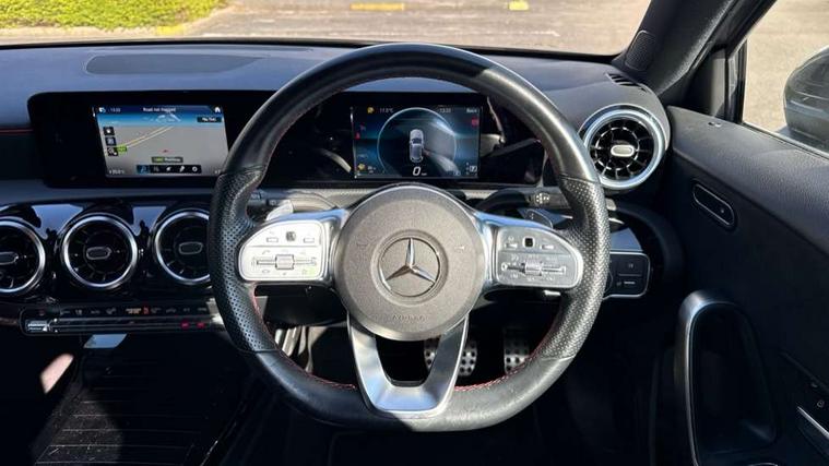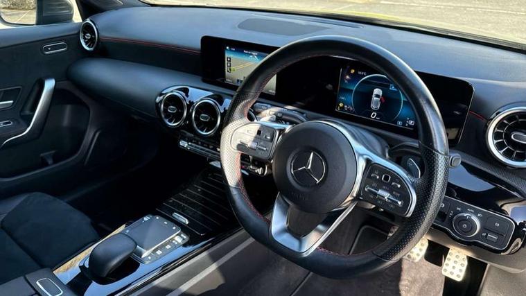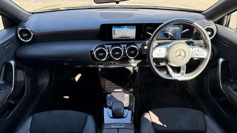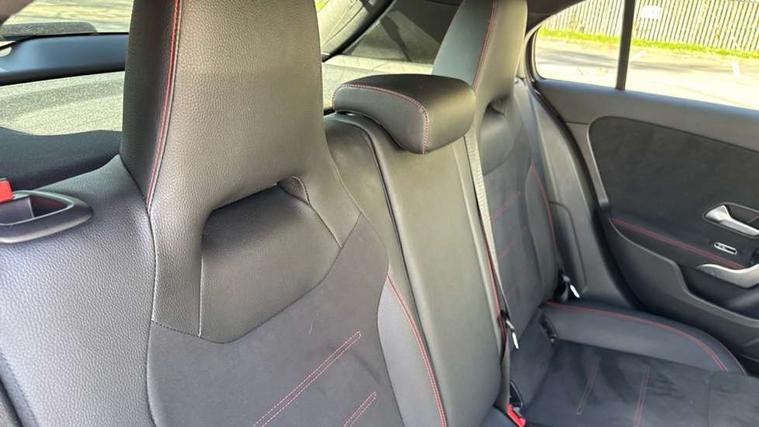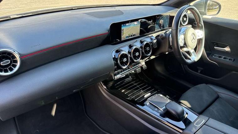 Dinamica microfibre trim in black, Light and sight pack - A Class, Seat comfort pack - A Class, 18" AMG 5 twin spoke light alloy wheels in titanium grey with highsheen finish, Summer tyres, Tirefit sealant kit, Alarm system/interior protection/immobiliser, Keyless Go, Remote central locking and crash sensor with emergency opening function, Urban guard vehicle protection system with immobiliser and interior protection, 2 USB ports (type C) in rear stowage compartment and one in front of center console, 6 speakers, DAB Digital radio, Mercedes-Benz sound system - 100W, 3 rear 3 point seatbelts, ABS with Brake Assist, Active bonnet, Active brake assist includes forward collision warning system with autonomous braking, Adaptive brake assist with hold function and hill start assist, Black seatbelts, Childproof locks manually operated for rear doors and electrically operated for rear power windows, Crash responsive emergency lighting, Driver and passenger head and side airbags, Drivers knee airbag, Dual stage driver/passenger airbags, Electronic parking brake, ESP curve dynamic assist, ESP with ASR, Front and rear seatbelt reminder, Front brake callipers with Mercedes Benz lettering, Tyre pressure monitoring system, Warning triangle and first aid kit, Window airbags, 4 Electric Front and Rear windows, Adaptive brake lights, AMG bodystyling - Front apron with splitter in chrome, rear apron with chrome trim and chrome visible trim elements in tailpipe, Black weather strip, Body colour bumpers, Body colour door handles, Body colour side skirt, Body coloured door mirrors, Chrome beltline trim, Diamond radiator grille with chrome pins and silver louvre + chrome insert, Electric adjustable and heated door mirrors with integrated LED side indicators, Exhaust system - Twin visible tailpipes in polished stainless steel, Headlamp assist automatic headlamp activation, Heated glass rear windscreen + timer control, LED high performance headlamps with integrated LED daytime running lights, LED tail lamp, LED third brake light, Privacy glass, Radio aerial, Rain sensing windscreen wipers with two sensitivity settings, Rear fog lights, Rear wiper, Window line trim strip in chrome, 3 Spoke flat bottom leather multi function steering wheel with perforated leather in grip area, 40:20:40 split folding rear seats, Artico man-made leather/Microfibre Dinamica upholstery with red contrast stitching, Auto Mercedes-Benz child seat recognition sensor, Black air vents with surround in silver chrome, Black roof lining, Brushed stainless steel sports pedals with rubber studs, Controller on centre console with chrome surround, Floor mats with stitched edging and AMG lettering, Front centre armrest with storage compartment, Front door sills with Mercedes benz lettering, Front seat backs luggage nets, Front seat cushion length adjustment, Galvanished gear shift paddles on steering wheel, Heated front seats, Height/reach adjustable steering column, Interior mirror with reading lamps in black and frameless, ISOFIX and top tether child seat fixing points in two outer rear seats, Manual height adjustable front seats, Rear head restraints, Seat occupancy sensor for front passenger seat, Sports seats with integrated headrests, Stowage compartment in centre console with retractable cover, Sunvisors with illuminated vanity mirrors, Touchpad on center console, Twin front cupholders, Two zone thermotronic luxury automatic climate control, 180 degree rear view camera with parking guidelines, 7" colour screen in instrument panel, 7" touchscreen media display, Attention assist, Brake pad wear indicator warning light, Car wash mode, Cruise control + speed limiter, Direct steering, Dual bluetooth interfaces, DYNAMIC SELECT with a choice of driving modes (ECO, Comfort, Sport and Individual), ECO start/stop function, Fluid level warning indicator for fuel, oil, coolant and washer fluid, Hard-disk navigation, Hey Mercedes Voice activation, Lamp failure indicator, MBUX multimedia system with DAB digital radio and touchpad including satellite navigation, Mercedes me connect including emergency call system, accident recovery, breakdown management and maintenance, Mercedes me remote services, Outside temperature gauge, Owners manual in English, Pre-installation for car sharing, Preinstallation for Mercedes Benz link, Service indicator (ASSYST), Speed sensitive power steering, Trip computer, Lowered comfort suspension, Rear axle torsion beam,