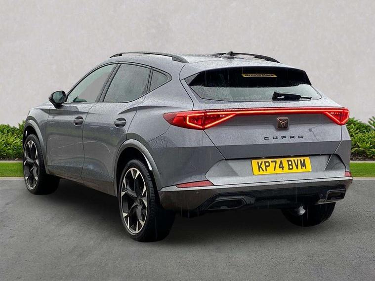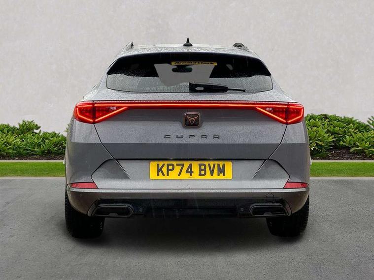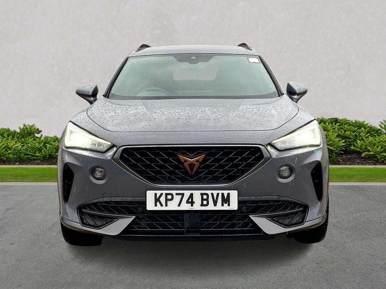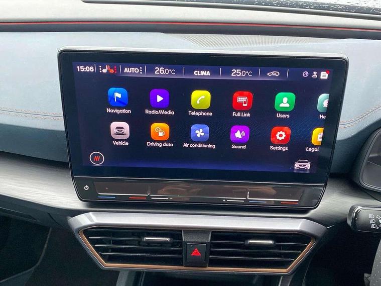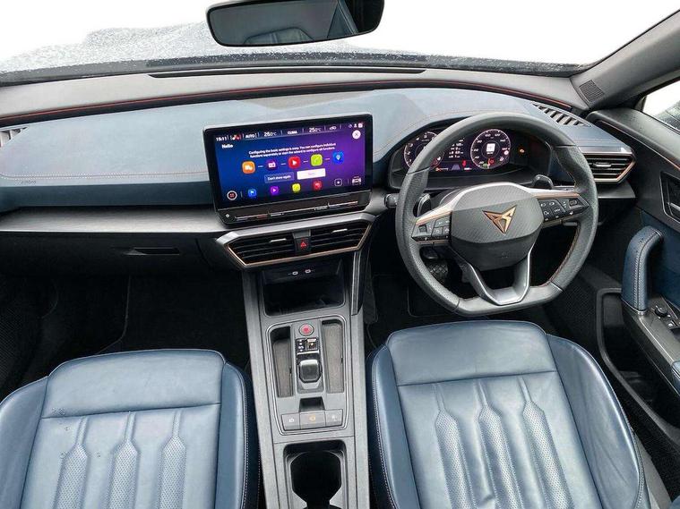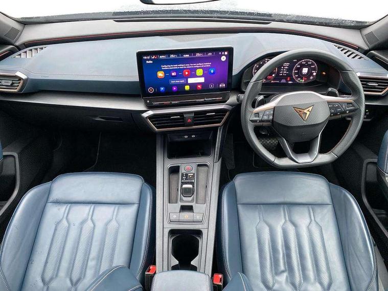 Digital cockpit and configurable dashboard, Driver alert system, Driving profile selection, Forward collision warning with automatic braking, Lane assist, Navigation system with 12'' Touchscreen Display, Park assist (inc front/rear parking sensors), PAS, Predictive adaptive cruise control with speed limiter, Rear view camera, RPM, trip computer, outside temp gauge, instrument light brightness, low fuel warning light, lights on reminder, gearshift indicator, Service interval indicator, Start/stop system with regenerative braking, Voice control system, Wired Android Auto, Wireless apple carplay, Wireless phone charger, Electronic locking differential and dynamic traction support, Standard suspension, 2 front and 2 rear USB type C sockets, Auxiliary input socket, DAB radio, Auto dimming rear view mirror, Body colour door handles, Body coloured bumpers, Dark grey wing mirror, Daytime running light with automatic headlight control and coming home feature, Dynamic headlight range control, Electric front/rear windows, Electrically adjustable heated and folding door mirrors with memory function, Front fog lamps with cornering function, Gloss black roof rails and window surrounds, LED Headlights, LED Taillights with dynamic indicator, Rain sensing wipers, Rear diffuser with black simulated exhaust pipes, Rear side wing doors, Rear wash/wipe, Third brake light, Tinted rear windows, Welcome lights, 12v power supply in centre console, 12V socket, 12v socket in loadspace, 2 front and 2 rear reading lights, 230V socket, 3 seat bench in 2nd row, 60/40 split rear bench seat with armrest and mechanical seat release, Black headlining, Dust/pollen filter, Front and rear head restraints, Front centre armrest, Height/reach adjust steering wheel, Illuminated interior front door sills, Illuminated sunvisor with mirror, Isofix, Leather multi function heated steering wheel with gear shift paddles, Luggage tie-down hooks, Single front passenger seat, Three zone climate control with control panel in rear, Variable luggage/load compartment floor, Wraparound lighting, Genuine Nappa leather Pack - Cupra, 3 point seatbelts on all rear seats, ABS, Brake control system - ESC and brake booster, Child proof door locks, Driver and front passenger airbags with front passenger airbag de-activation, Electronic parking brake, Front and rear disc brakes, Front side curtain airbags, Hill hold control, Public e-call, Seat belt reminder for front and rear seats, Tyre pressure monitoring system, Anti theft alarm system, Keyless entry and start system (KESSY), Locking wheel bolts, Copper and aluminium interior detailing, 19" 'Exclusive' machined sport matte black and silver alloy wheels,