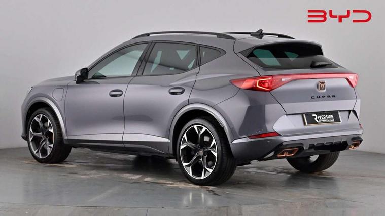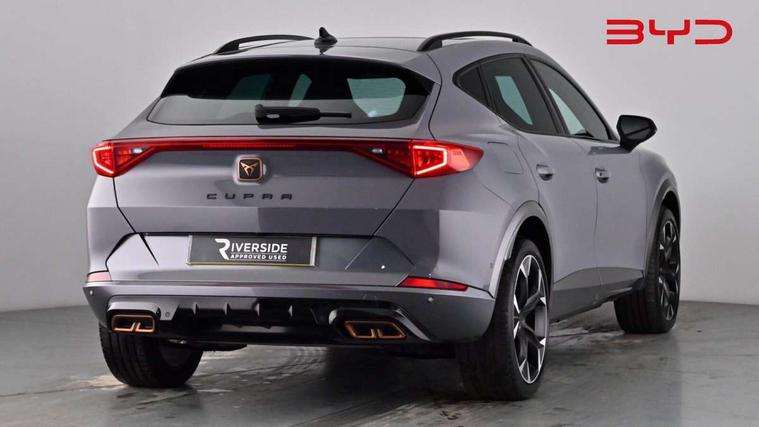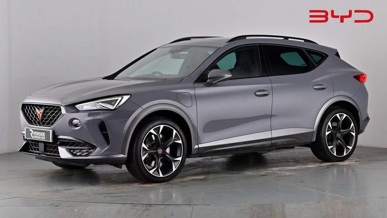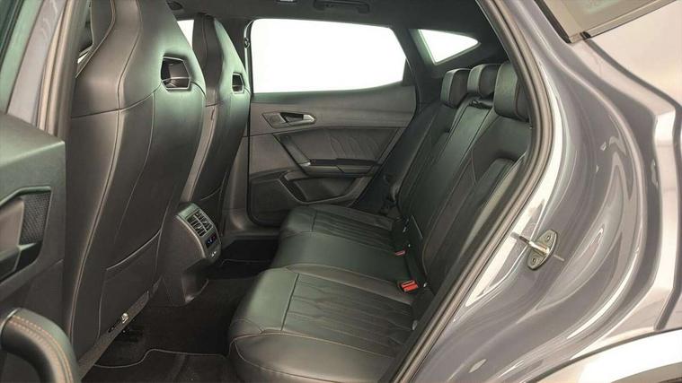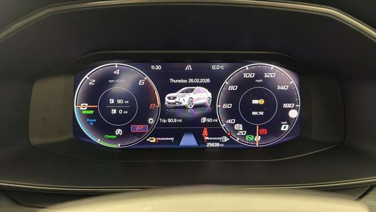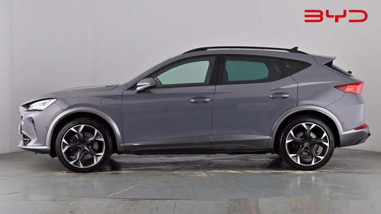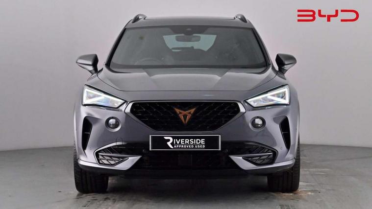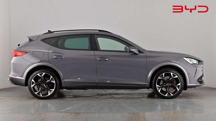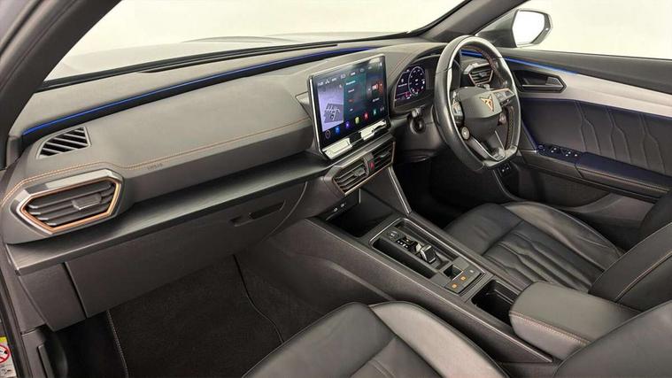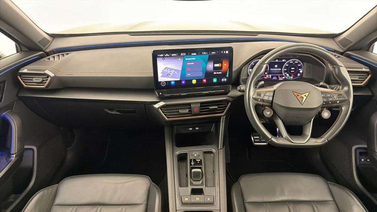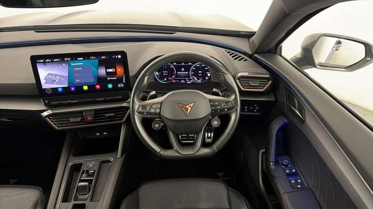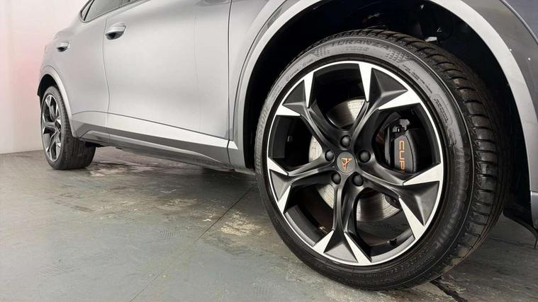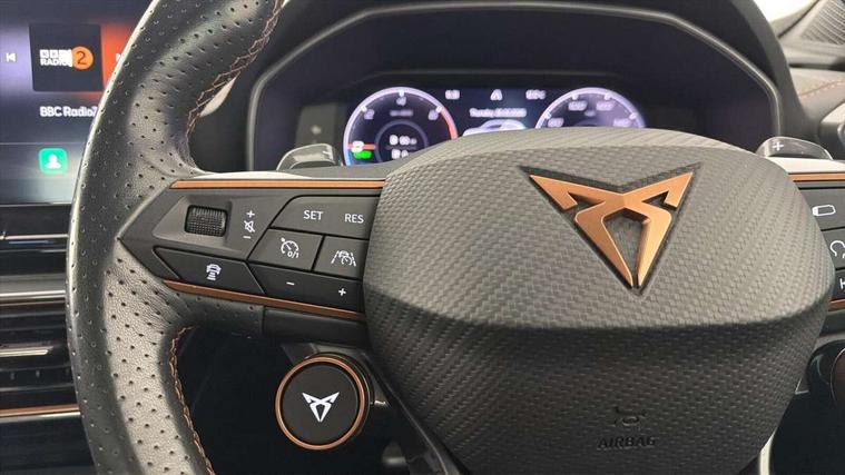 Digital cockpit and configurable dashboard, Driver alert system, Dynamic chassis control with driving profile selection (Comfort, Sport, CUPRA, Individual), Forward collision warning with automatic braking, Lane assist, Navigation system with 12'' Touchscreen Display, Park assist (inc front/rear parking sensors), Predictive adaptive cruise control with speed limiter, Rear view camera, RPM, trip computer, outside temp gauge, instrument light brightness, low fuel warning light, lights on reminder, gearshift indicator, Service interval indicator, Speed sensitive power steering, Start/stop system with regenerative braking, Virtual pedal and electric tailgate, Voice control system, Wireless apple carplay, Wireless phone charger, 10 amp mode 2 charging cable, 16 amp mode 3 charging cable, 3.6 kw On-board charger, Electronic locking differential and dynamic traction support, Sports suspension with front shock absoption, 2 front and 2 rear USB type C sockets, 6 speakers, Auxiliary input socket, DAB radio, Auto dimming rear view mirror, Body colour door handles, Body coloured bumpers, Dark grey wing mirror, Daytime running light with automatic headlight control and coming home feature, Dynamic headlight range control, Electric front/rear windows, Electrically adjustable heated and folding door mirrors with memory function, Front fog lamps with cornering function, Gloss black roof rails and window surrounds, LED Headlights, LED Taillights with dynamic indicator, Rain sensing wipers, Rear diffuser with twin exhaust pipe on each side with simulated exhausts, Rear side wing doors, Rear wash/wipe, Sports bumpers, Third brake light, Tinted rear windows, Welcome lights, 12v power supply in centre console, 12V socket, 12v socket in loadspace, 2 front and 2 rear reading lights, 230V socket, 3 seat bench in 2nd row, 60/40 split rear bench seat with armrest and mechanical seat release, Black headlining, Cupra sports pedals, Dust/pollen filter, Front and rear head restraints, Front centre armrest, Height/reach adjust steering wheel, Illuminated interior front door sills, Illuminated sunvisor with mirror, Isofix, Leather heated multi-function sports steering wheel with start stop, CUPRA mode button and gear shift paddles, Luggage tie-down hooks, Single front passenger seat, Three zone climate control with control panel in rear, Wraparound lighting, Genuine Nappa leather Pack - Cupra, Safety and driving pack (XL) - Formentor, 3 point seatbelts on all rear seats, ABS, Brake control system - ESC and brake booster, Child proof door locks, Driver and front passenger airbags with front passenger airbag de-activation, Electronic parking brake, Front and rear disc brakes, Front side curtain airbags, Hill hold control, Public e-call, Seat belt reminder for front and rear seats, Tyre pressure monitoring system, Anti theft alarm system, Keyless entry and start system (KESSY), Locking wheel bolts, Copper and aluminium interior detailing, 19" 'Exclusive' machined sport matte black and silver alloy wheels, Tyre repair kit,