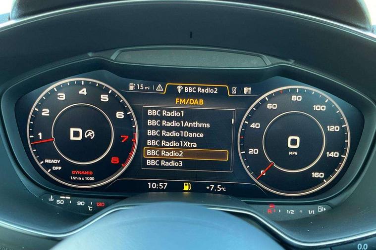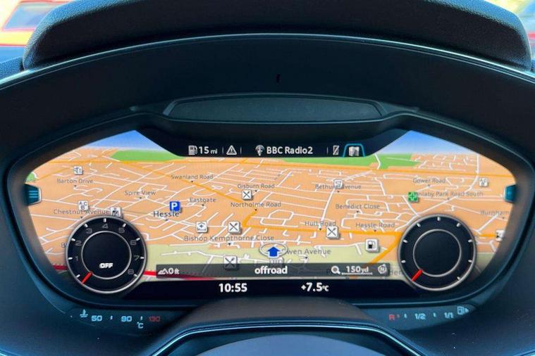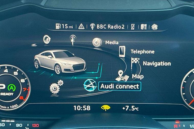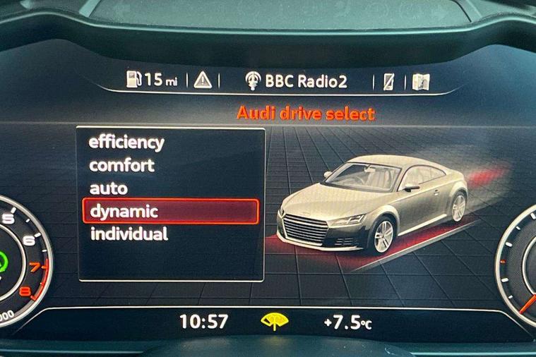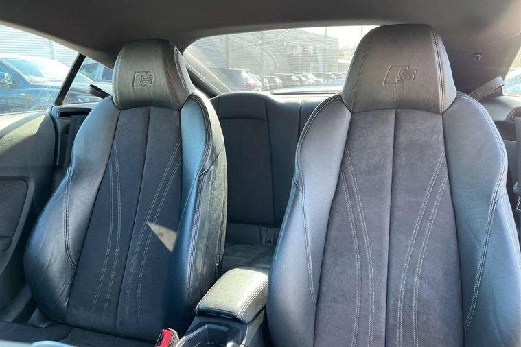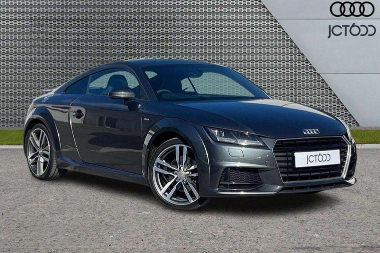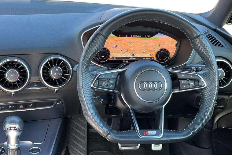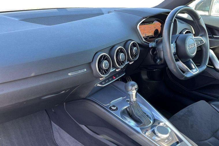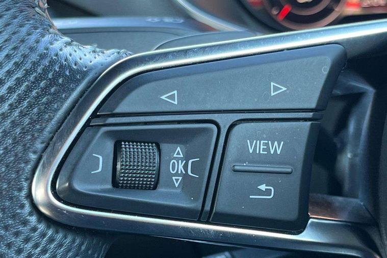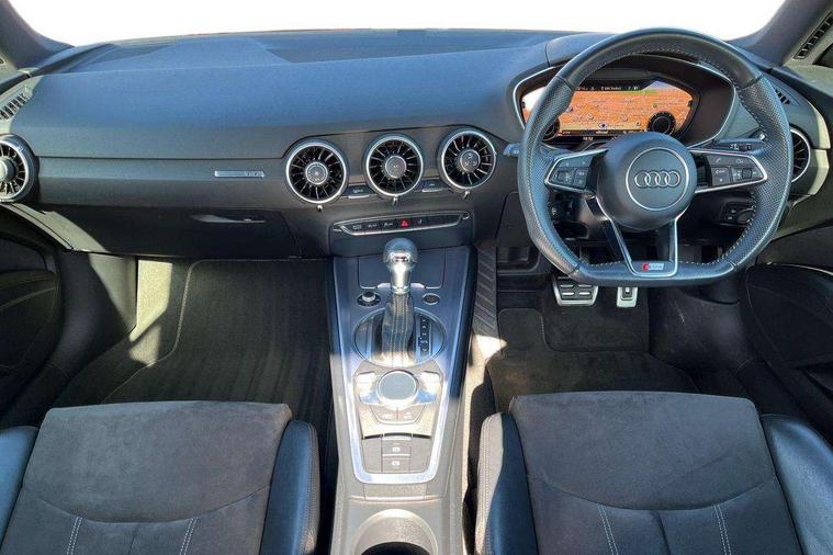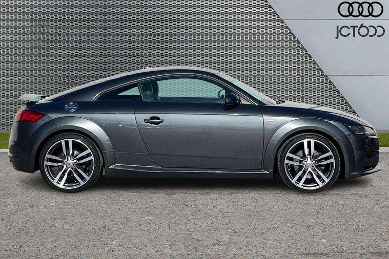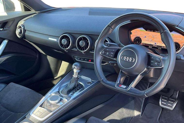 Audi drive select, Audi virtual cockpit - 12.3" high-resolution LCD display with fully customisable instrument cluster, Cruise control + speed limiter, MMI touch panel, Mobile phone preparation with bluetooth interface, Progressive power assisted steering, Service interval indicator, Audi music interface, Auxiliary input socket, Bluetooth audio streaming, DAB Digital radio, MMI Radio with CD player and SD/XC card slot, Auto headlight range control, Body colour bumpers, Body colour door mirrors, Electric front windows, Front fog lights, Green tinted heat insulating glass, High gloss black front grille, LED daytime running lights, Rear diffuser, Retractable rear spoiler, S Line body styling, Sunband for windscreen, 3 spoke flat bottomed high multi-function leather sport steering wheel with gearshift paddles, Aluminium door sill trims, Black headlining, Electric lumbar support, Extended aluminium look with stainless steel pedals, Front centre armrest, Front head restraints, Front passenger seat isofix location point, Height/reach adjust steering wheel, ISOFIX on outer rear seats, Perforated leather gearknob, Split folding rear seat, Top tether anchor plate for isofix child seat, Auto dimming rear view mirror with light and rain sensors pack - TT, Non smoking pack - TT/TT RS, 3 point front seat belts, ABS, ASR traction control, Curtain airbags, Driver/Front Passenger airbags, EDL traction control, Electromechanical parking brake, ESP, First aid kit, Front passenger airbag deactivation, Front side airbags, Head airbags, Seatbelt warning, Tyre pressure warning, Warning triangle, Anti theft alarm, Immobiliser, Keyless Start, Locking wheel bolts, Remote central locking, Matt brushed aluminium inlays, Tyre repair kit,