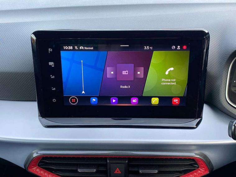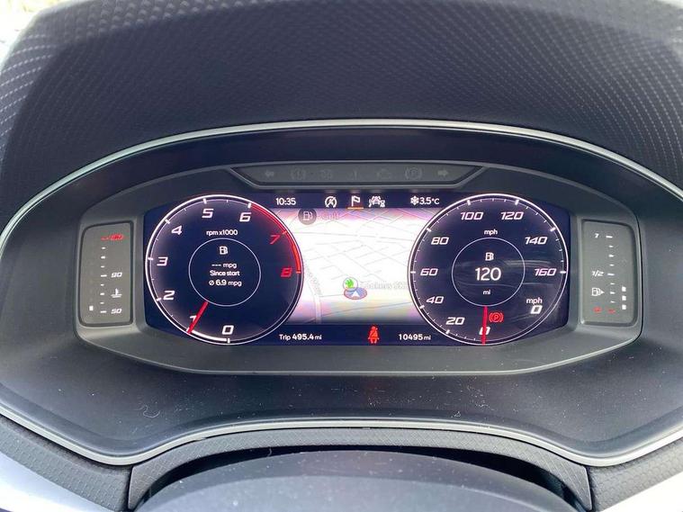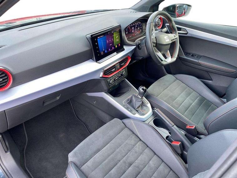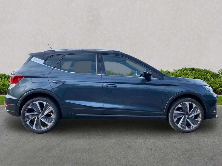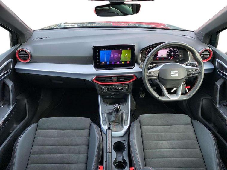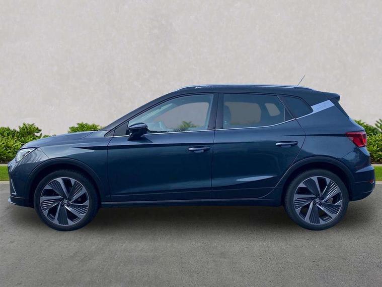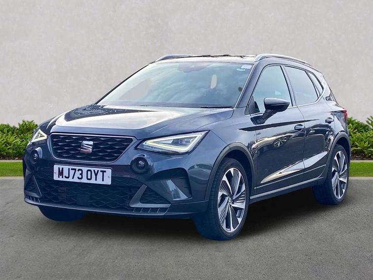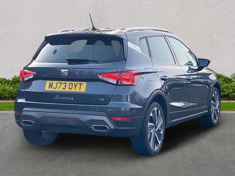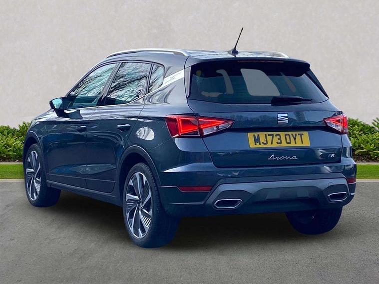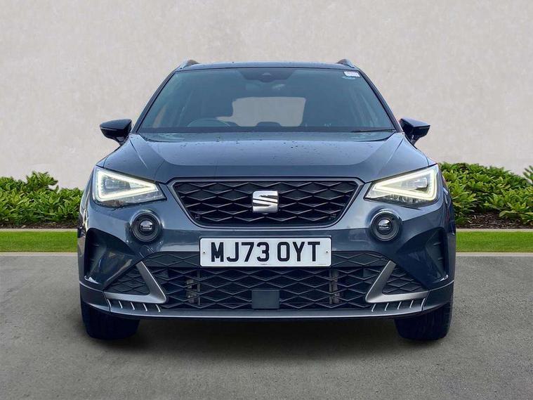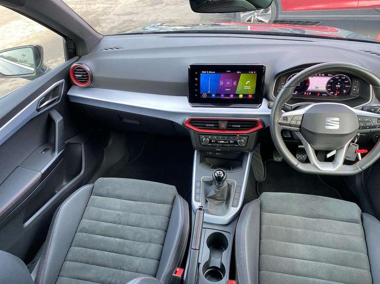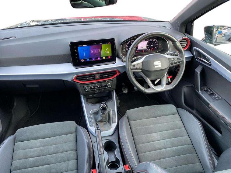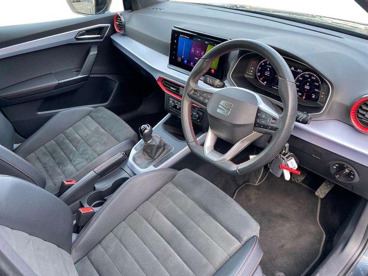 'Lights On' Reminder warning buzzer, 10" Digital cockpit, Digital clock, E-call, Electric speed sensitive power steering, Full Link Smartphone Integration with Mirror Link, Apple Car Play, Google Android Auto with USB Type C cable for Apple and Android compatibility, Low fuel warning light, Outside temperature display, Rear parking sensor, RPM counter, Seat connect with safety, service, remote and online, SEAT Drive profile - Four different models normal-sport-eco-individual, steering response, throttle response, Trip computer, Wireless phone charger, 9.2" colour touchscreen with navigation system, voice control and USB port (type c), Bluetooth interface for hands free and audio streaming, DAB digital radio and AM/FM radio, Steering wheel mounted audio controls, Anti theft roof antenna, Auto dimming interior rear view mirror, Automatic activation of hazard warning lights, Body coloured bumpers, Body coloured door handle inserts, Chrome roof rails and window surrounds, Dark tinted rear windows, Electric front/rear windows, Electrically adjustable, heated and folding door mirrors, Front fog lights with cornering function and rear fog light, FULL LED automatic headlights with dynamic headlight range control, coming and leaving home, LED daytime running lights, LED rear tail lights and licence plate lights, Protective side mouldings, Rain sensing wipers, Rear side wing doors, Rear spoiler, Rear window wash/wipe, Roof colour door mirrors, Third brake light, Twin exhaust pipe styling hidden exhaust pipe, Visible VIN plate, Windshield wiper with intermittent control and potentiometer, 2 cupholders, 3 seat bench in 2nd row, 60/40 split folding rear seat, Aircare filter, Black interior roof, Double boot floor, Driver sunvisor with covered mirror + card holder, Dual zone climate control, Front comfort seats, Front courtesy light with front reading lights, Front seat back storage pockets, Gear shift indicator, Heated front seats, Height adjustable front seats, Height/reach adjustable steering column, Illuminated boot, Instrument lighting with brightness control, Interior ambient lighting, Interior light in footwell, central console and door panel, ISOFIX points in outer rear seats with top tether anchorage points, Microsuede cloth upholstery, Passenger sunvisor with vanity mirror, Perforated flat bottomed leather steering wheel/gear knob/handbrake with red stitching and FR logo, Single front passenger seat, Two front and three rear height adjustable headrests, Interior chrome pack - Arona, 3 point seatbelts on all rear seats, ABS, Active front headrests, Child locks on rear doors, Driver and front passenger airbags with front passenger airbag de activation, front side and curtain airbags, Electronic stability control, Emergency Brake Assist (EBA) and front assist, Front and rear seatbelt reminder, Hill hold control, Multi-Collision braking, Tiredness recognition system, Traction control, Tyre pressure monitoring system, Alarm with back-up horn, Electronic engine immobiliser, Locking wheel bolts, Remote central locking + deadlocks, Tow away protection, Titan black dashboard, 18" Performance Cosmo grey matt alloy wheels,