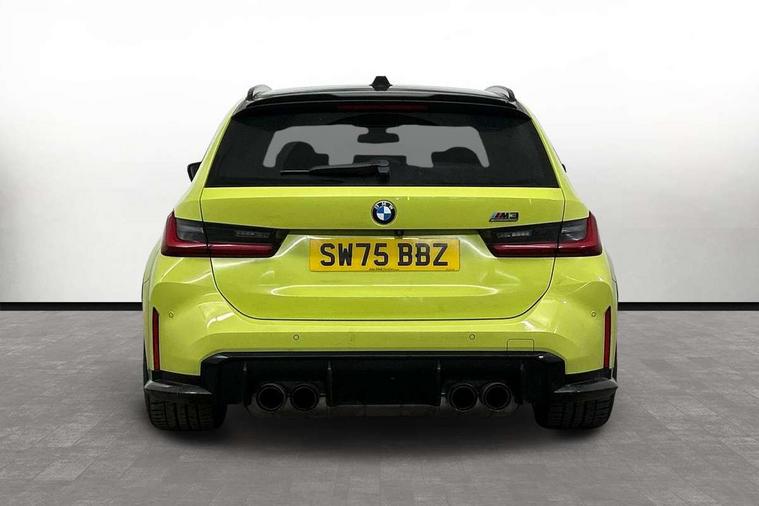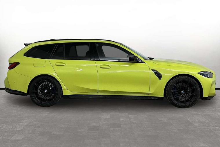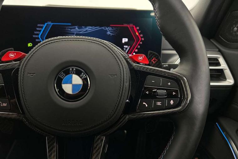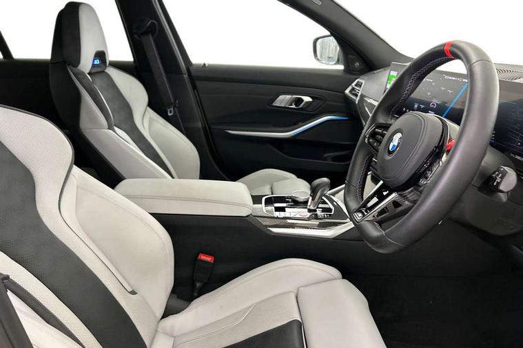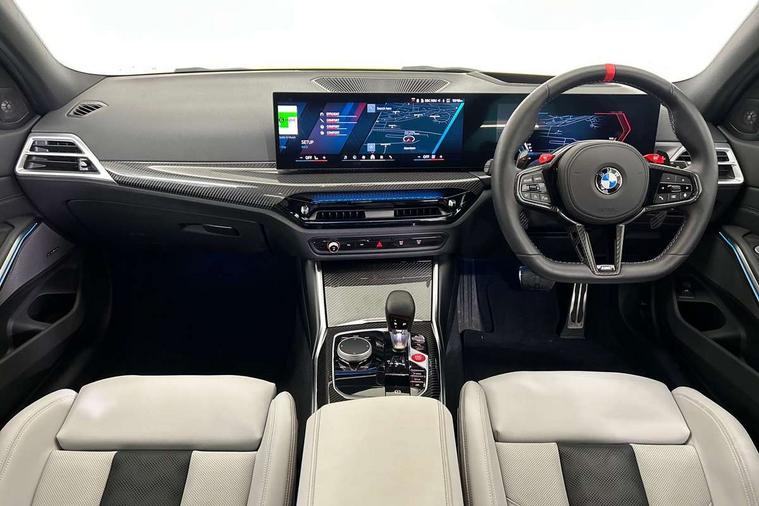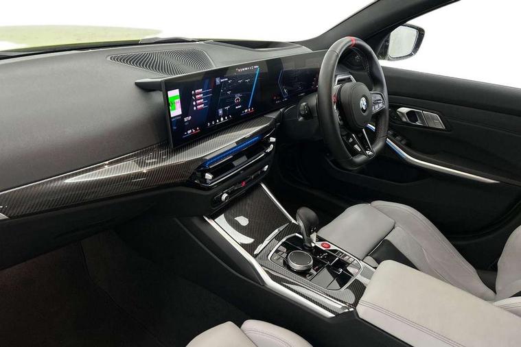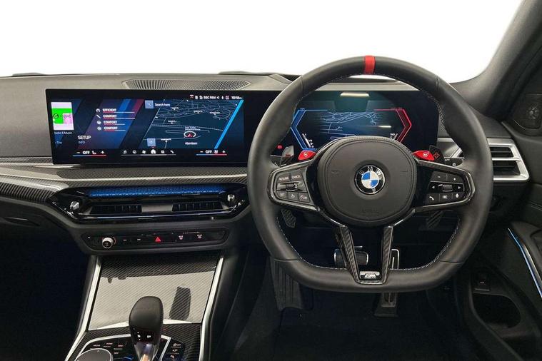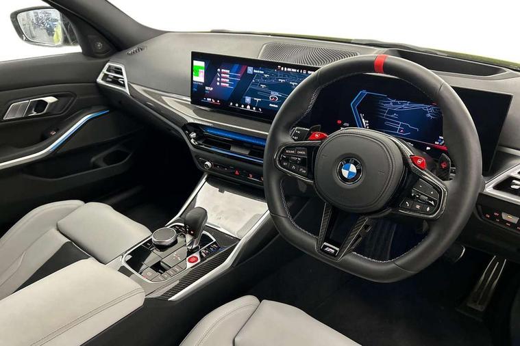 Active Guard, Automatic start/stop system, BMW ConnectedDrive online services, BMW legal emergency call, BMW Live Cockpit Pro with Head up display including 12.3" instrument display and 14.9" high resolution control display with navigation function, BMW Teleservices, Brake pad wear indicator warning light, Condition based service, Cruise control with braking function, Door/boot open warning light, Electric boot lid, Electric Power Steering (EPS) with Servotronic, Language version English, Lights on warning, M drive buttons, Oil sensor for level and grade, warning by check control system, Oil temperature gauge, On board computer, On board diagnostics, Optimum shift indicator, Outside temperature display, Park distance control, Pull away assistant, Run flat indicator, Service interval indicator, Shifting point display, Smartphone integration, Speed limiter, Start/stop button in red, Variable sport steering, Double joint spring strut front axle, Electronic differential lock control (EDLC), M Adaptive suspension, M Drive Professional including track mode, laptimer, traction control & Drift analyser, M Sport differential, Safety battery terminal clamp, Sport automatic transmission with gearshift paddles, Auxiliary point for auxiliary devices, DAB radio with bluetooth music capability, Harman kardon surround sound audio system, Personal eSim, Auto dimming driver's door mirror, Automatic headlights + automatic windscreen wipers, Automatic parking function on front passenger's exterior mirror, Black model designation badges, BMW high gloss shadow line with extended contents, BMW radiator grille, frameless, with horizontal double blind slats, black high-gloss, with model badge, Body colour bumpers, Bonnet and tailgate badge, Carbon fibre reinforced plastic (CFRP) roof, Day time running light, Door mirror integrated indicators, Door sill finishers with aluminium inserts, Dynamic brake lights, Electric adjustable heated door mirrors, Electric folding door mirrors, Electrochromic exterior driver side mirror, Electrochromic interior rear view mirror with automatic anti-dazzle function, Entry sills with aluminium inserts and model badge, Follow me home headlights, Front and rear bumper system, Front and rear plastic apron in vehicle colour, Front door sill strips in aluminium inlays with M3 inscription, Front electric windows with open and close fingertip control, anti trap facility and comfort closing, Headlight beam throw control, Heat protection, sun protection glazing, Heated washer jets, High gloss black lower bumper edges, side sills and diffuser edge binding, High gloss black M roof rails, LED 3rd brake light, LED tail lights with 3D L-shaped LED light design, M designation, Mirror glass aspheric on driver's side, convex on passenger side, Rain sensor, Rear fog lights, Rear reflectors, Rear side wing doors, Rear wiper, Reversing light, Roof fin and roof trim strips in Black high-gloss, Shark fin roof aerial, Strakes in front side panel, black matt/high-gloss black, with model badge, Visible VIN plate, Welcome lighting, 2 cupholders in front centre console, 2 cupholders in rear armrest, 2 rear head restraints, 2 x 12 V Power sockets (luggage compartment and front centre console), 2 x USB Type C ports for charging and data transmission in front centre console, 3 seat bench in 2nd row, 40:20:40 split folding rear seat with loading system, Ambient inside door handle light, Ambient lighting for storage compartment, Ambient lighting front and rear, Anthracite headlining, Battery in luggage compartment, Centre console armrest with storage compartment, Contour lighting for door trim, Driver/passenger sunvisors with ticket holders + illuminated vanity mirrors, Driving experience mode switch, Dual zone automatic air conditioning, Dynamic ambient interior lighting, Electric front seats + driver memory, English handbook, Floor mats in velour, Front and rear door exit lights, Front door storage bins with bottle holder, Front footwell ambient lighting, Front interior light, Front isofix attachment + airbag deactivation, Front reading light, Front seat backrest width adjustment, Front/rear door armrests, Heated front seats, Height adjustable front headrests, Illuminated bow-type door handles in vehicle colour, driver's side with door lock, Interior mirror lighting, Isofix on 2nd row outer seats, Lockable/illuminated glovebox, Luggage compartment lighting, M Sport seats with with illuminated model designation, Multifunction steering wheel, Rake/reach adjustable steering wheel, Single front passenger seat, Storage compartment in rear doors, Storage tray and compartment with cover in centre console, Through loading system, Toolkit located in luggage compartment, Waterfall lighting for central air vent, Wireless charging tray, Connected package professional - M3, Extended storage pack - M3/M4, High gloss shadowline exterior trim pack - M3, 3 point seatbelts on all seats, ABS/EBD, Automatic Stability Control (ASC), Brake energy regeneration, Brake fade compensation, Compound structure brake discs, Cornering brake control (CBC), Crash sensor, Curtain airbags, Driver/Front Passenger airbags, Dry braking, Dynamic brake control, Dynamic stability control + (DSC+), Dynamic Traction Control - DTC, Electromechanical parking brake, Front and rear head airbags, Front seat side impact airbags, Front seatbelt pretensioners + load limiters, Hill start assist, M Sport seat belts, Rear child proof door locks, Seat occupancy detection for driver and passenger side, Seatbelt warning, Side impact protection, Two tone horn, Tyre pressure sensor, Warning triangle and first aid kit, Centre lock switch, Closing system with central locking, Electronic immobiliser, Locking wheel bolts, Remote central locking, Thatcham cat 1 remote alarm, Vehicle Key with 4 buttons including the integrated key, Galvanic embellisher for controls, Tyre repair kit,
