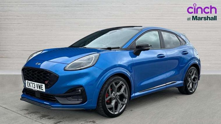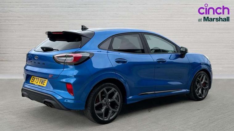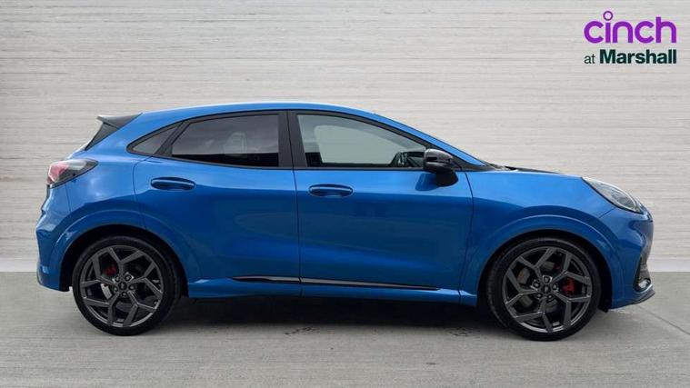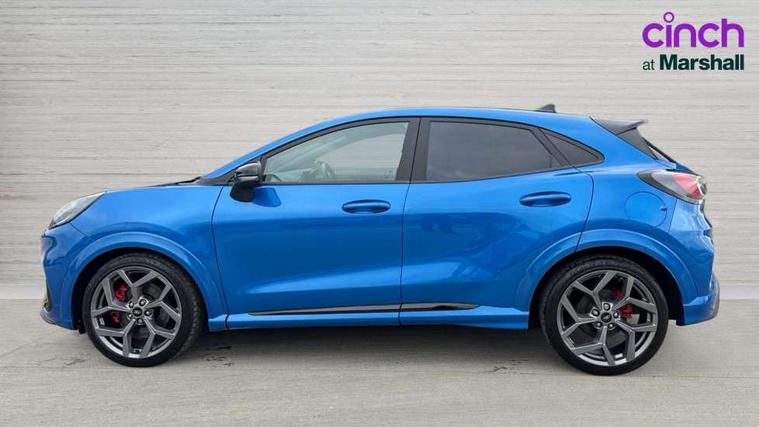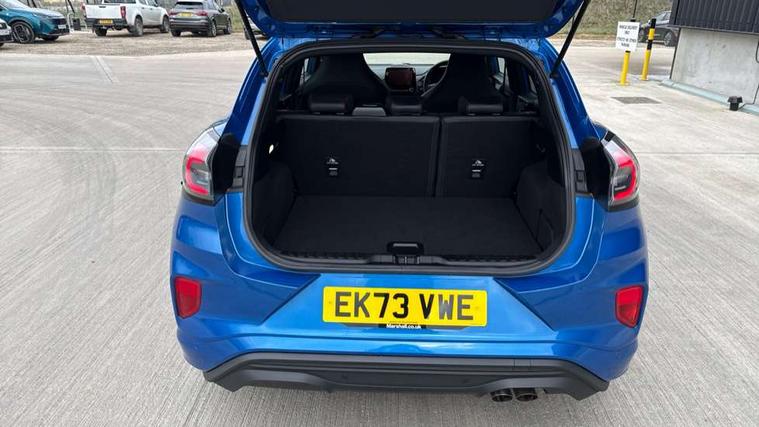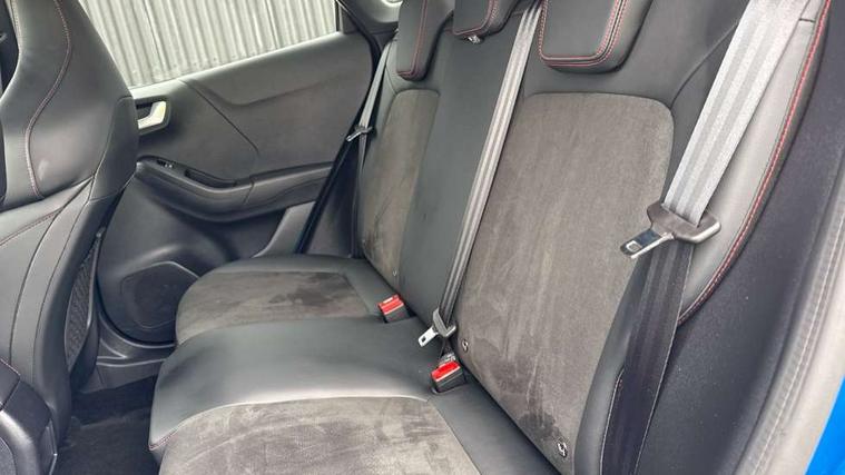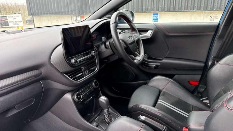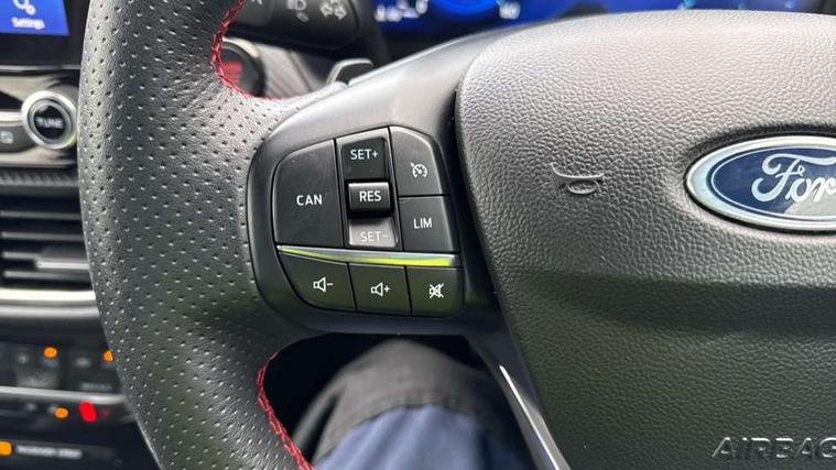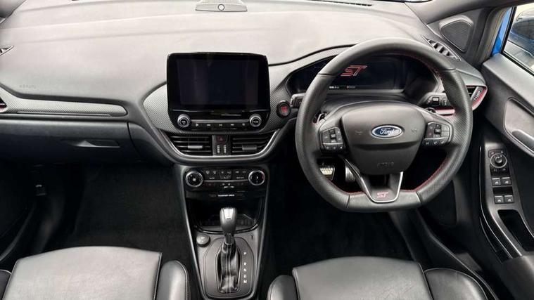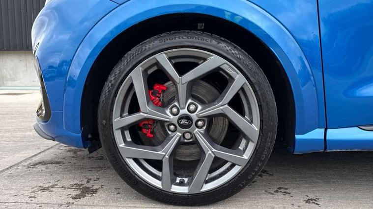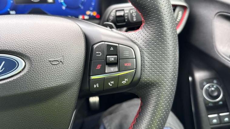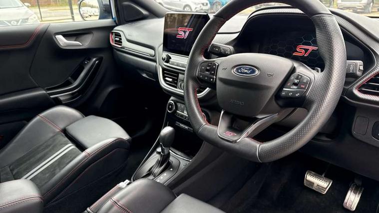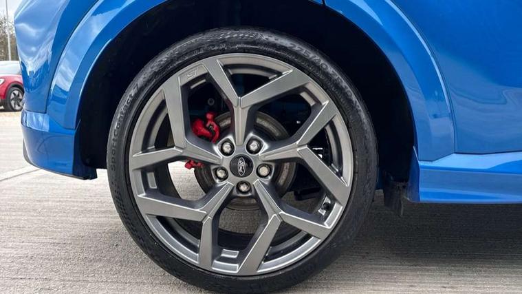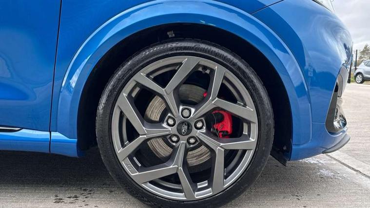 Cruise control with Intelligent speed assist, Driver impairment monitor, Emergency call service, Ford easy fuel, Front and rear parking sensors, Full digital 12.3" instrument cluster, Lane keeping aid with lane departure warning, Power assist steering, Selectable drive modes (normal, sport, eco, track), Speed sign recognition, Engine sound enhancer, ST suspension, Automatic headlights with auto high beam, Automatic rain sensing wipers, Dual chrome exhaust, Fixed LED signature headlamps, Front fog lamps, LED daytime running lights, LED rear lamps, Power foldable heated door mirrors with puddle lamps and puma logo protection, Privacy glass to side rear windows and tailgate glass, Quickclear heated windscreen, Rear side wing doors, Rear wiper, ST scuff plates, Third brake light, Unique ST body styling kit including contrast black roof, large rear spoiler and wing mirrors, plus Ford Performance embossed splitter, 3 seat bench in 2nd row, Alloy sports pedals, Centre console with armrest and stowage, Ford megabox extended bootspace, Ford Performance sensico partial premium leather upholstery with metal grey stitching, Front and rear floor mats, Front and rear head restraints, Manual 6 way driver seat adjust with lumbar adjustment, Manual 6 way passenger seat with lumbar seat adjustment, Single front passenger seat, ST flat bottomed steering wheel with metal grey stitching, ST logo projection, Unique ST gear shift knob, Wireless charging pad with electronic air temperature control (EATC), B&O Premium Audio system + Ford SYNC 3 navigation pack - Puma, Winter pack - Puma, 3 rear seatbelts, Child safety lock, Electronic stability control (ESC) and hill start assist, Pedestrian/cyclist detection & post-collision braking, Pre collision assist system, Red brake calipers, Tyre pressure monitoring system (TPMS), Keyless entry and power start button, Thatcham alarm, Carbon look interior deco spears, 19" 5 Spoke magnetite dark finished alloy wheel, Tyre inflation kit,