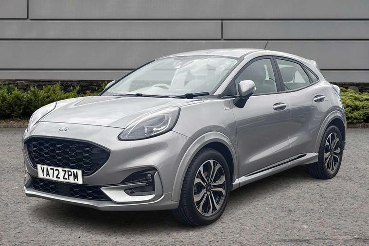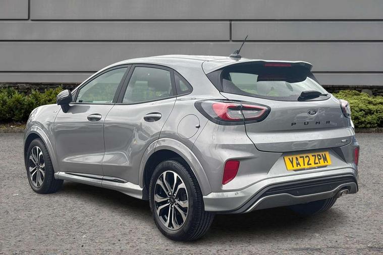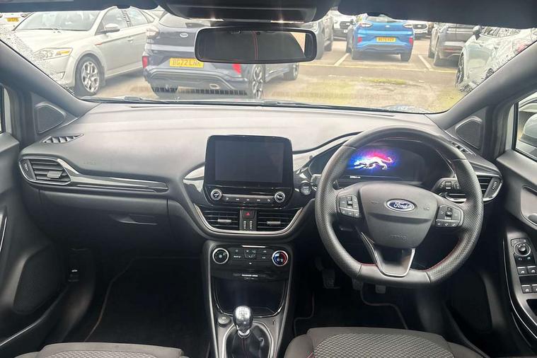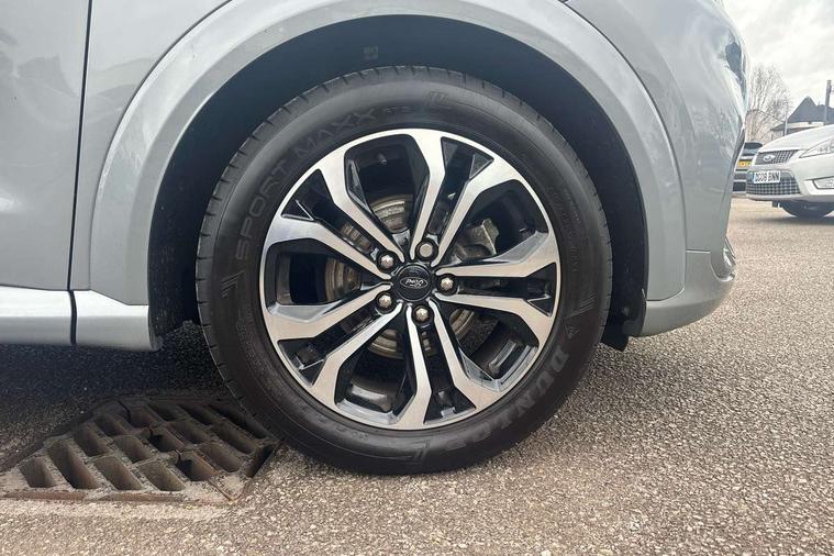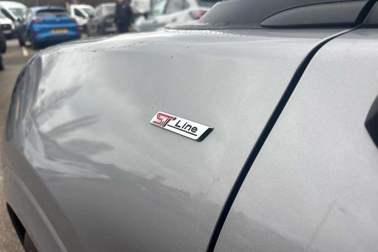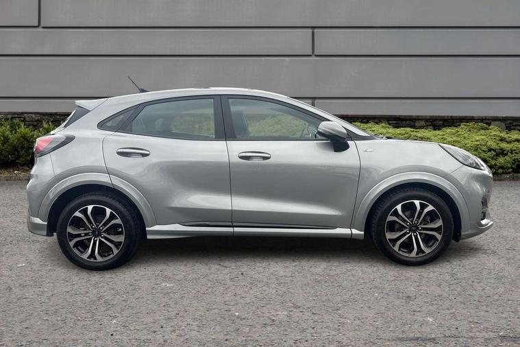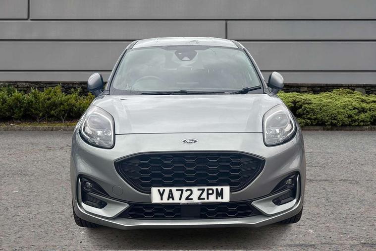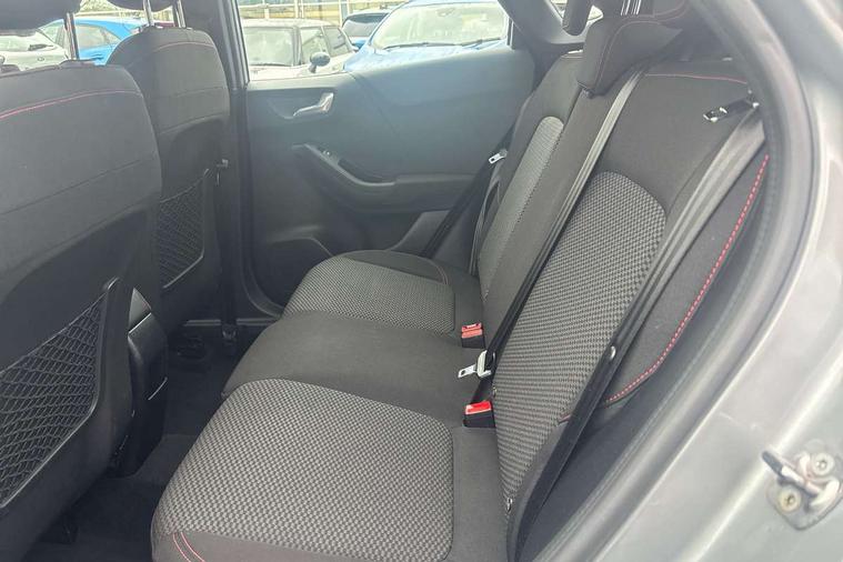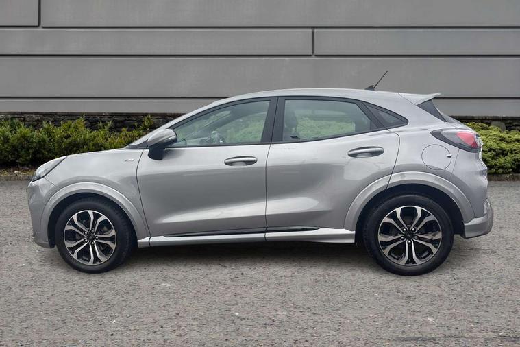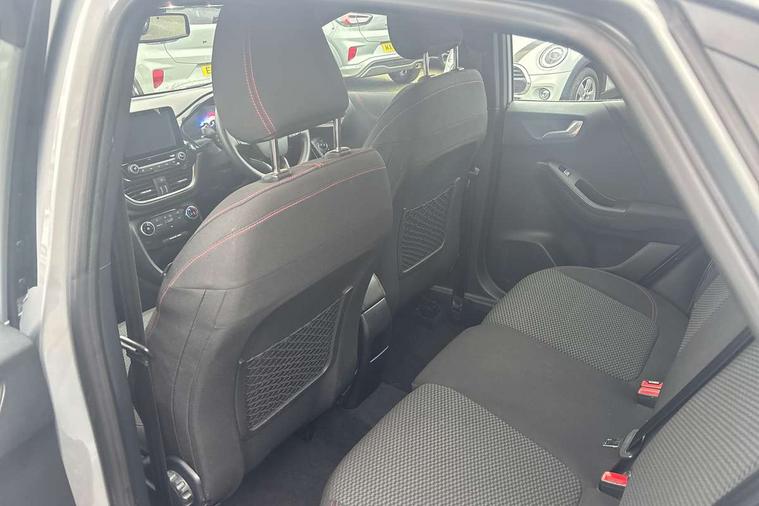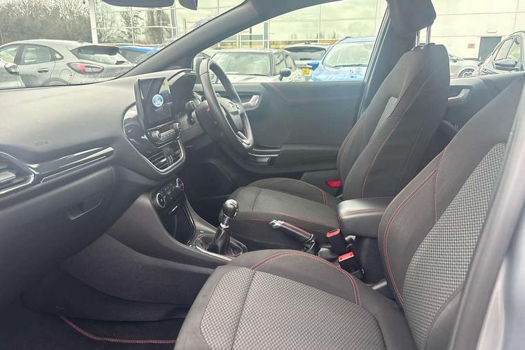 Driver impairment monitor, Emergency call service, Ford easy fuel, Full digital 12.3" instrument cluster, Lane keeping aid with lane departure warning, Power assist steering, Power start button, Rear parking sensor, Selectable drive modes(Normal, Eco, Sport, Slippery and Trail), Speed sign recognition, Sport suspension, Automatic headlights with auto high beam, Automatic rain sensing wipers, LED rear lamps, Power foldable heated door mirrors with puddle lamps, Projector headlamps with LED day time running lights and front fog lamps, Quickclear heated windscreen, Rear side wing doors, Rear wiper, ST-Line body styling kit with unique grille and large body colour rear spoiler, Third brake light, 3 seat bench in 2nd row, Centre console with armrest and stowage, Ford megabox extended bootspace, Front and rear head restraints, Front floor mats, Manual 2 way passenger seat adjustment, Manual 4 way driver seat adjust with lumbar adjustment, Single front passenger seat, ST- Line cloth trim with red stitching, ST-Line flat bottomed sensico leather steering wheel with leather handbrake and aluminium gear knob, Ford SYNC 3 navigation pack - Puma, 3 rear seatbelts, Child safety lock, Electronic stability control (ESC) and hill start assist, Pedestrian/cyclist detection & post-collision braking, Pre collision assist system, Tyre pressure monitoring system (TPMS), Thatcham alarm,