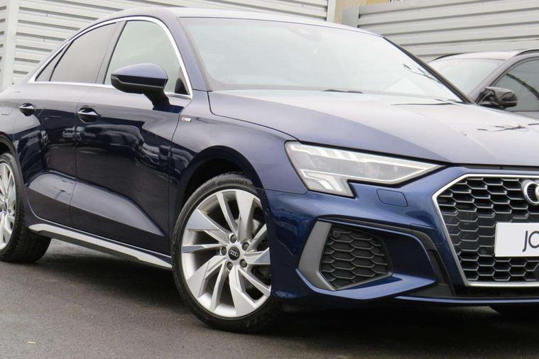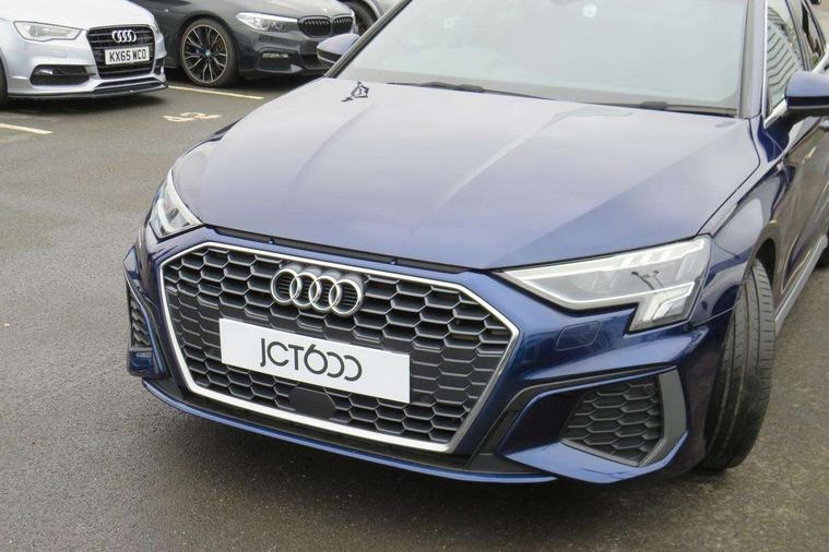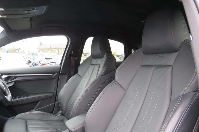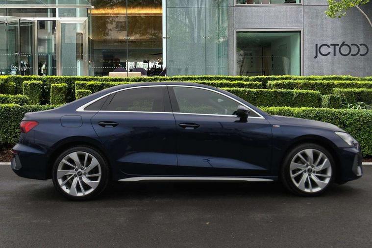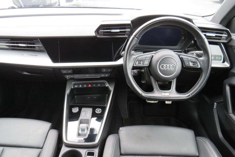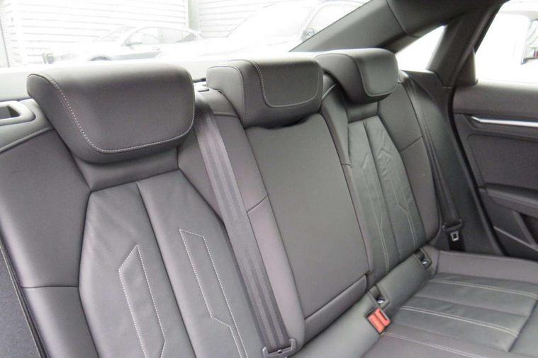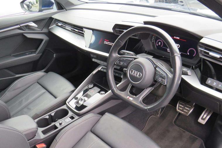 Audi connect emergency call and service, Audi drive select (Auto, Comfort, Dynamic, Efficiency and Individual), Audi smartphone interface, Audi Virtual Cockpit - 10.25" digital and colour instrument cluster, Automatic start/stop system with recuperation, Bluetooth interface, Collision avoidance assistant, Electromechanical power speed sensitive steering, Lane departure warning system, MMI Navigation Plus with high resolution 10.1" colour touch screen display, Service indicator, Voice control system with natural language interaction, 2x USB Type C ports (for charging and data transfer), 6 passive loudspeakers, CD player, DAB Digital radio, 3rd brake light, Acoustic glass windscreen, Aluminium window trim, Auto dimming frameless rear view mirror, Electrically adjustable/heated/folding/auto dimming door mirrors with integrated LED indications + kerb view function for passenger side, Front electric windows, Illuminated door sills with aluminium inserts at the front with S logo, LED daytime running lights, LED headlights with LED rear lights and dynamic rear indicators, Light and rain sensors, Model and engine designation badges at rear, Privacy glass - dark tinted rear window, rear door and side windows, Rear electric windows, S line bumpers, S roof spoiler, 12V socket and storage compartment in front centre console, 40/20/40 split folding rear seat bench with cupholder, Black cloth headlining, Dual zone electronic climate control, Front and rear centre armrest in leather, Front and rear headrests, Front/rear floor mats, Height and reach adjustable steering wheel, Interior lighting - glove compartment light and right hand side, Luggage compartment floor covering, Manual boot compartment lid, Manually adjustable front sport seats, Seat side bolsters, Stainless steel pedals and front footrest in black, Twin leather upholstery with front sports seats S embossed logo, Aluminium interior elements pack - A3, S line styling pack - A3 Saloon, 3x3 point rear seat belts, Driver and front passenger airbag with passenger airbag deactivation, Electronic Stabilisation Control (ESC) including ABS, ASR and EDL, First aid kit with warning triangle and 2 safety vests, Front side airbags with head airbags and interaction airbag, Hill hold assist, Pre-sense front with pedestrian and cyclist detection, Seatbelt monitoring, Tyre pressure loss indicator, Anti theft alarm, Anti-theft wheel bolts, Electronically operated child lock, Immobiliser, Remote control central locking, Aluminium air vent surrounds, Aluminium trim elements, Dark spectrum aluminium inlays, accent surfaces in the dashboard and centre console in platinum grey silk effect paint finish,
