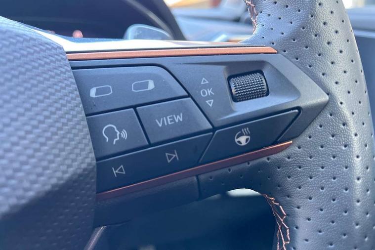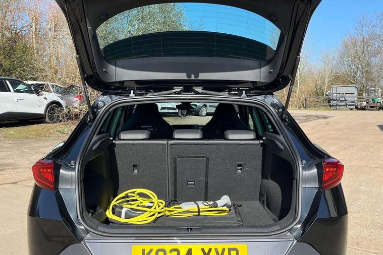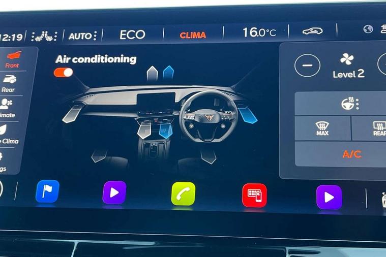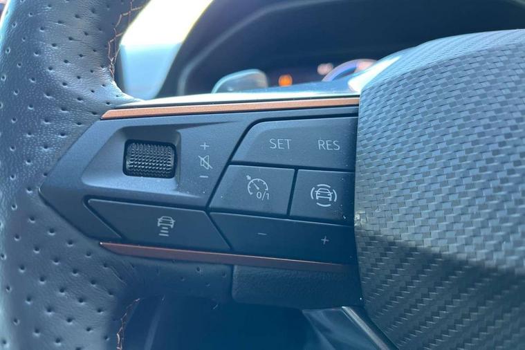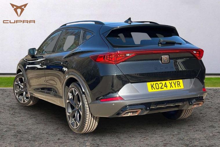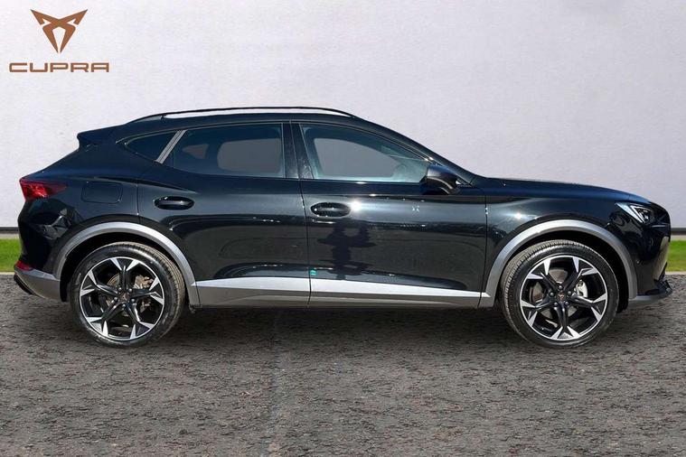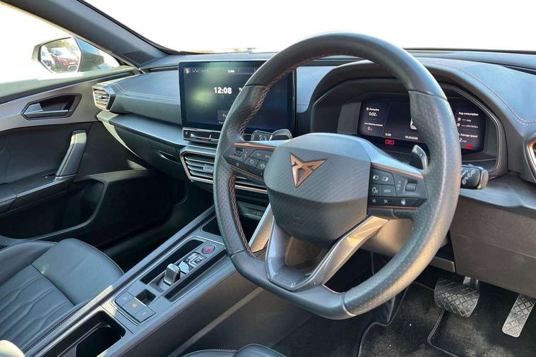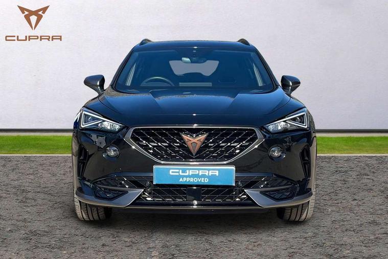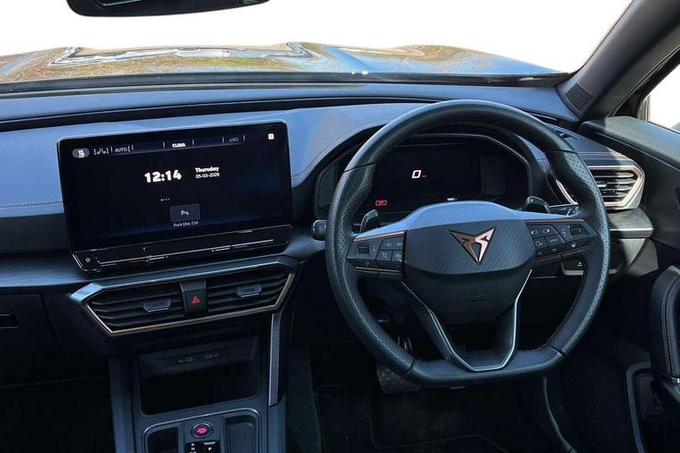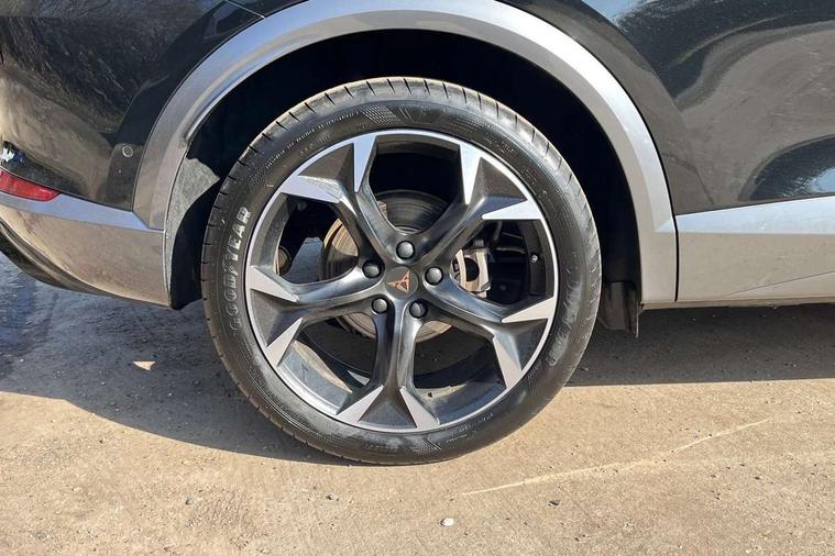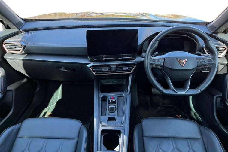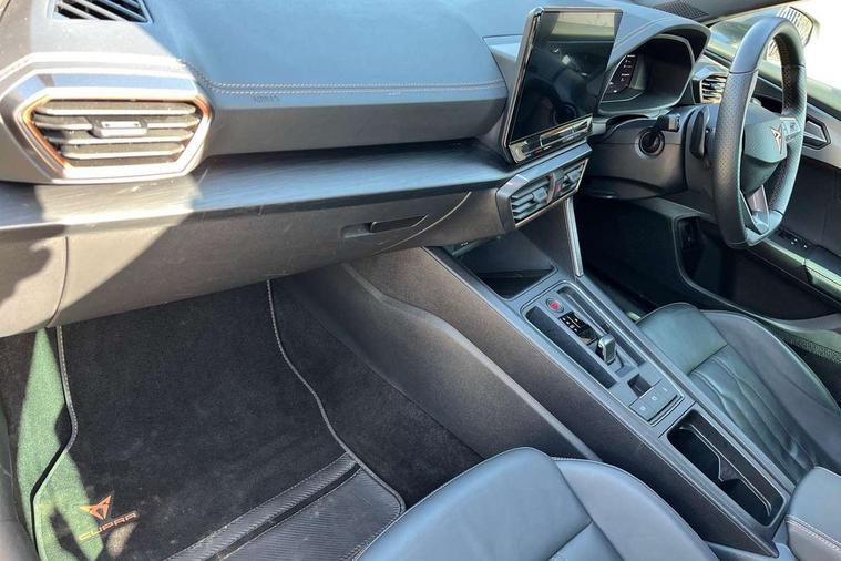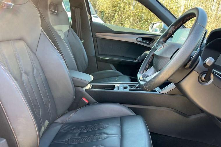 Digital cockpit and configurable dashboard, Driver alert system, Driving profile selection, Forward collision warning with automatic braking, Lane assist, Navigation system with 12'' Touchscreen Display, Park assist (inc front/rear parking sensors), PAS, Predictive adaptive cruise control with speed limiter, Rear view camera, RPM, trip computer, outside temp gauge, instrument light brightness, low fuel warning light, lights on reminder, gearshift indicator, Service interval indicator, Start/stop system with regenerative braking, Voice control system, Wired Android Auto, Wireless apple carplay, Wireless phone charger, 10 amp mode 2 charging cable, 16 amp mode 3 charging cable, 3.6 kw On-board charger, Electronic locking differential and dynamic traction support, Standard suspension, 2 front and 2 rear USB type C sockets, DAB radio, Auto dimming rear view mirror, Body colour door handles, Body coloured bumpers, Dark grey wing mirror, Daytime running light with automatic headlight control and coming home feature, Dynamic headlight range control, Electric front/rear windows, Electrically adjustable heated and folding door mirrors with memory function, Front fog lamps with cornering function, Gloss black roof rails and window surrounds, LED Headlights, LED Taillights with dynamic indicator, Rain sensing wipers, Rear diffuser with black simulated exhaust pipes, Rear side wing doors, Rear wash/wipe, Third brake light, Tinted rear windows, Welcome lights, 12V socket, 2 front and 2 rear reading lights, 3 seat bench in 2nd row, 60/40 split rear bench seat with armrest and mechanical seat release, Black headlining, Dust/pollen filter, Front and rear head restraints, Front centre armrest, Height/reach adjust steering wheel, Illuminated interior front door sills, Illuminated sunvisor with mirror, Isofix, Leather multi function heated steering wheel with gear shift paddles, Single front passenger seat, Three zone climate control with control panel in rear, Wraparound lighting, Genuine Nappa leather Pack - Cupra, 3 point seatbelts on all rear seats, ABS, Brake control system - ESC and brake booster, Child proof door locks, Driver and front passenger airbags with front passenger airbag de-activation, Electronic parking brake, Front and rear disc brakes, Front side curtain airbags, Hill hold control, Public e-call, Seat belt reminder for front and rear seats, Tyre pressure monitoring system, Anti theft alarm system, Keyless entry and start system (KESSY), Locking wheel bolts, Copper and aluminium interior detailing, 19" 'Exclusive' machined sport matte black and silver alloy wheels, Tyre repair kit,