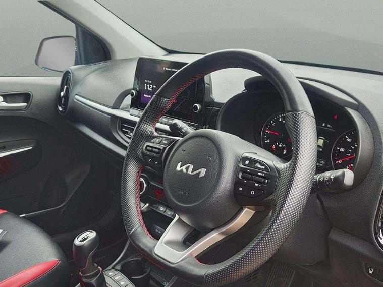 8" touch screen satellite naviagtion with RDS and DAB with telematics, Apple car play/Android Auto with voice control, Cruise control + speed limiter, Emergency call service, Emergency stop signalling system, External temperature gauge, Kia Connect (UVO), Motor driven power steering, Rear parking sensors, Reversing camera system with dynamic guidelines (Integrated into centre fascia screen), Tachometer, Trip computer, Wireless Smartphone charger, 6 speaker audio system, Bluetooth with music streaming, Steering wheel mounted controls, USB ports for connection of a media device, Automatic headlight control system, Bi-function projection headlights, Black beltline mouldings, Black grille with silver surround, Body colour B pillars, Body colour bumpers, Body colour side sill mouldings, Body coloured mirrors and chrome exterior handles, Day/night rear view mirror, Electric adjustable/heated/folding door mirrors with LED indicators lights, Front and rear electric windows with drivers's auto up/down function, Front fog lights, Headlamp levelling, Heated rear window, High mount brake light, LED daytime running lights, LED rear fog lights, Privacy glass - Rear windows and tailgate, Rain sensor, Rear side wing doors, Rear wash/wipe, Speed variable front wipers, Sports front and rear bumpers with gloss black skid plates twin exhaust, Tinted glass, Visible VIN plate, Welcome and follow-me home light functionality, 1 x rear coat hook, 12V power point front, 2 seat bench in 2nd row, 3 x passenger assist grips, 60/40 split/folding 2nd row of seats, All round height adjustable headrests, Automatic air conditioning, Black and red accents front door armrest, Centre Console with Storage Box and Sliding Armrest, Cupholders in centre console, D-cut steering wheel with red stitching, Driver and front passenger sunvisors with driver's side illuminated vanity mirrors, Driver seat height adjust, Faux leather upholstery, Front cabin lights, Glovebox, Heated front seats, Heated steering wheel, High gloss lower centre fascia trim, door armrest and air vents, ISOFIX Child seat top tethers and anchor fixings, Leather trimmed steering wheel and gearshift, Luggage area light, Luggage area parcel shelf, Passenger front seatback pockets, Satin chrome interior door handles, Single front passenger seat, Slide/reclining front seats, Tilt adjustable steering wheel, Advanced Driver Assistance Pack - Picanto, 2 x 3-point rear seatbelts, ABS/EBD, Automatic unlocking of doors in case of impact, Dual front airbags, ESC + BAS + VSM + HAC, Front passenger airbag cut-off switch, Front seatbelt height adjusters, Front seatbelt pretensioners + load limiters, Hill hold control, Knee airbags, Rear child proof door locks, Seatbelt warning, Side impact protection, Torque vectoring brake based and straight line stability (SLS), Traction control, Twin curtain airbags, Twin front side airbags, Tyre pressure monitoring system, Anti theft alarm, Engine immobiliser, Locking wheel nuts, Smart key with engine start/stop button, 16" alloy GT-Line wheels, Tyre mobility kit,