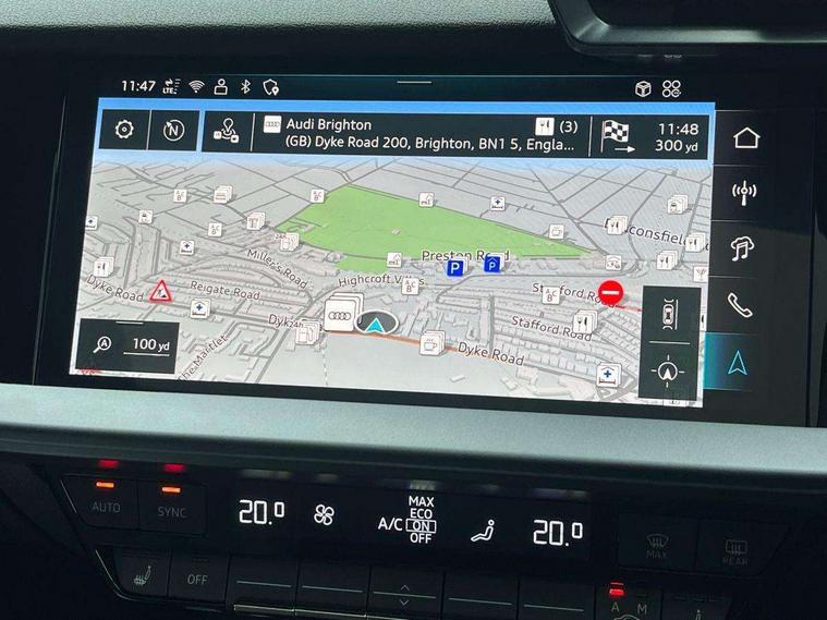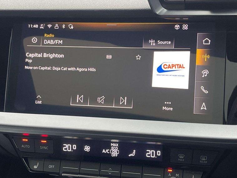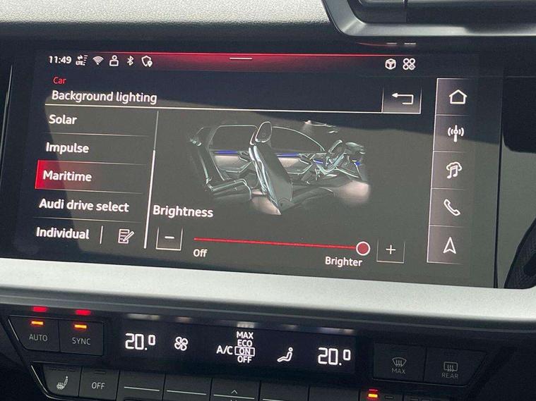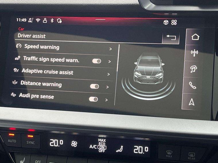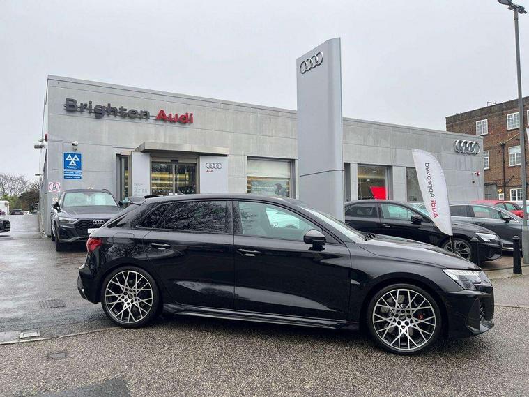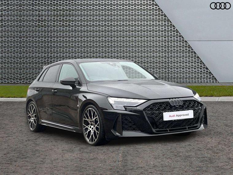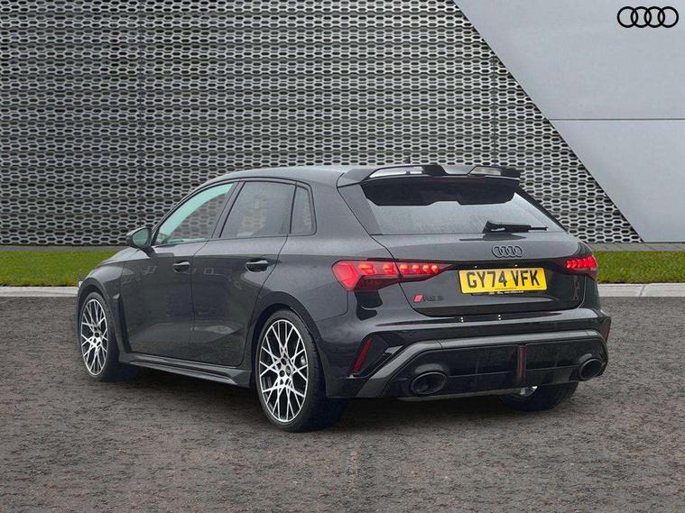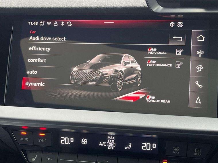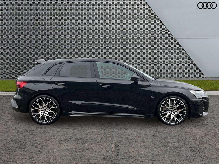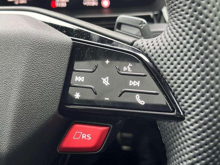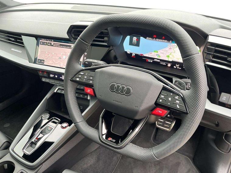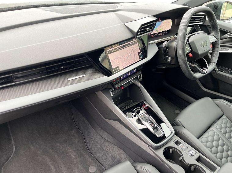 Adjustable speed limiter, Audi drive select comfort, auto, dynamic and efficiency, Audi smartphone interface with app store includes wireless Apple carplay, Android auto and Amazon alexa integration, Audi virtual cockpit plus with RS specific design and 12.3" display with additional graphic display options, Automatic start/stop system with recuperation, Bluetooth interface, Camera based traffic sign recognition, Collision avoidance assistant, Distraction and Fatigue warning, e-Call (emergency call), Lane departure warning system, MMI Navigation Plus with high resolution 10.1" colour touch screen display, Park Assist with parking system Plus, Progressive steering, RS specific driving modes - RS Individual, RS Performance and RS Torque rear, Voice control system with natural language interaction, Adaptive suspension with audi drive select, Increase of top speed to 174 mph, Quattro permanent four wheel drive, Audi Phonebox light with wireless charging, DAB Digital radio, USB ports with charging function in the rear, Audi beam LED projection of RS logo on ground as you exit, Auto dimming frameless rear view mirror, Automatic dynamic range control, Carbon door mirror housings, Carbon fibre engine cover, Dipped beam, main beam, position light and turning light, Electrically adjustable/heated/folding/auto dimming door mirrors with integrated LED indications + kerb view function for passenger side, Exterior model badging, Front electric windows, Heat insulating glass windscreen, LED 3rd brake light, LED brake lights, LED daytime running x3, LED rear number plate lights, LED reverse light, LED tail lights, Light and rain sensors, Privacy glass - dark tinted rear window, rear door and side windows, Rear electric windows, Rear side wing doors, Rear wiper, Roof edge spoiler in carbon, RS dual branch exhaust system with two chrome plated oval tailpipe trims, 12V socket and storage compartment in front centre console, 3 seat bench in 2nd row, 3 Spoke flat top and bottomed black leather multi function steering and gear shift paddles, 3-zone deluxe automatic air conditioning, 40/20/40 split folding rear seat bench, Black cloth headlining, Front and rear headrests, Front centre armrest, Front door sill trims with RS 3 logo, Front sports seats RS embossed logo, Front/rear floor mats, Heated front seats, Height and reach adjustable steering wheel, Manual boot compartment lid, Rear centre armrest with cupholder, Seat side bolsters, Single front passenger seat, Stainless steel pedals and front footrest in black, Vanadium look - Interior door handles, Door trim, power latching, Air vents, window controls, mirror adjust, rear door lock, Selector lever in centre console, Black Styling plus package - RS3, Extended ambient lighting package Pro with Multi-coloured contour lighting of instrument panel - RS3, RS exterior features pack in carbon and gloss black - RS3, RS sport suspension pack - RS3, Storage package - RS3 Sportback, 3x3 point rear seat belts, Driver and front passenger airbag with passenger airbag deactivation, Electronic Stabilisation Control (ESC) including ABS, ASR and EDL, First aid kit with warning triangle and 2 safety vests, Hill hold assist, Pre-sense front with pedestrian and cyclist detection, RS steel brakes, Seatbelt monitoring, Tyre pressure loss indicator, Anti theft alarm, Anti-theft wheel bolts, Electronically operated child locks, Inlays in carbon atlas structure, 19" 10 Cross spoke black metallic alloy wheels, Tyre repair kit,