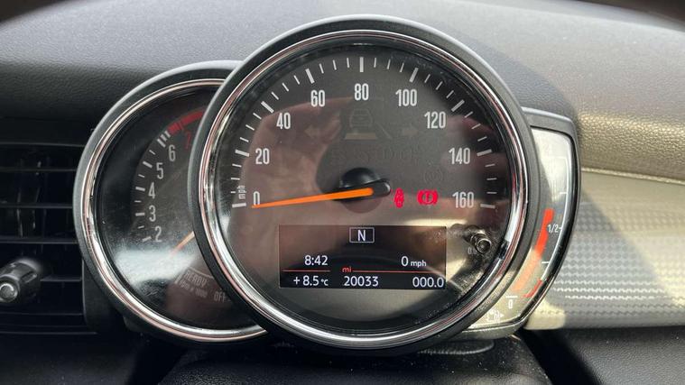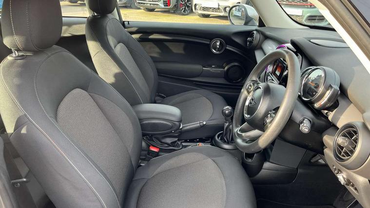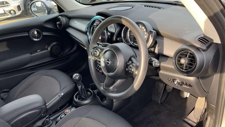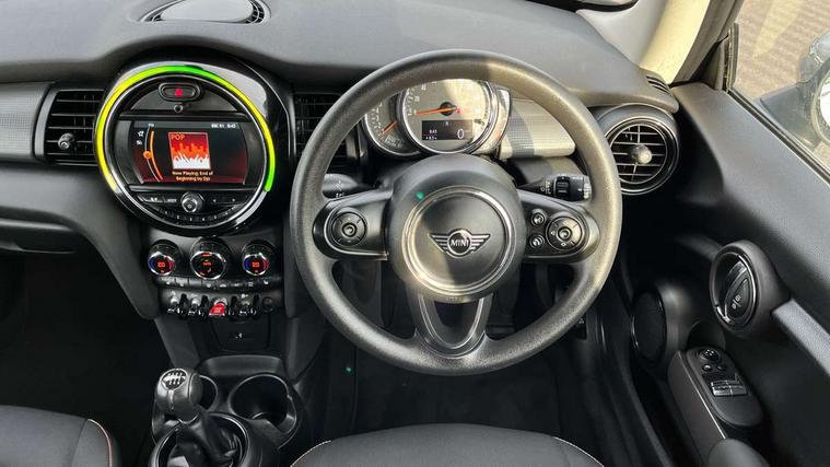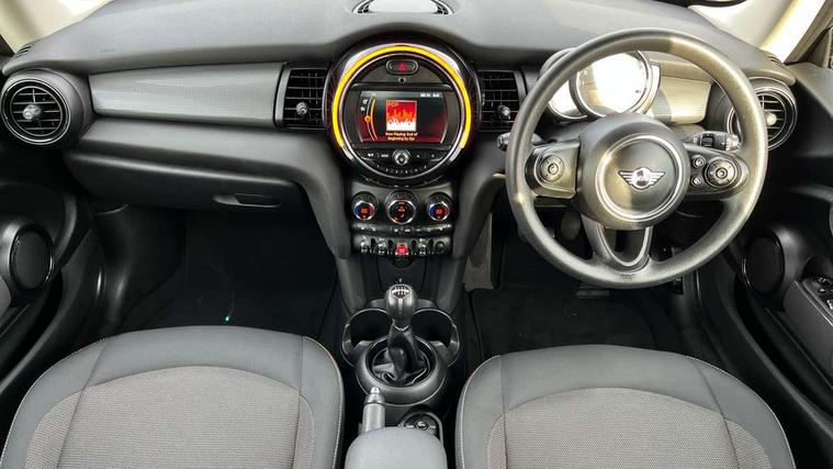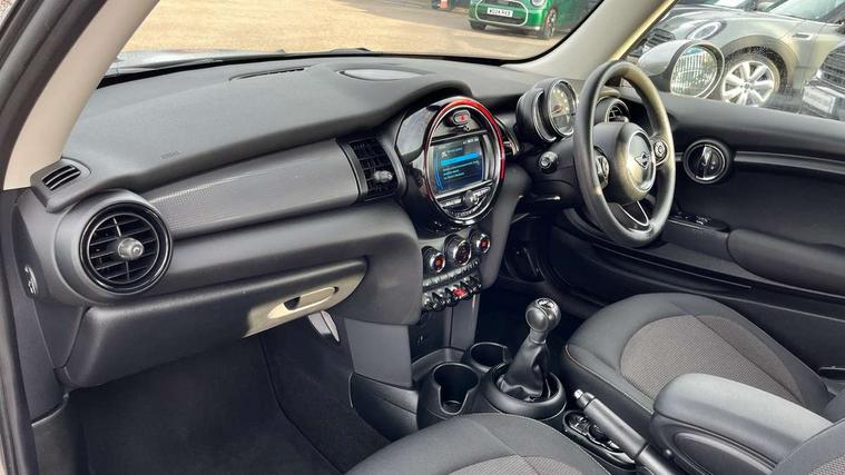 Compatible mobile phone bluetooth with audio streaming, Instrument cluster, Mini E-call, MINI TeleServices, On board computer, Service interval indicator, 6.5" touchscreen with LED ring, FM tuner and DAB digital radio, Automatic headlight activation switch, Body colour fuel filler cap, Chrome border high gloss black slats radiator grille, Dynamic brake lights, Electric front+rear windows, Heated rear window, Heated windscreen washer jets, LED headlight with closed ring and daytime driving lights, Left exhaust tailpipe with chrome finisher, Metal door sill strips with MINI imprint, Model logo Cooper on right of tailgate, Rain sensor window wipers, Rear fog lights, Rear LED lights with union jack design, Rear window wiper, Side scuttle panel with integrated indicator, Sun/heat protection glass, White indicator lenses, 12V Accessory socket in centre console, 4 lashing eyes in luggage compartment, 60/40 split folding rear seat, Chrome interior highlights, Colour line - Carbon black, Cupholders, Front and rear isofix with front passenger airbag deactivation, Glove compartment, Height and length steering column adjustment, Interior lighting with 12 basic colours selectable via toggle switch in roof, Leather gearshift lever and handbrake gaiters, LED reading lights, vanity mirror lights, front foot well light and spotlight on front seats, Manual air conditioning, Mechanical seat adjustment, driver seat height adjust, forward/back and front seats backrest, Mini logo projection on floor from drivers exterior mirror, Multifunction steering wheel, Satellite grey headlining, Storage compartments in doors, Sunvisors with vanity mirrors, 3 point seatbelts on all four seats, 6 Airbags - front, side, head and seat belt tensioners, Anti-lock braking system (ABS), DSC - Dynamic Stability Control, Front and rear disc brakes, Hill start assist, Single tone fanfare horn, Tyre pressure monitoring system, Alarm system with tilt sensor, monitoring doors, bonnet interior and tailgate, Electronic vehicle immobiliser, Start/stop toggle with keyless go, Tool kit,