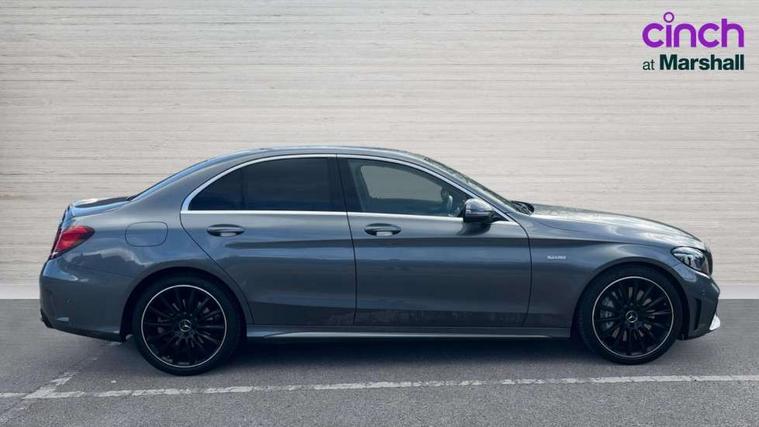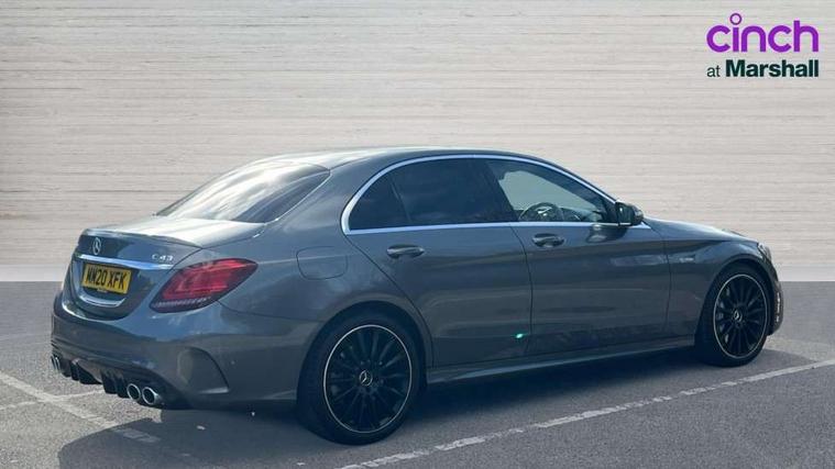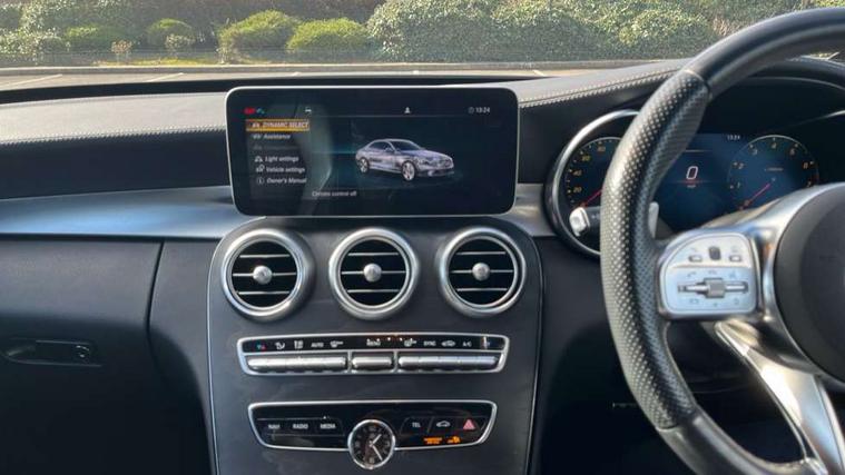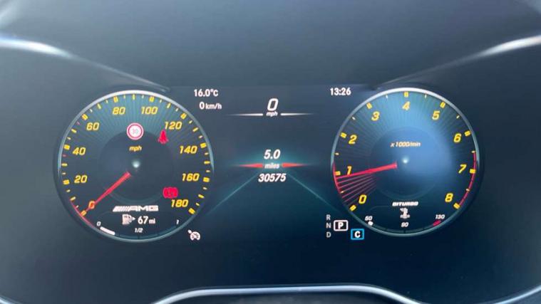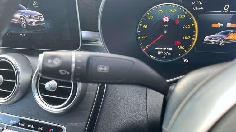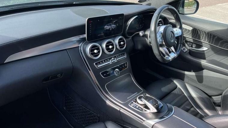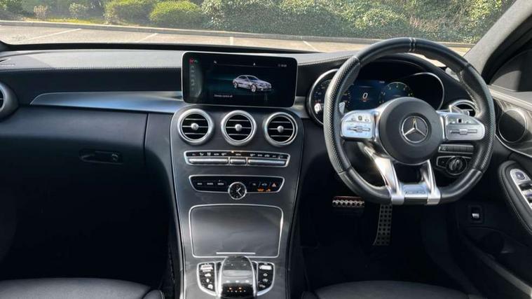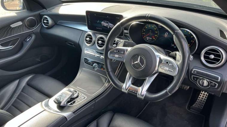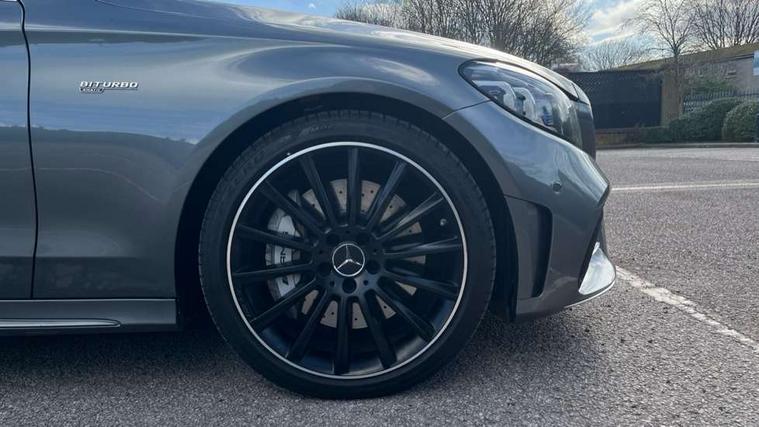 12.3" digital instrument cluster display, Active park assist with parktronic system, Attention assist, Collision prevention assist plus, Colour display - 10.25" colour display screen, DYNAMIC SELECT with a choice of driving modes (ECO, Comfort, Sport, Sport+ and Individual), Mercedes connect me, Multi function trip computer, Outside temperature gauge, Remote boot release, Reversing camera, Service indicator (ASSYST), Status display for rear seat belts in instrument cluster, 66 litre fuel tank, AMG Ride Control sports suspension, Petrol Particulate Filter, 2 USB ports and one SD card slot centre console, Audio 20 with integrated media interface and bluetooth handsfree function, DAB Digital radio, Frontbass loudspeakers, SD card slot, Steering wheel mounted audio controls, Adaptive brake lights, AMG body styling front apron, rear apron and side skirts, AMG body-coloured boot lip spoiler, AMG radiator grille with 2 louvres in matt iridium silver, Automatically dimming rear view mirror and driver's exterior mirror, BITURBO 4MATIC lettering on front wings, Black door mirrors, Body coloured bumpers, Electric windows with one touch opening/closing and obstruction sensors, Electrically adjustable and heated door mirrors, Green tinted glass, Heated windscreen washers, LED Indicators, LED tail lights, LED third brake light, Multi beam LED headlights, Privacy glass (rear side windows and rear screen), Radio aerial integrated into rear window, Rain sensor windscreen wipers, Side windows surround in matt black, 2 cupholders in front centre console, 3 spoke flat bottom multi function sports steering wheel in black nappa leather and steering wheel in chrome inserts with leather grip area, 40:20:40 split folding rear seats, Auto Mercedes-Benz child seat recognition sensor, Black floor mats with AMG lettering and red piping, Dual zone automatic climate control, Front and rear head restraints, Front centre armrest with storage compartment, Front door sills with Mercedes Benz lettering, Front head restraints, Gearshift paddles on steering wheel, Heated front seats, Height/reach adjustable steering column, Illuminated glovebox, Leather upholstery, Rear top tether child seat ISOFIX attachment, Sports pedals with stainless steel surfaces and rubber studs, Sports seats, Sunvisors with illuminated vanity mirrors, AMG night package - C Class, Lighting pack - C class, Mirror pack - C Class, Seat comfort pack - C Class, Stowage space pack - C Class, 3 rear 3 point seatbelts, Active bonnet, Adaptive brake system with HOLD function and brake drying in the wet, Anti-lock braking system (ABS), Brake calipers with AMG lettering + perforated brake discs, Child proof door locks, Drivers knee airbag, Drivers pelvis airbag, Dual stage driver/passenger airbags, Electronic parking brake, ESP with ASR, Front passenger seat occupancy sensor, Front side airbags, Hill start assist, Rear seatbelt warning indicator, Tyre pressure monitoring system, Warning triangle and first aid kit, Window airbags, Alarm system/interior protection/immobiliser, Central locking with interior switch, automatic locking and crash sensor with emergency opening function, Chrome surround electric key, Artico upholstered dashboard with red contrast stitching, 18" AMG 5 twin spoke aero alloy wheels in tremolite grey, TIREFIT with tyre inflation compressor,