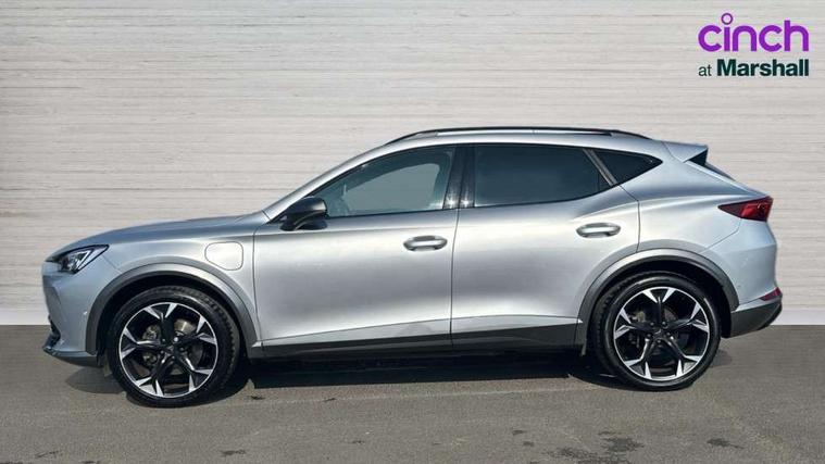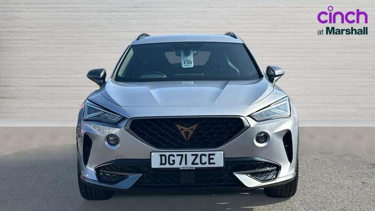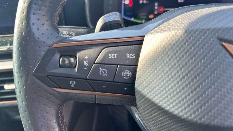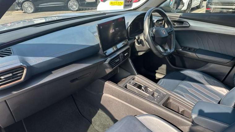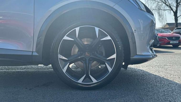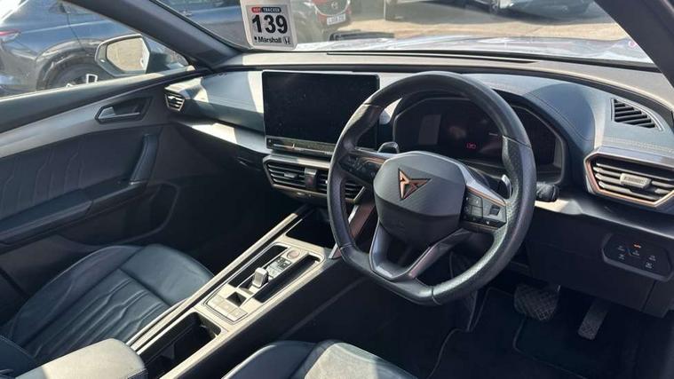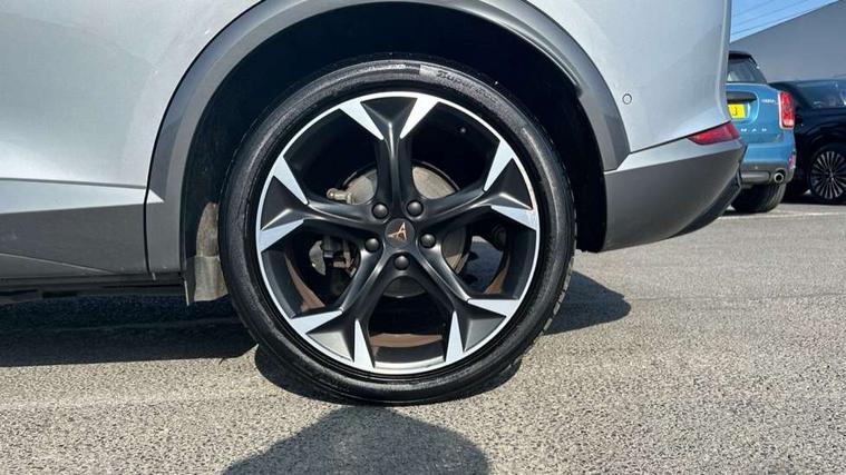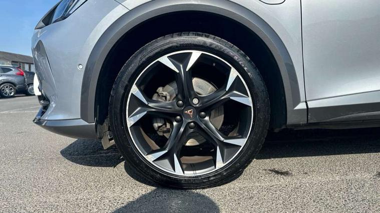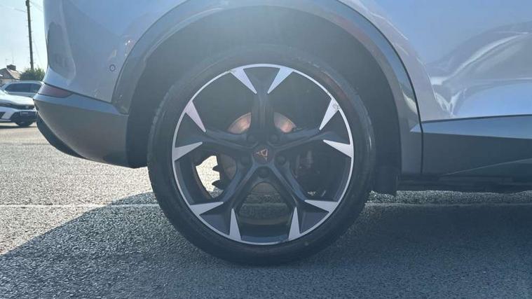 Digital cockpit and configurable dashboard, Driver alert system, Driving profile selection, Forward collision warning with automatic braking, Lane assist, Park assist (inc front/rear parking sensors), PAS, Predictive adaptive cruise control with speed limiter, Rear view camera, RPM, trip computer, outside temp gauge, instrument light brightness, low fuel warning light, lights on reminder, gearshift indicator, Service interval indicator, Start/stop system with regenerative braking, Wireless apple carplay, Wireless phone charger, 10 amp mode 2 charging cable, 16 amp mode 3 charging cable, 3.6 kw On-board charger, Electronic locking differential and dynamic traction support, Standard suspension, 2 front and 2 rear USB type C sockets, 6 speakers, DAB radio, Auto dimming rear view mirror, Body colour door handles, Body coloured bumpers, Dark grey wing mirror, Daytime running light with automatic headlight control and coming home feature, Dynamic headlight range control, Electric front/rear windows, Electrically adjustable heated and folding door mirrors with memory function, Front fog lamps with cornering function, Gloss black roof rails and window surrounds, LED Headlights, LED Taillights with dynamic indicator, Rain sensing wipers, Rear diffuser with black simulated exhaust pipes, Rear wash/wipe, Tinted rear windows, Welcome lights, 12V socket, 2 front and 2 rear reading lights, 60/40 split rear bench seat with armrest and mechanical seat release, Dust/pollen filter, Front and rear head restraints, Front centre armrest, Height/reach adjust steering wheel, Illuminated interior front door sills, Illuminated sunvisor with mirror, Isofix, Leather multi function heated steering wheel with gear shift paddles, Three zone climate control with control panel in rear, Wraparound lighting, Genuine Nappa leather Pack - Cupra, Navigation system pack - Formentor, 3 point seatbelts on all rear seats, ABS, Brake control system - ESC and brake booster, Child proof door locks, Driver and front passenger airbags with front passenger airbag de-activation, Electronic parking brake, Front and rear disc brakes, Front side curtain airbags, Hill hold control, Seat belt reminder for front and rear seats, Tyre pressure monitoring system, Anti theft alarm system, Keyless entry and start system (KESSY), Locking wheel bolts, Copper and aluminium interior detailing, 19" 'Exclusive' machined sport matte black and silver alloy wheels, Tyre repair kit,