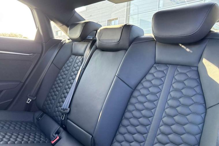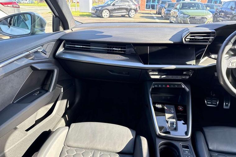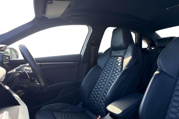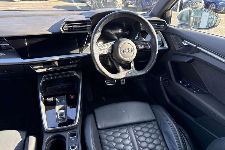 Audi smartphone interface, Audi virtual cockpit with RS specific display 12.3" full colour digital instrument cluster, Automatic start/stop system with recuperation, Bluetooth interface, Collision avoidance assistant, Emergency e-call, Lane departure warning system, Legal emergency call, Manual boot opening, Parking assist with parking system plus, Progressive power assisted steering, Quattro permanent four wheel drive, Rear suspension, Audi sound system impressive sound with 10 loudspeakers including centre speaker and subwoofer, 6-channel amplifier with a total output of 180 watts, DAB Digital radio, 3rd brake light, Acoustic glass windscreen, Audi beam uses LEDs to project the Audi sport logo onto the ground as you exit your RS 3, Auto dimming rear view mirror, Black side skirts, Body colour roof, Door mirrors - electrically adjustable, heated, folding and auto dimming on both sides, Headlight washers, LED daytime running lights, LED headlights with LED rear lights + dynamic rear indicators, Light and rain sensors, Matt aluminium door mirrors, Matt aluminium window trims, Privacy glass - dark tinted rear and rear side windows from B-pillar backwards, Rear boot, Rear side wing doors, 3 seat bench in 2nd row, 40/20/40 split folding rear seat bench, Black cloth headlining, Dual zone electronic climate control, Front and rear headrests, Front centre armrest, Front sports seats RS embossed logo, Front/rear floor mats, Heated front seats, Honeycomb stitching and RS embossing, Illuminated door sill trims inlays in aluminium with RS 3 logo, Manually adjustable front seats, RS emblems, Single front passenger seat, Stainless steel pedals and front footrest in black, Tool kit, Aluminium interior elements pack - RS3, Ambient lighting pack - RS3, MMI navigation plus with MMI touch - RS3, RS bodystyling - RS3, Storage Pack - RS3, 3x3 point rear seat belts, ABS/EBD, ASR, Audi pre sense front, Driver/Front Passenger airbags, EDL, ESC - Electronic Stability Control + traction control, Front passenger airbag deactivation, Front side airbags with head airbags and interaction airbag, Hill hold assist, Seat belt reminder with passenger presence detection in rear, Tyre pressure loss indicator, Warning triangle and first aid kit, Anti theft alarm, Anti-theft wheel bolts, Electronically operated child lock, Remote control central locking, Carbon inlays, accent surfaces in the dashboard and centre console in platinum grey silk effect paint finish, 19" 10 Y spoke platinum grey, gloss turned finish alloy wheels, Tyre repair kit,