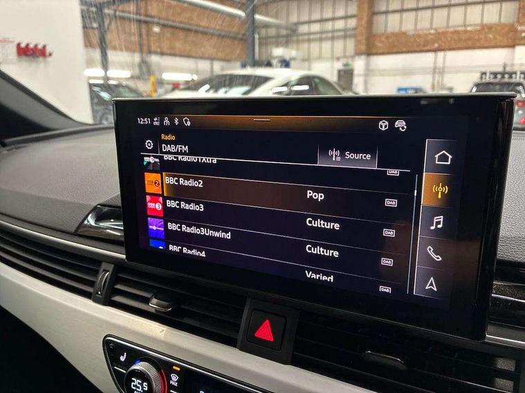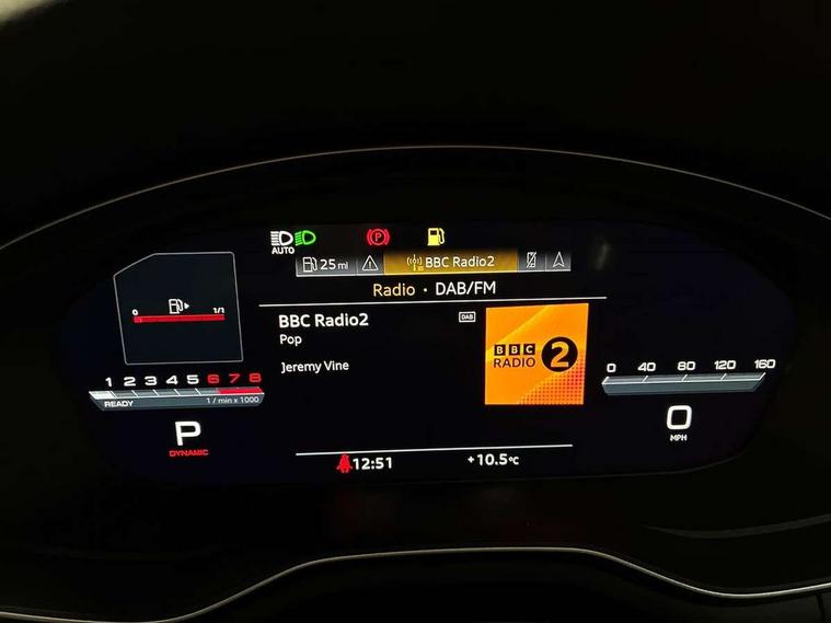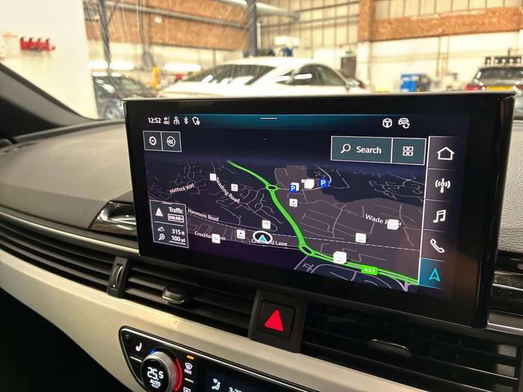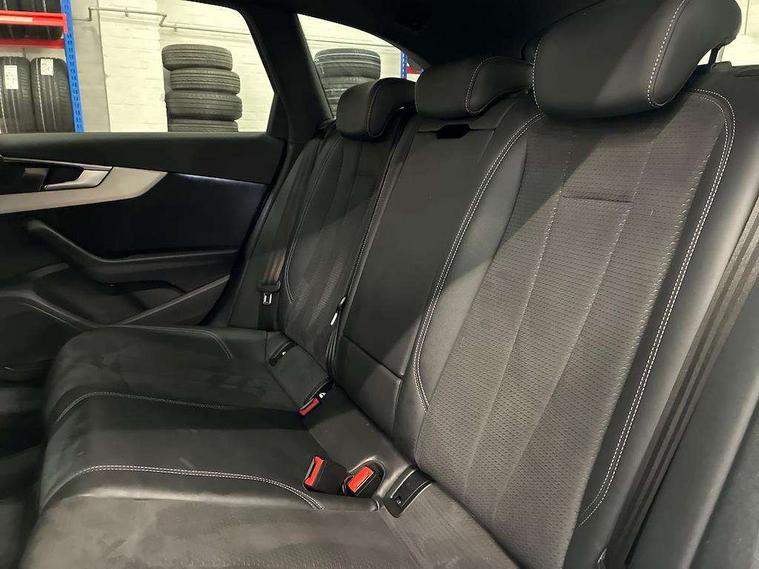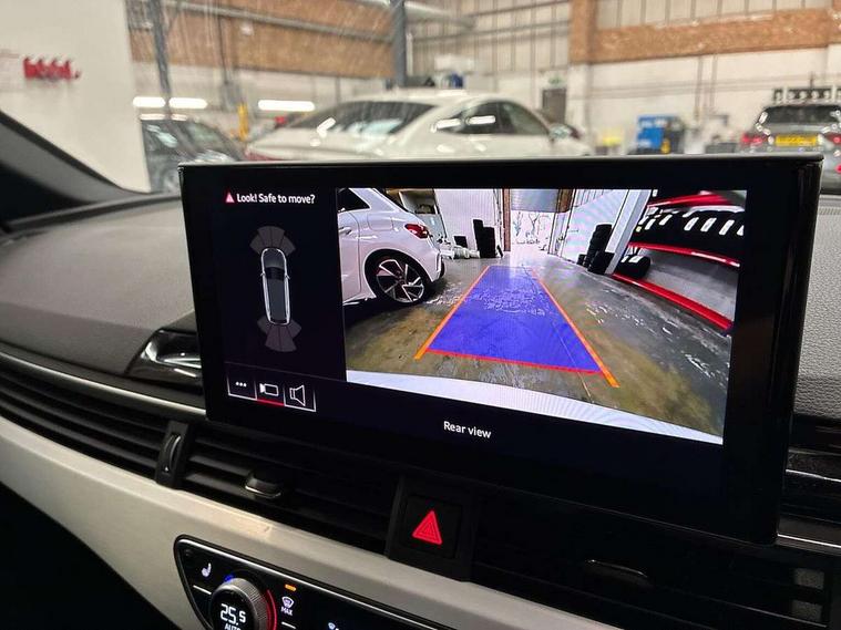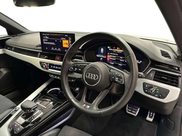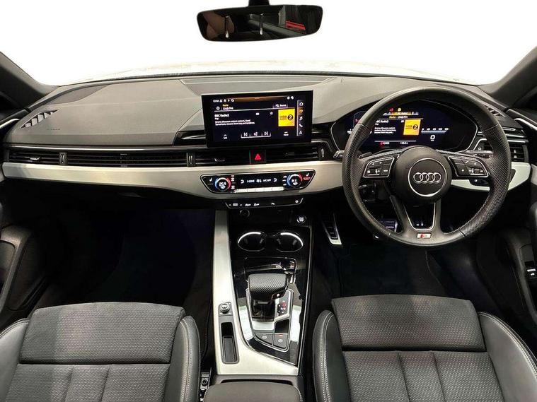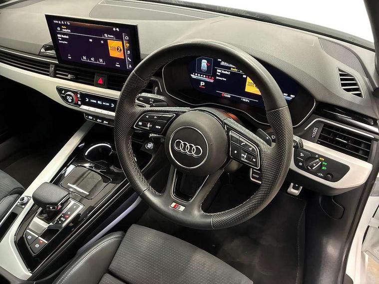 Audi connect safety and service (e-call), Audi drive select, Audi smartphone interface, Audi virtual cockpit, Automatic start-stop system with coasting functionality and efficiency programme, Bluetooth interface, Camera based traffic sign recognition, Electromechanical power steering, Email, calendar and text messages displayed via MMI, Front and rear parking sensors, Lane departure warning, MMI Navigation plus with MMI touch includes 10.1" high resolution colour MMI display, 3D map, Power operated tailgate, Rear view camera, Voice control system, 54 litre fuel tank, Sports suspension lowered by 23mm, 2 USB charging ports, 8 passive loudspeakers, DAB digital radio reception, Aluminium roof rails, Auto dimming rear view mirror, Body colour door handles, Body colour front spoiler lip, Body colour side sill trim, Body coloured door mirrors, Electric adjustable/heated/folding door mirrors with auto dimming, Grained matt black side air inlets with matt aluminium silver inlay, High beam assistant, Honeycomb structure radiator grille in grained matt black, LED headlights with LED rear lights + dynamic rear indicators + headlight adjustment and high beam, turning light + LED daytime running lights, LED third brake light, Matt aluminium silver tailpipe trim, Privacy glass, Rain and light sensors, Rear side wing doors, Rear wiper, S Line badges on the front wings, S line front and rear bumpers with side skirts, S Line rear diffuser in matt anthracite black with trim strip in matt aluminium silver, S Line roof edge spoiler, Variable intermittent front wash/wipe, Windscreen with acoustic glazing, 3 spoke high multi-function sports leather steering wheel grips in perforated leather with S badging including paddle shift, 4 way electric lumbar support for driver and front passenger, 40/20/40 split folding 3 rear seat bench in 3 parts with rear centre armrest, Black carpets, Black cloth headlining, Black perforated leather gearknob, Contrast stitching on seats, steering wheel and gear lever gaiter, Deluxe 3 zone electronic climate control, Electric load area cover, Front and rear head restraints, Front centre armrest, Heated front seats, Illuminated door sill trims with S logo, ISOFIX child seat mounting and top tether, Manual seat adjustment, Single front passenger seat, Stainless steel pedals and foot rest, High gloss package - A4, LED Interior light pack - A4/S4, 3 rear seatbelts, 6 airbags - Driver, front passenger, curtain and side windows, Attention and drowsiness assist, Electronic Stabilisation Control (ESC) including ABS, ASR and EDL, Hill hold assist, Multi collision brake assist, Pop-up bonnet for pedestrian protection, Pre sense city, Rear door child safety locks, Seatbelt monitoring, Warning triangle and first aid kit, Anti theft alarm, Anti theft wheel bolts, Central locking, Keyless Go, Matt brushed aluminium inlays, Tool kit, Tyre repair kit,