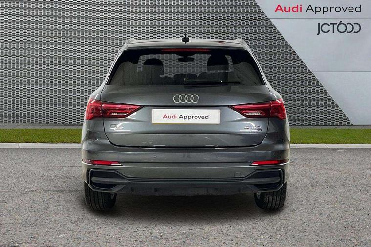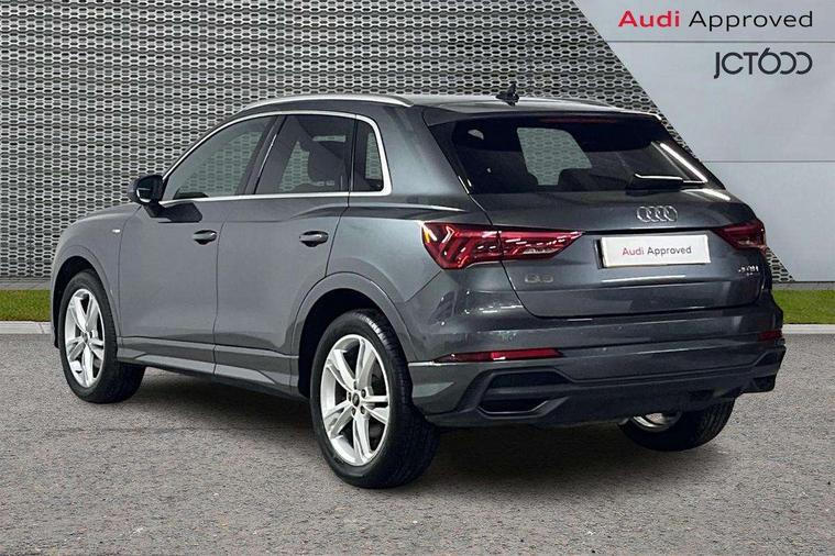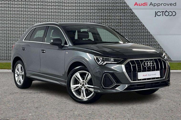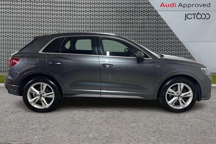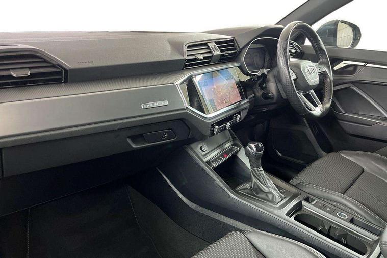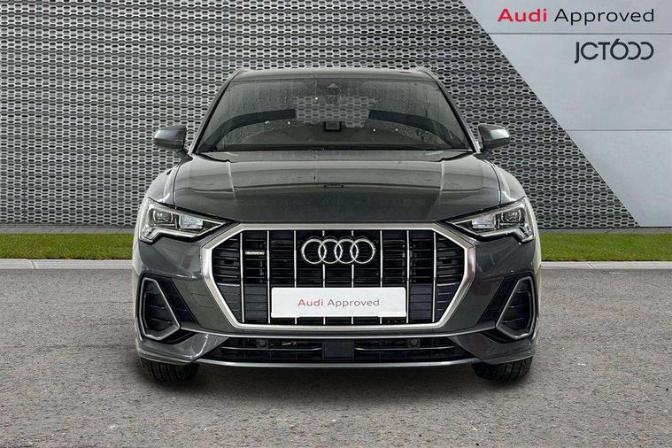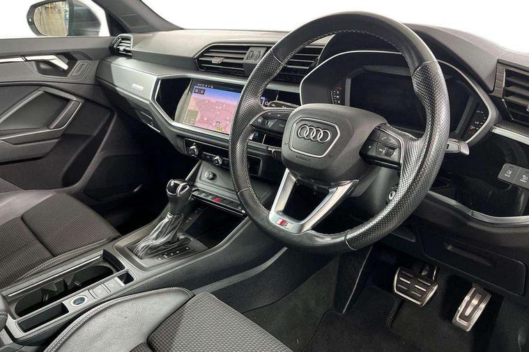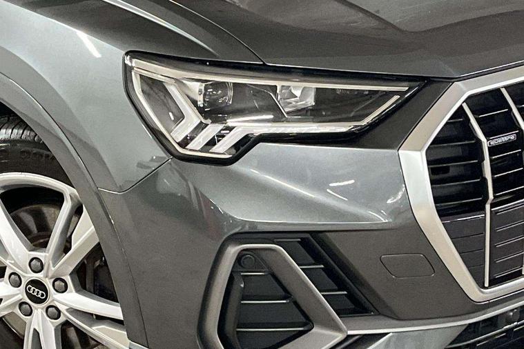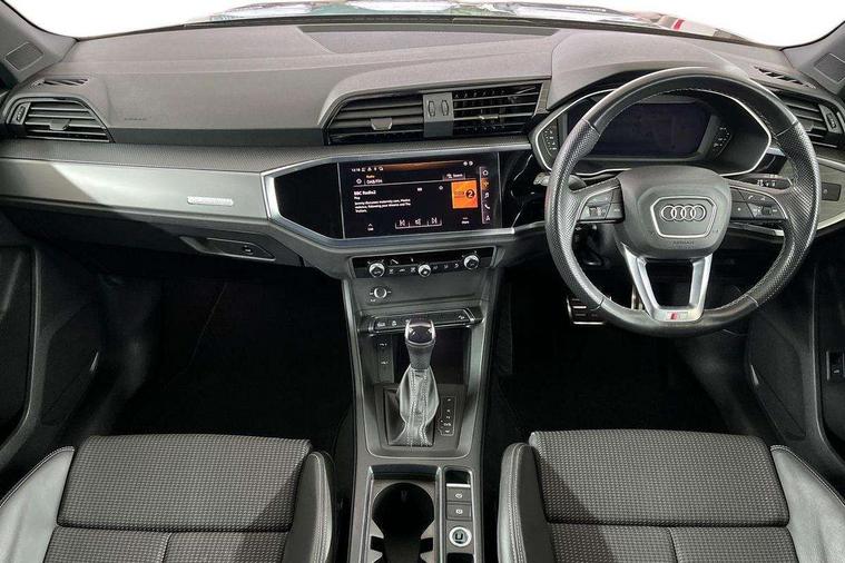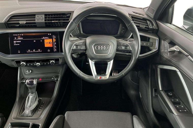 Amazon alexa Integration, Audi drive select, Audi lane departure warning, Audi smartphone interface includes wireless Apple carplay/Android Auto, Audi Virtual Cockpit - 10.25" display, Bluetooth interface, Camera based traffic sign recognition, Legal emergency call, MMI Navigation Plus with high resolution 10.1 inch touchscreen colour display, Power operated tailgate, Progressive steering, Service interval indicator, Start stop system with recuperation, Voice control system with natural language interaction, Diesel particulate filter, Sports suspension, 2 USB-C ports with charge and data functions, 6 passive loudspeakers, DAB digital radio module, Acoustic windscreen, Aluminium roof rails, Aluminium window trim, Anthracite black radiator grille, Auto dimming frameless rear view mirror, Body colour front spoiler blade, Body coloured bumpers, Electrically folding, adjustable and heated door mirrors with integrated LED side indicators and kerb view function for passenger side, Front and rear electric windows, Front fog lights, Front side air inlets in matt platinum grey, Grille vertical bars in aluminium silver/Matt, High gloss black finish B and C pillars, LED Dynamic rear indicators, LED headlights with LED daytime running lights, LED rear lights, LED third brake light, Privacy glass dark tinted rear and rear-side windows (from B-pillar backwards), Rain and light sensors, Rear diffuser grille in grained matt black, Rear diffuser strip in matt anthracite black, Rear side wing doors, Rear wiper, S line badges on front wings, S Line front and rear bumpers, Side skirt insert in matt Platinium grey, Variable front intermittent wipers, 12V socket in rear centre console, 3 seat bench in 2nd row, 3 spoke leather multifunction steering wheel features S badging and grips in perforated leather with contrast stitching, 40:20:40 folding with manual adjustment for 60:40 forwards/backwards position and backrest angle, Adjustable rear seat bench/backrest with centre armrest and cupholder, Black cloth headlining, Dual zone electronic climate control, Front and rear black floor mats with contrast stitching in rock grey, Front and rear headrests, Front and rear roof module including reading lights, Front centre armrest, Glove compartment lighting, Height and reach adjustable steering wheel, Illuminated door sill trims with S logo, ISOFIX child seat mounting for front passenger with airbag deactivation and outer rear seat including top tether attachment point for outer rear seats, Luggage compartment light, Manual front seats with height adjustment, Perforated leather gearknob, Single front passenger seat, Stainless steel luggage compartment sill finisher, Stainless steel pedals, Ambient lighting pack - Q3, Non smoking pack - Q3, 3x3 point rear seatbelts, 6 airbags - Driver, front passenger, curtain and side windows, Audi pre-sense front with pedestrain and cyclist recognition, Electrically operated child locks on rear doors, Electromechanical parking brake, Electronic stabilisation control including ABS, ASR and EDL, Front seatbelt reminder, Hill descent control, Hill hold assist, Pre sense basic, Seatbelt monitoring, Tyre pressure warning, Warning triangle and first aid kit, Anti theft alarm, Anti theft wheel bolts, Immobiliser, Remote central locking, Aluminium look interior elements, Dark matt brushed aluminium inlay, Detail dashboard around MMI touch colour display in glass look, black with surround in aluminium look, Leatherette door armrest,