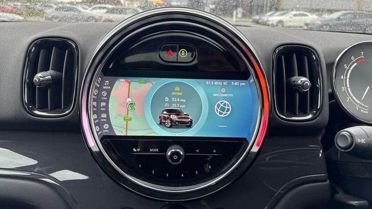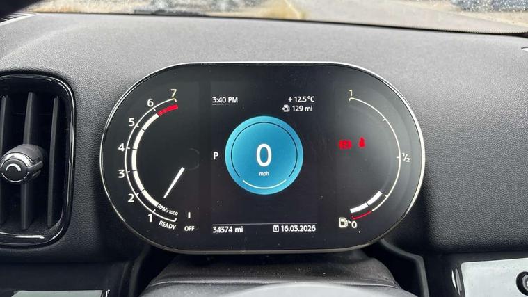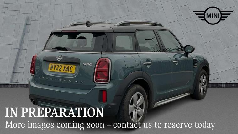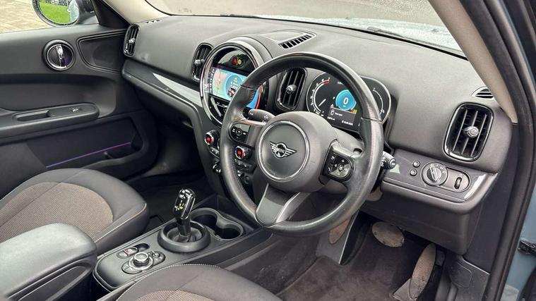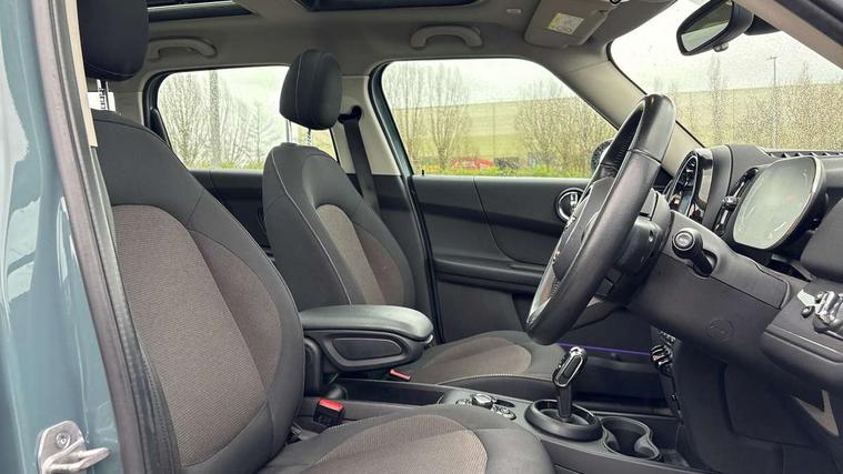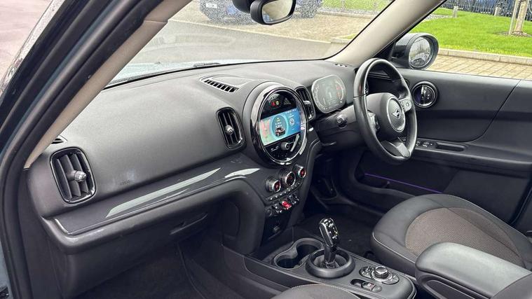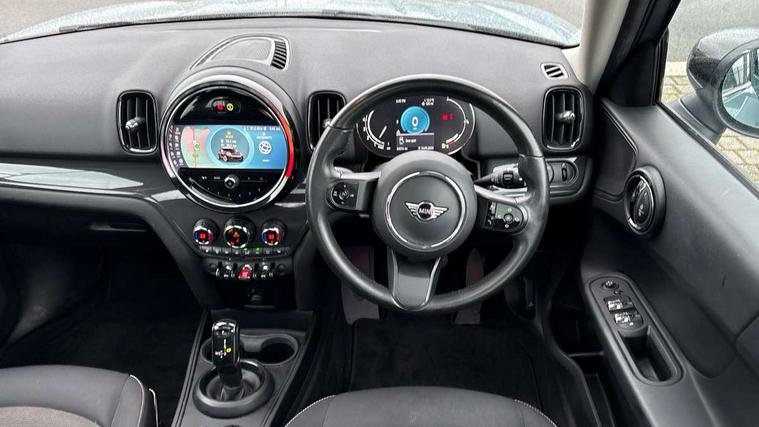 Active Guard incl speed limiting and lane departure functions with auto steering, and front collision warning with brake intervention, Automatic start/stop function with brake energy recuperation, Compatible mobile phone bluetooth with audio streaming, Cruise control with brake assist, Electro-mechanical speed dependant steering assistance, Instrument cluster, Mini E-call, On board computer, Rear parking distance control, 51 Litre fuel tank, Automatic transmission, Double Vanos system, Fully variable valve control, High precision injection, Performance Control, FM tuner and DAB digital radio, 3rd brake light, Body colour fuel filler cap, Day time driving lights, Door sill strips, Dynamic brake lights, Electric windows, Heated rear window, Heated windscreen washer jets, LED fog lights, LED Headlights, Left exhaust tailpipe with chrome finisher, Model logo, Model logo on Tailgate, Radiator grille, Rain sensor with auto headlights, Rear fog lights, Rear side wing doors, Rear window wiper, Side scuttle panel with integrated indicator, Split rear doors, Sun/heat protection glass, White indicator lenses, 12V socket in centre console, 3 seat bench in 2nd row, 3 spoke sport leather steering wheel + limiter function and audio controls, 360L luggage compartment capacity, 4 lashing eyes in luggage compartment, 40:20:40 split folding rear seats, Chrome interior highlights, Colour line - Carbon black, Cupholders, English handbook, Floor mats, Front headrests, Glove compartment, Headliner with grab handles and clothes hooks, Height and length steering column adjustment, Interior lighting with 12 basic colours selectable via toggle switch in roof, Isofix rear child seat preparation, Leather gearshift lever and handbrake gaiters, LED reading lights, vanity mirror lights, front foot well light and spotlight on front seats, Manual air conditioning, Mechanical seat adjustment, driver seat height adjust, forward/back and front seats backrest, Multifunction steering wheel, Passenger seat height adjuster, Rear headrests, Single front passenger seat, Storage compartments in doors, Sunvisors with vanity mirrors, Excitement pack - Countryman, Navigation pack - Countryman, 2 tone horn, 3 point seatbelts on all seats, 6 Airbags - front, side, head and seat belt tensioners, Anti-lock braking system (ABS), DSC - Dynamic Stability Control, Electronic handbrake, Front and rear disc brakes, Hill start assist, Manual rear child locks, Tyre pressure monitoring system, Alarm system with tilt sensor, monitoring doors, bonnet interior and tailgate, Auto drive away locking, Deadlocking function, Electronic vehicle immobiliser, Locking wheel bolts, Start/stop toggle with keyless go, Tool kit,