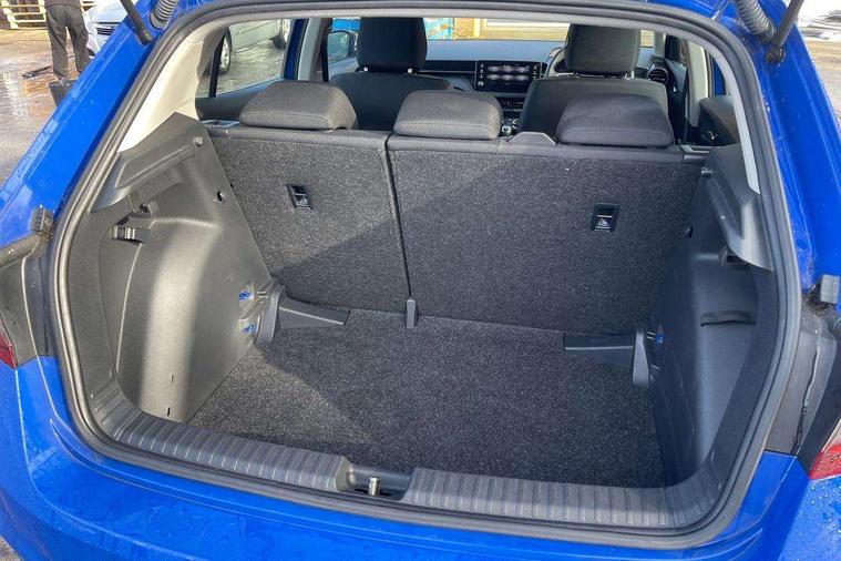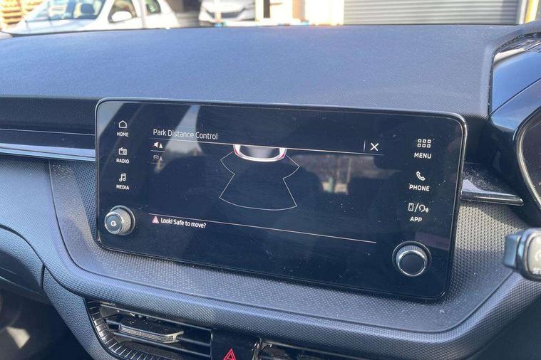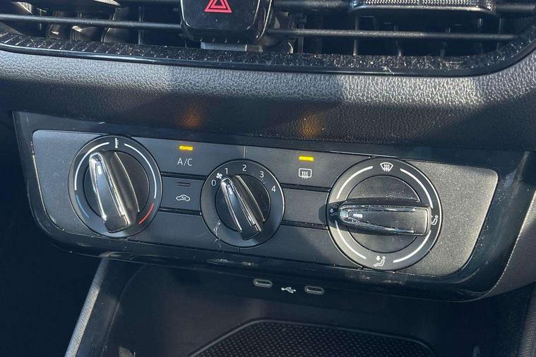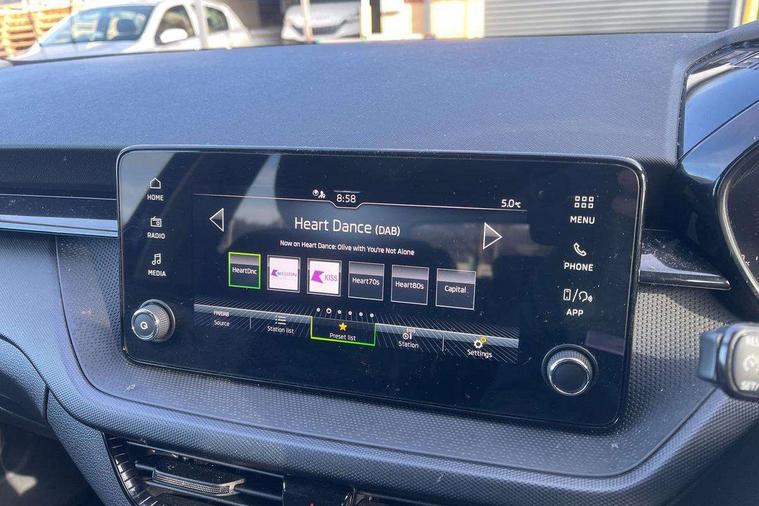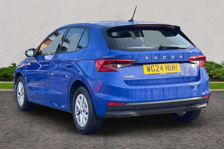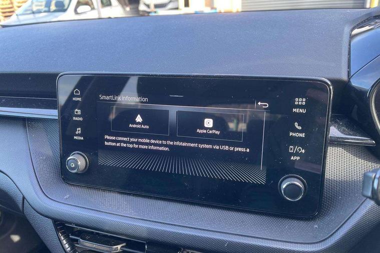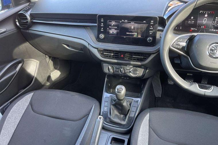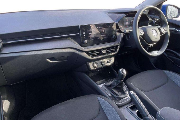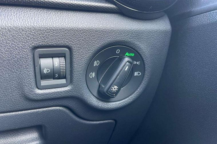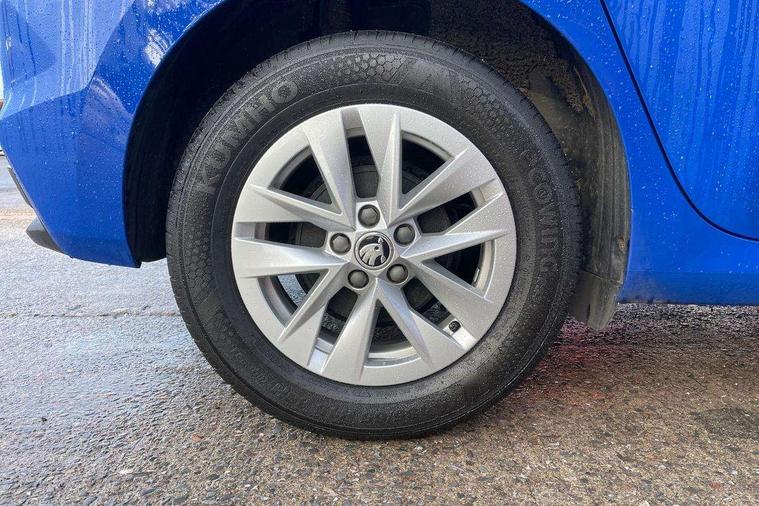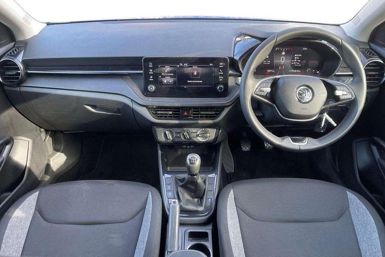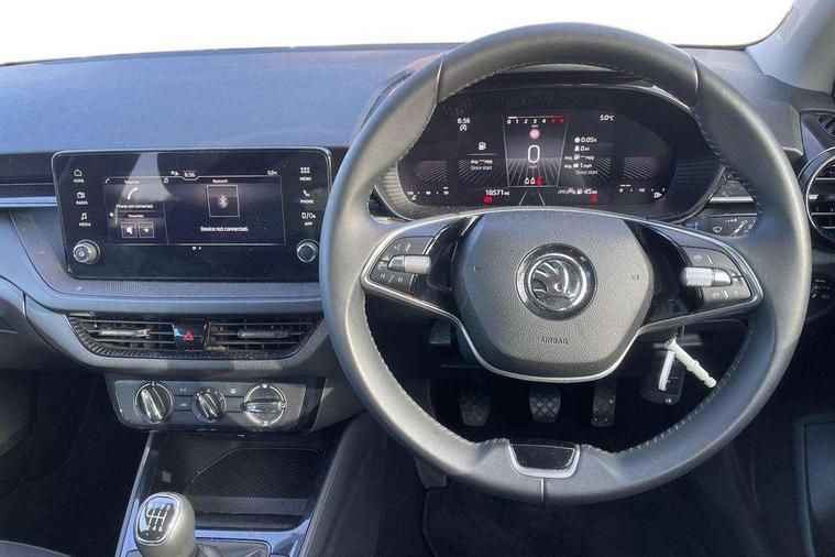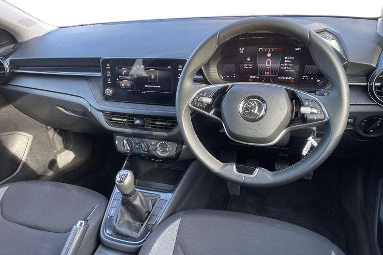 8" Digital instrument display, Advanced driver attention and drowsiness monitor, Bluetooth connection, Electromechanical power steering, Exterior temperature gauge, Lane assist including road edge detection, Rear parking sensors, Service interval indicator, Speed limiter, Traffic sign recognition, Wireless SmartLink for Apple CarPlay and Android Auto, 2x USB-C in the front (for data transmission and charging), 6 speakers (4 speakers/2 tweeters), 8.25" Skoda infotainment touchscreen display, Auxiliary socket for external MP3 player, DAB digital radio reception, Basic LED Headlights, Basic rear lights, Body colour door mirrors, Body coloured bumpers, Dimming rear view mirror with black frame, Door mirror integrated indicators, Electrically adjustable and heated door mirrors, Electrically adjustable front windows with function auto up/down, Front fog lights, Front window wiper intermittent control, Headlight range control - Automatic, Ice scraper in fuel cap, LED daytime running lights with coming and leaving home feature, Mechanical adjustable rear windows, Rain sensor, Rear LED fog light, Rear side wing doors, Rear window wiper with washing nozzles, Roof mounted spoiler, SKODA tailgate lettering in chrome, Third brake light, 2 reading lights in front and 2 reading lights in rear, 2 spoke leather multifunction steering wheel, 3 rear headrests, Backrest split and folding, Central console with removable cup holder and storage box, Chrome handbrake release button, Fabric upholstery, Front centre armrest, Gearshift knob/handle in leather, Grain satin black interior door handles, Hand brake lever handle in leather, Height adjustable driver seat, Height adjustable front headrests, Height adjustable steering wheel, ISOFIX and TopTether anchorage points to the outer rear seats, ISOFIX and TopTether on the front passenger seat, Luggage compartment lighting, Manual air conditioning, Pollen filter, Rear seat bench unsplit, Single front passenger seat, Storm grey headlining, Sun visors with mirror and airbag label on passenger side, Textile floor mats, Ticket holder, 3-point height adjustable front seats belts with pretensioner and force limiter, Automatic warning lights in case of crash, Driver and passengers airbag with switch off function, e-Call+, ESC including ABS, MSR, ASR, EDS, HBA and XDS, Front and rear seat belt warning, FRONT ASSIST (AEB City and AEB Inter Urban), Front side airbags, Head airbags, One tone horn, Pedestrian protection, Three rear 3-points safety seat belts with pretensioner and force limiter including stop function for outer rear seat belts, Tyre pressure monitoring system, Anti-theft alarm system including immobiliser, interior monitoring, backup horn, and towing protection, Central locking with radio remote control, interior controls, SAFE function and 2 foldable keys, Black painted air vents, Glossy black decorative trim, Grain satin black central console cover, Grain satin black lower decorative trim, Satin black door and side trim panel in front, Anti-theft wheel bolts protection, Super-low rolling resistance tyres,