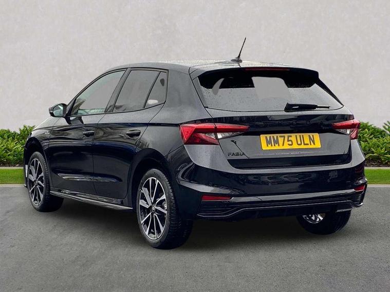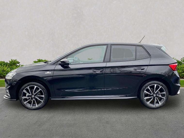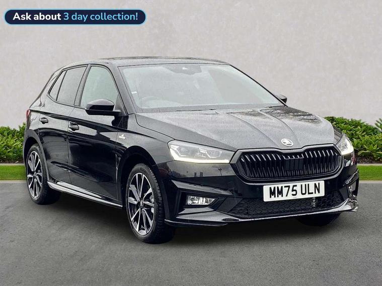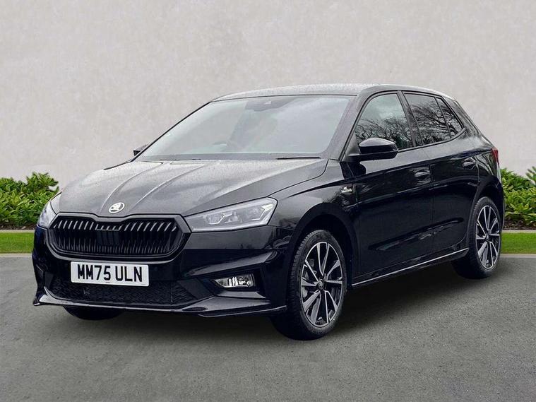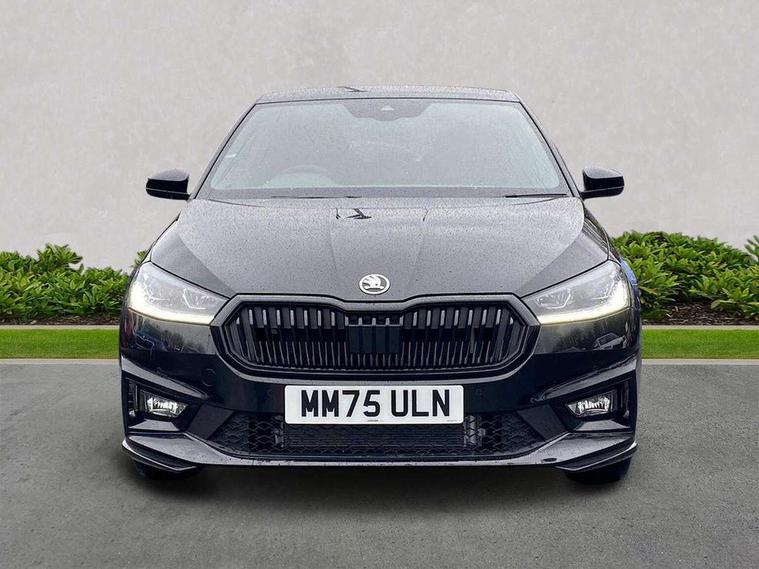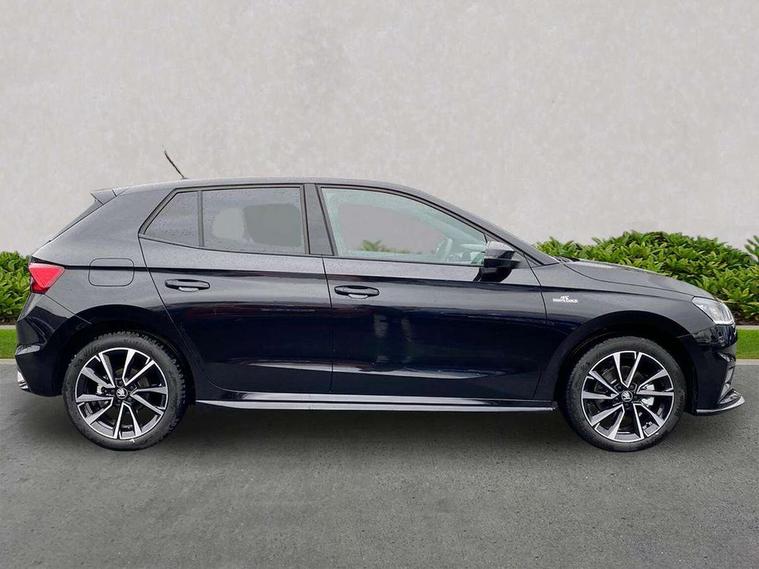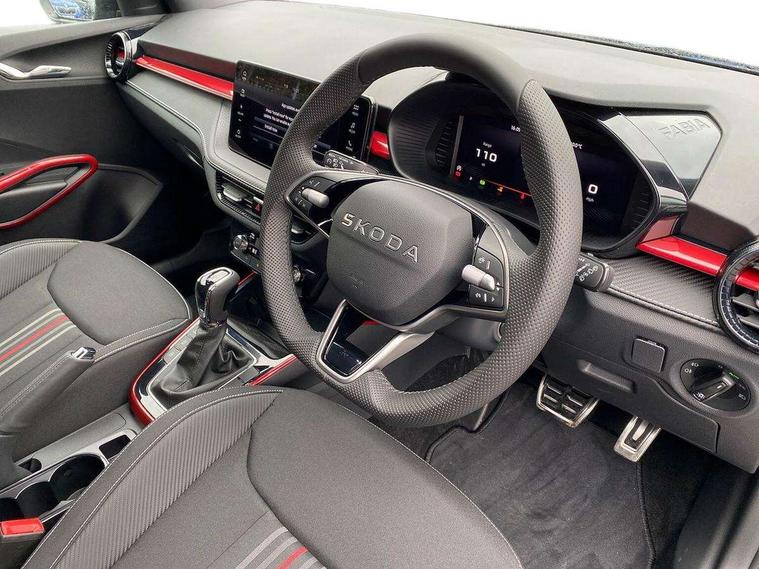 Advanced driver attention and drowsiness monitor, Bluetooth connection, Driver alert system, Electromechanical power steering, Exterior temperature gauge, Service interval indicator, Traffic sign recognition, Virtual cockpit with 10.25" colour display, Wireless SmartLink for Apple CarPlay and Android Auto, 6 Speakers (4 in front and 2 in rear), 9.2" colour display skoda navigation system with voice control and web radio, Auxiliary socket for external MP3 player, DAB digital radio reception, Auto dimming rear view mirror, Black radiator grille, Body coloured bumpers, Chrome window surround, Door mirror integrated indicators, Dynamic headlight range control, Front and rear electric windows, Front window wiper intermittent control, Ice scraper in fuel cap, LED 3rd brake light, LED daytime running lights with coming and leaving home feature, LED rear lights, Monte Carlo badging, Privacy glass, Rear LED fog light, Rear side wing doors, Rear window wiper with washing nozzles, Roof mounted spoiler, SKODA tailgate lettering in black, Sports bumpers, Unique dark chrome design logo on alloy wheels, 2 LED reading lights in front and rear, 3 rear headrests, Aluminium pedals, Backrest split and folding, Black headlining, Central console with fixed cup holder and storage box, Chrome handbrake release button, Door sills with fabia badging, Dual zone air conditioning with climatronic electronic control, Fabric/artificial leather upholstery, Front centre armrest, Front sports seats, Gearshift knob/handle in leather, Hand brake lever handle in leather, Height adjustable front headrests, Height adjustable front seats, Height adjustable steering wheel, ISOFIX and TopTether anchorage points to the outer rear seats, ISOFIX and TopTether on the front passenger seat, Luggage compartment lighting, Manually adjustable lumbar support in front seats, Metallic red interior door handles, Pollen filter, Rear seat bench unsplit, Single front passenger seat, Skoda lettering on steering wheel, Sun visors with mirror and airbag label on passenger side, Textile floor mats, Ticket holder, Umbrella in drivers door, Ambient lighting pack - Fabia Hatchback, Convenience pack - Fabia, Light and view pack plus - Fabia, 3-point height adjustable front seats belts with pretensioner and force limiter, Automatic warning lights in case of crash, Driver and passengers airbag with switch off function, e-Call+, ESC including ABS, MSR, ASR, EDS, HBA and XDS, Front and rear seat belt warning, FRONT ASSIST (AEB City and AEB Inter Urban), Front side airbags, Head airbags, Hill hold control, One tone horn, Pedestrian protection, Three rear 3-points safety seat belts with pretensioner and force limiter including stop function for outer rear seat belts, Tyre pressure monitoring system, Anti-theft alarm system including immobiliser, interior monitoring, backup horn, and towing protection, Central locking with radio remote control, interior controls, SAFE function and 2 foldable keys, Carbon effect door and side trim panels, Carbon effect lower decorative trim with white stitching, Grain satin black central console cover, Monte carlo air vents, Red metallic upper decorative trim, Anti-theft wheel bolts protection, Super-low rolling resistance tyres,