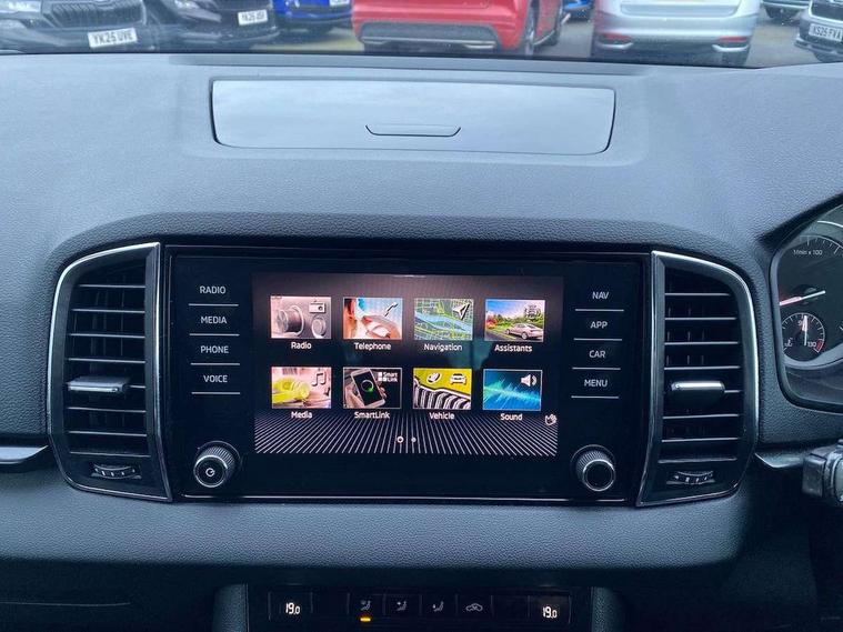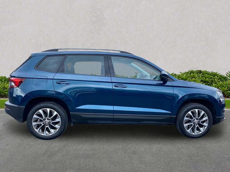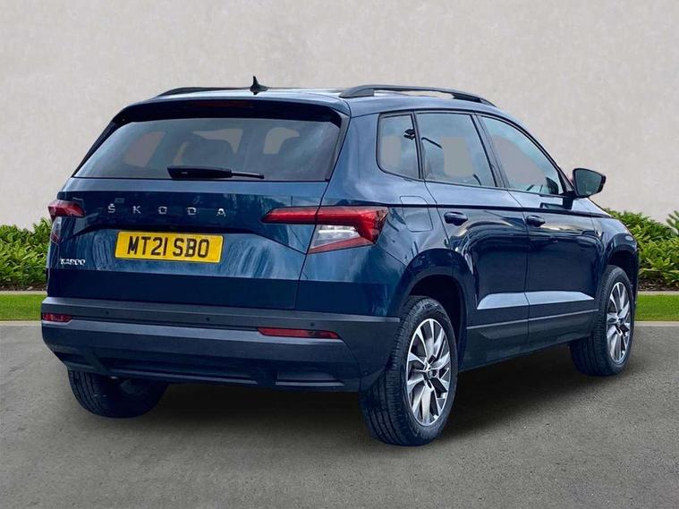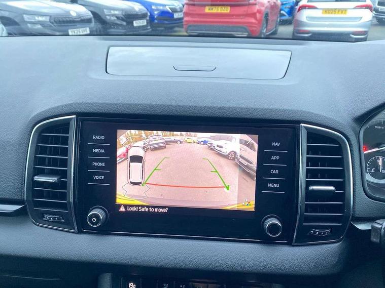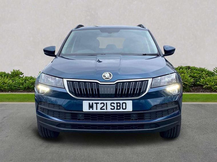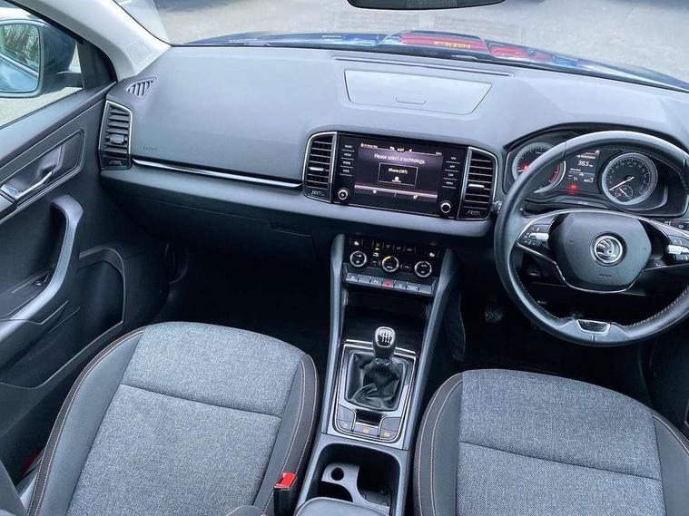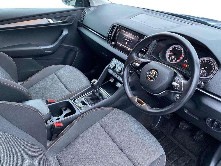 Chrome framed air vents, Storage on wheel cover, Alarm with interior monitoring, back up horn and tilt sensor with safe function, Electronic engine immobiliser, Remote central locking with 2 remote folding keys, DAB radio with Bluetooth, USB connection, Airbags - Front side, head, knee and curtain, Automatic door unlocking in case of crash, Automatic fuel cut off in case of crash, Driver airbag, Electronic parking brake with auto hold function, Emergency rear braking signal, ESC including ABS, MSR, ASR, EDS, HBA, DSR, RBS, MKB and traction control, Front assist radar scanning of the space in front of the car with automatic braking, Hill hold control, Passenger airbag with switch-off function, Pedestrian monitor, Three point seatbelts rear, Two tone horn, Tyre pressure display, Tyre pressure monitor, Acoustic glass, Aero front windscreen wipers with intermittent function, Automatic headlight control system, Black electric window control buttons, Body colour door mirrors and handles, Body coloured bumpers, Doors steps in front with Karoq badging, Electric front and rear windows with child proof lock, Electrically adjustable heated folding and auto dimming door mirrors, Heated rear windscreen, LED rear lights with high functionality, Light assistant (coming/leaving home/tunnel light), Privacy glass, Safety reflectors on front doors, Third brake light, 1.5 litre bottle holders in driver and front passenger door panels, 12V socket in boot, 12v socket in front centre armrest with storage compartment and rear air vents, 2 Folding hooks and nets in boot, 2 Front readings lights for driver and passenger, 3 rear height adjustable headrests, 4 foldable roof handles with rear coat hooks, 4 lashing points on luggage floor, Backrest release, Cargo elements in boot, Chrome inner door handles, Door sill scuff plates, Driver and passenger seats height adjust, Fabric upholstery, Folding tables on the front seat backrests, Front head restraints, Front seat and rear pockets, Height adjustable front three point seats belts with tensioners, Height/reach adjust steering wheel, Ice scraper, Illuminated and cooled glovebox, Illuminated luggage compartment, Isofix child seat preparation outer rear, Manual lumbar support for front seats, Net programme in boot, Pen holder, Pollen filter, Rear boot cover, Rear reading lights, Rear seats fixed folding and divided 60:40, Safety vest holder, Seatbelt reminder signalisation and pretensioner for all seats, Stars graphite decorative inserts, Storage box in upper central dashboard closed, Sunvisors with illuminated vanity mirrors, Textile floor mats, Umbrella under passenger seat, Amundsen satellite navigation with 8" touchscreen display with maps Europe, WLAN and web radio, Care connect, Driver fatigue sensor, Electro-mechanical PAS, Multifunction colour trip computer, Outside temperature gauge, Rear view camera, Service interval indicator, SmartLink wireless for Apple and wired for Android, Start/stop system with regenerative braking, USB C Port x 2 in front centre console,